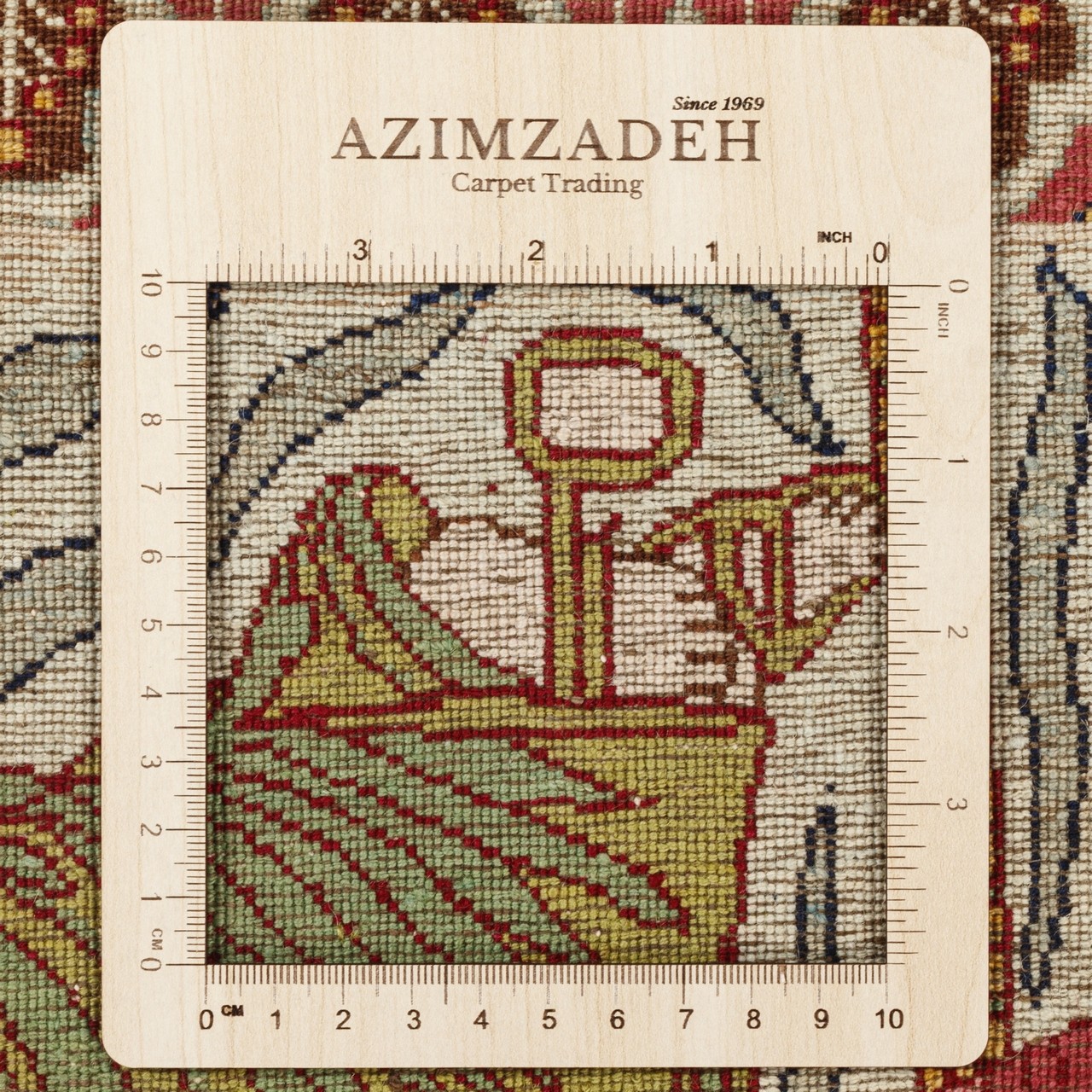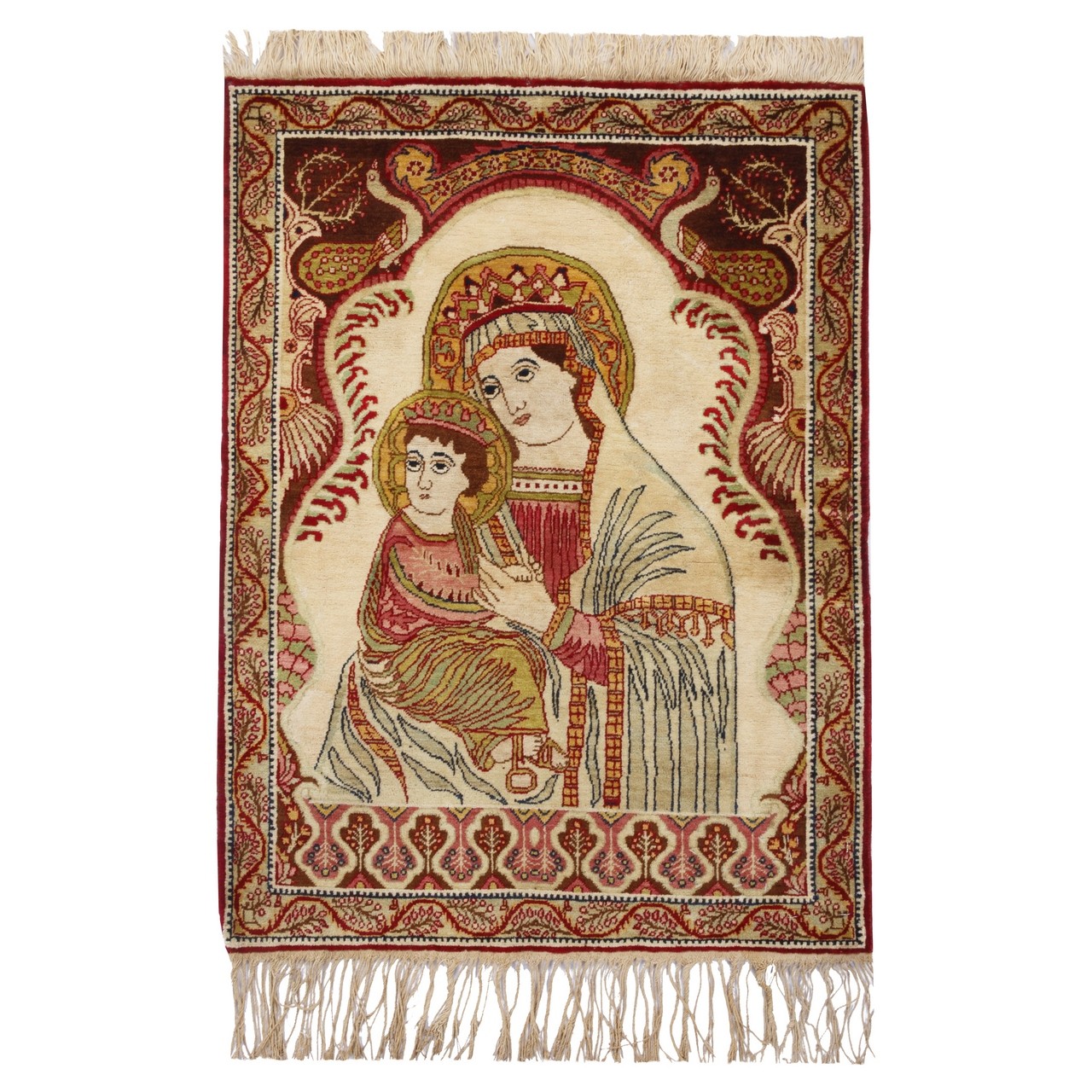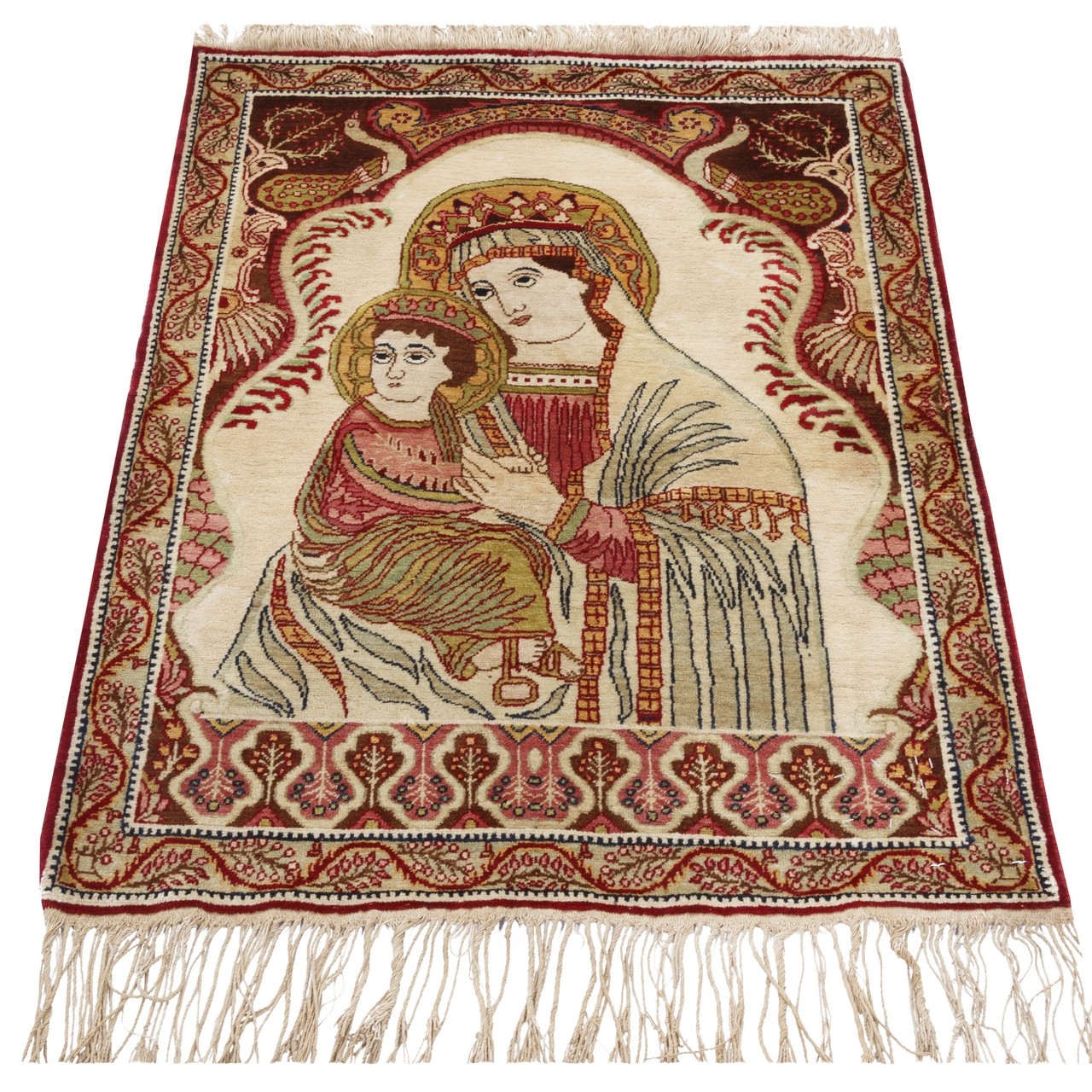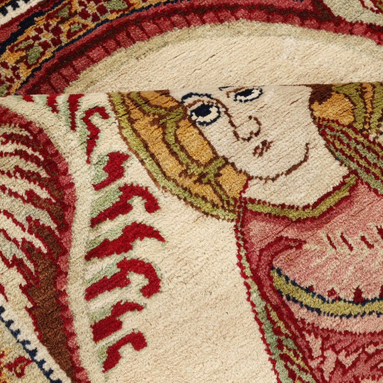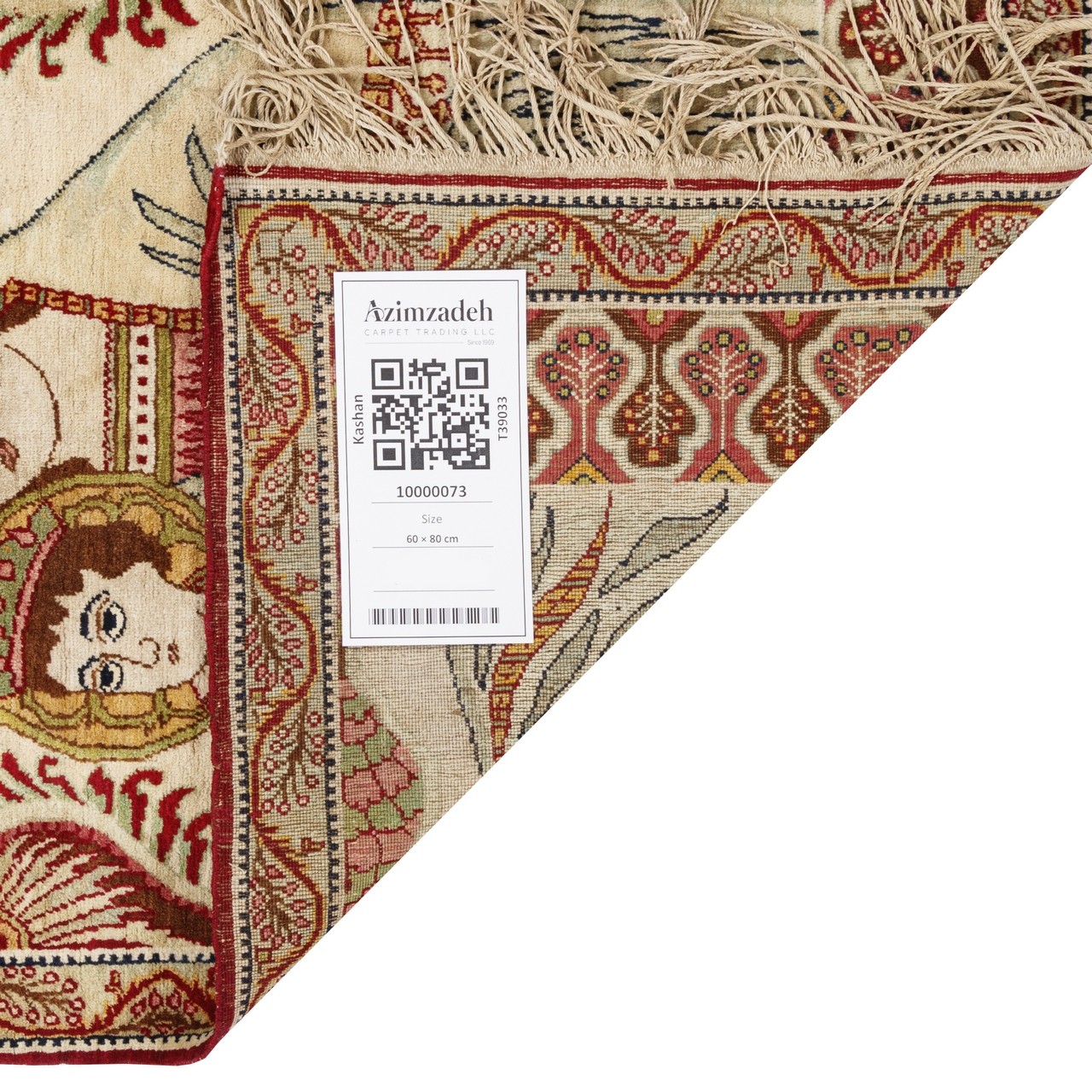 هذه السجادة اليدوية من كاشان ذات تصميم ممتد ونقوش تصويرية هي عمل نادر ورقيق، نُسجت من صوف على سدى قطني لتروي، بلغة فنية متقنة، مشهداً مستلهماً من السرديات الروحية المسيحية. وبأبعاد 60 × 80 سم (2'0" × 2'7") ومساحة 0.48 م² (5.17 قدم²)، فهي من فئة السجاد التصويري الصغير—قطعة بحجم لوحة فنية مناسبة للتعليق على الجدار أو العرض في ركن خاص من المنزل أو المعرض. في قلب السجادة يظهر تصوير «السيد المسيح ومريم المقدّسة»، لا كإعلان إيمان فحسب، بل كإطلالة عميقة على الإنسان والإيمان والطمأنينة. هذا التكوين المميّز يدل على فهم النسّاج لقوة الصورة في إيصال المعنى—حكاية عن النور والرفق مزدانة برهافة إيرانية. تبلغ كثافة النسج نحو 5,100 عُقد/دسم²، وهي رهافة لافتة لسجادة صوفية تتيح تجسيد الوجوه والتعابير والتفاصيل التصويرية بدقة. أرضية بلون كريمي مع حاشية بلون ترابي تمنح تناغماً وهدوءاً بصرياً كاملاً، لتضع المشهد المقدّس في إطار دافئ وأرضي. هذه السجادة الكاشانية أكثر من مجرد منسوجة قديمة؛ إنها جسر بين الثقافات والطقوس ونظرة الإنسان إلى الروحانية.