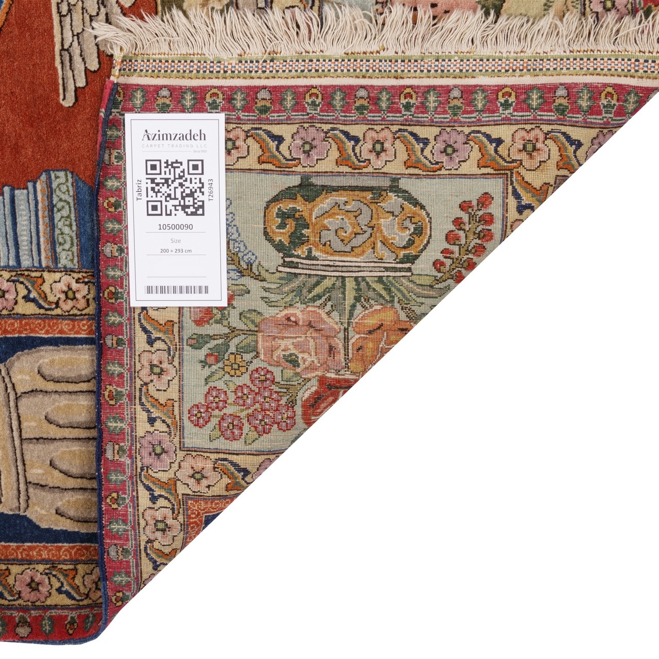 سجادة تبريز يدوية قديمة بتصميم ممتد ذي طابع تصويري، كأنها تحفظ ذكريات الزمن وتنطق بتاريخ وثقافة إيران. أبعادها 200 × 293 سم (6'7" × 9'7") وبمساحة 5.86 م² (63.08 قدم²)، تتفتح كلوحة واسعة تُجسّد الحياة والإحساس والحكاية على وبر صوفي فوق سدى من القطن. وبنعومة تقارب 4100 عُقَد/دسم²، تجمع البنية بين وضوح العناصر التصويرية وملمس المواد المتقن. حقل بلون نحاسي دافئ متوهّج يقابله إطار كحلي كلاسيكي مهيب، ليُنشئ توازناً بصرياً لافتاً بين التضاد والانسجام. هذا التكوين التصويري ليس مجرد تزيين؛ بل يحمل حمولة سردية تدعو المتلقي إلى التأمل، كأن حكاية خفيّة تنكشف بهدوء داخل النسيج.