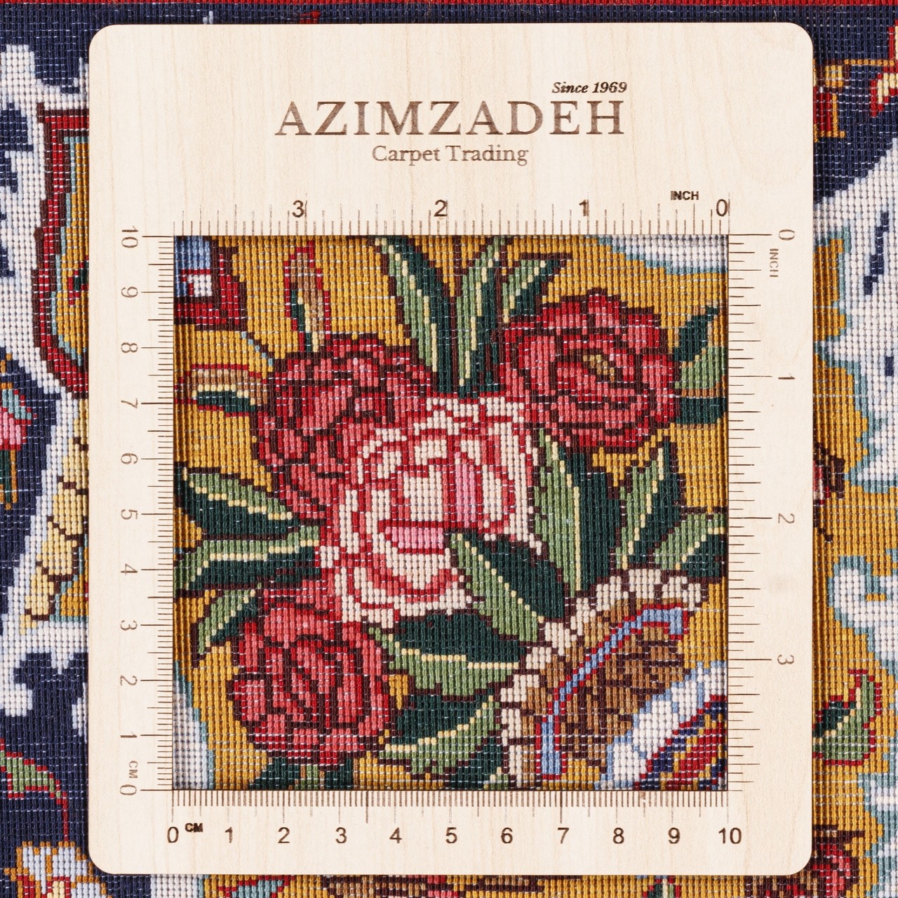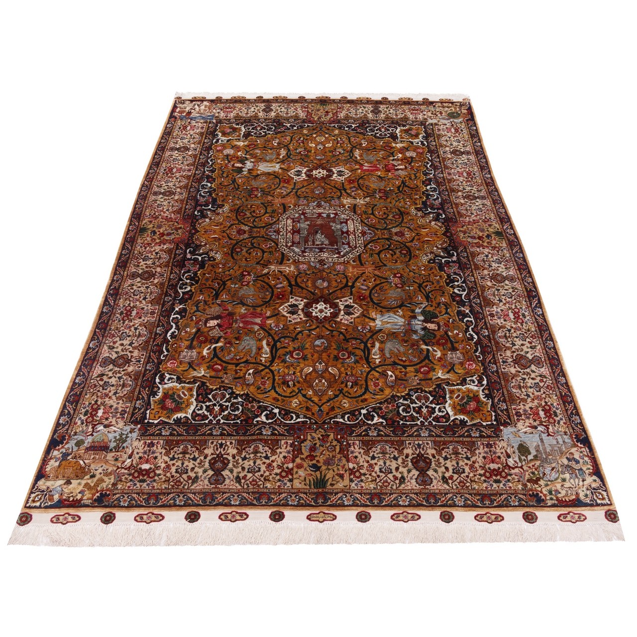 هذه سجادة تبريز يدوية العقد من حرير بالكامل، من علامة أحمد كَلَم‌فروش، تجمع بين مدالية مع أركان وتصميماً تصويرياً مميزاً من «نقشة الملائكة»، في تناغم لافت بين البنية الكلاسيكية والصورة. أبعادها 200 × 288 سم (6'7" × 9'5") ومساحتها 5.76 م² (62.00 ft²)، ما يجعلها قطعة مناسبة للصالات والمعارض والمجموعات الفنية المنتقاة. وتدل كثافة العقد، بحوالي 7,300 عُقَد/دسم²، على دقة عالية ومهارة متقنة في التنفيذ. الخامة الحريرية في كل عقدة تمنح السجادة سطحاً لامعاً وناعماً ونابضاً، يتجاوب مع الضوء برِقّة وأناقة. أرضية بلون ذهبي مع إطار رمادي تُحقق توازناً بين النور والسكينة، فتجسّد حضوراً سماوياً رفيعاً ضمن إطار كلاسيكي راسخ.