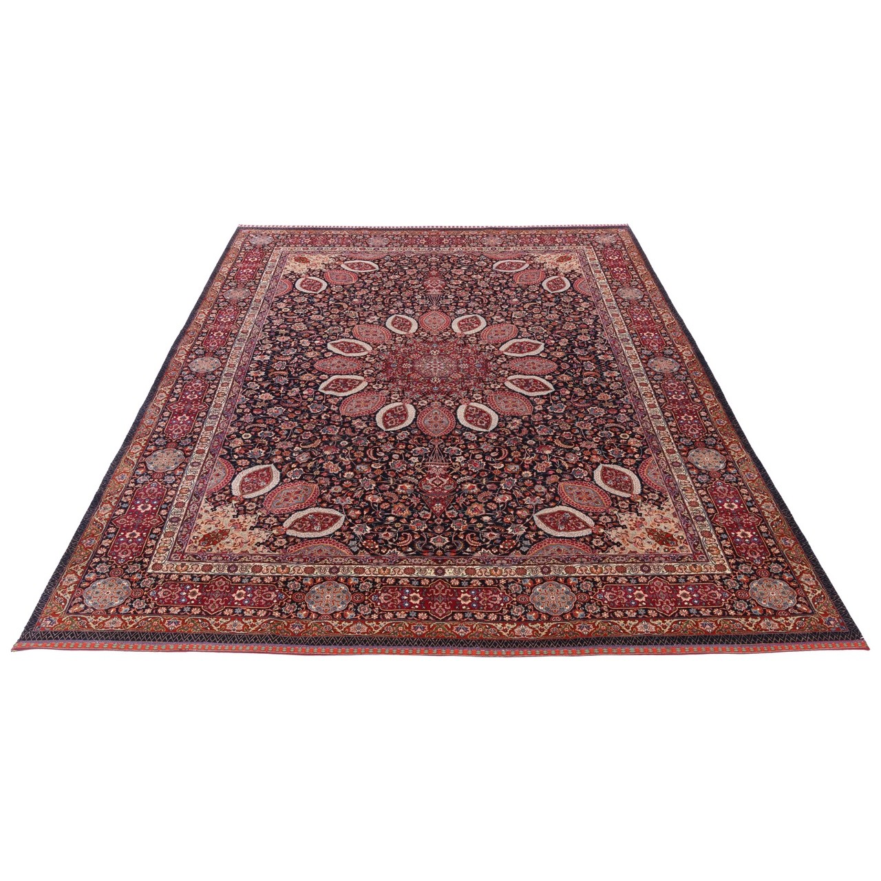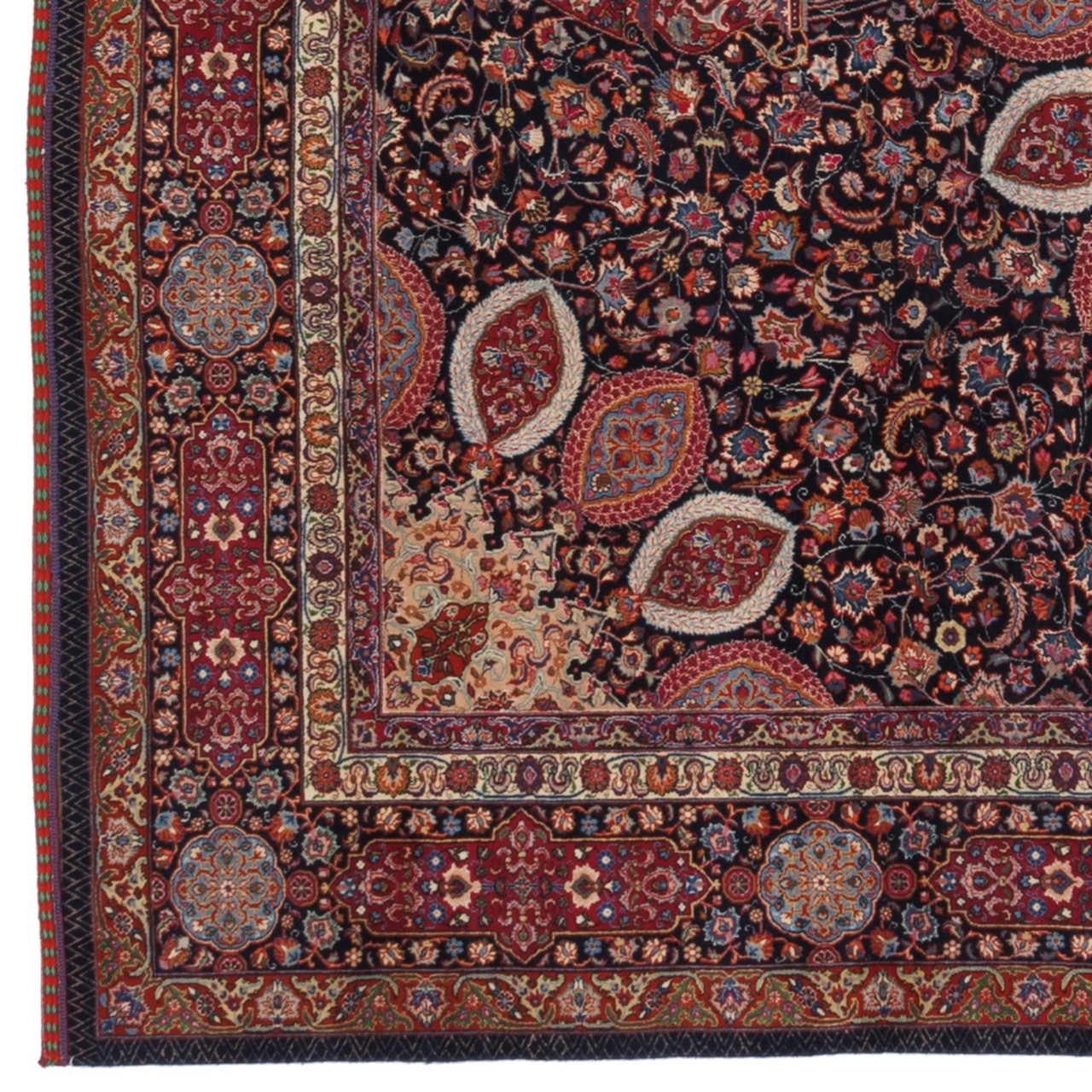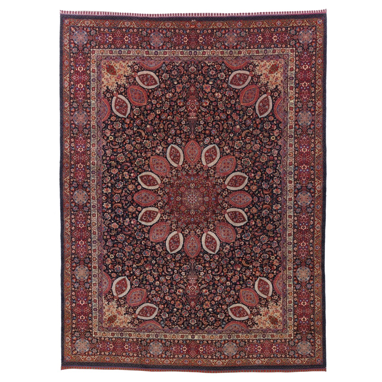 تأتي هذه السجادة اليدوية العتيقة من مشهد بتصميم مدالية مع أركان وبنقشة «شيخ صفي» الفاخرة ومنسوبة إلى علامة «جلائيان»، بمقاس 295 × 390 cm (9'8" × 12'10") ومساحة تزيد على 11.5 م² (أكثر من 123.78 ft²). وتبلغ كثافة النسج نحو 3,300 عُقَد/دسم²، بما يدلّ على بناءٍ منظم ومتين. يستمد التصميم إلهامه من عمارة ضريح الشيخ صفي الدين الأردبيلي، جامعًا بين التذهیب الراقي والهندسة الإيرانية المتقنة ليمنح العمل روحًا تاريخية ومتصوفة. تتوسّط المدالية الوقورة أرضية كحلية عميقة، وتحتضنها أركان متوازنة بتناظر دقيق. ويمتد اللون الكحلي من المتن إلى الحواشي ليصنع تماسكًا بصريًا محبّبًا. يكتمل العمل بوبر صوفي ناعم مع سدى من خيطٍ طبيعي.