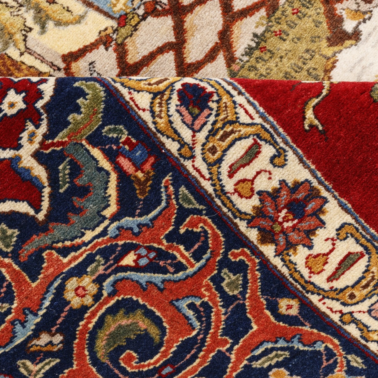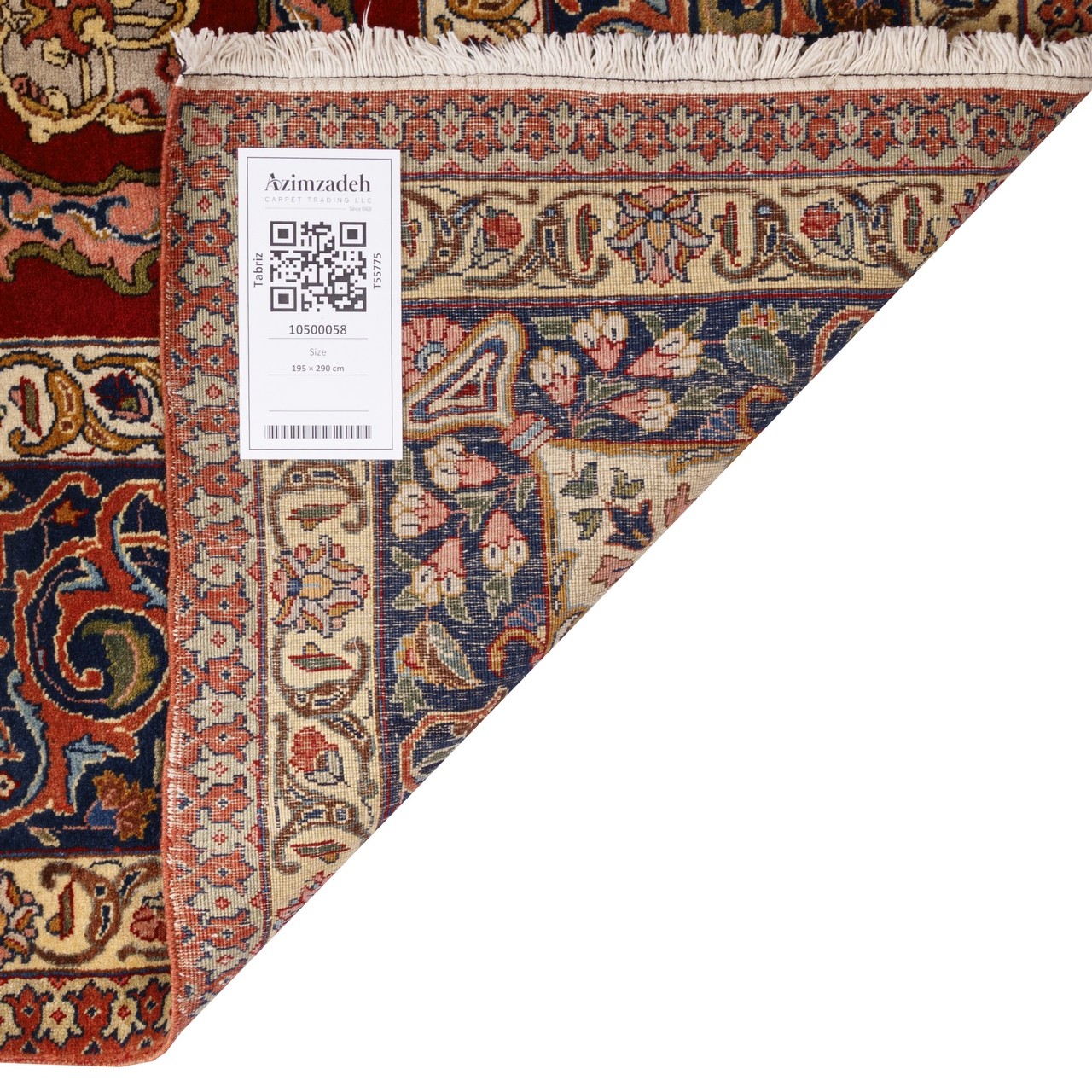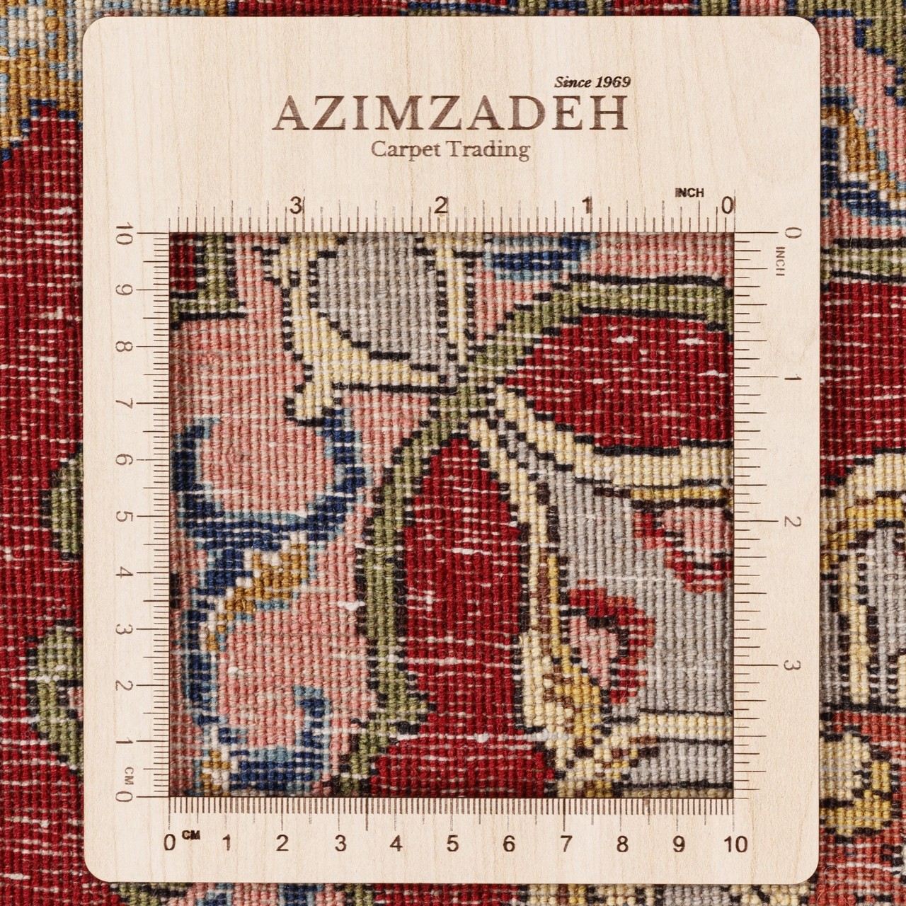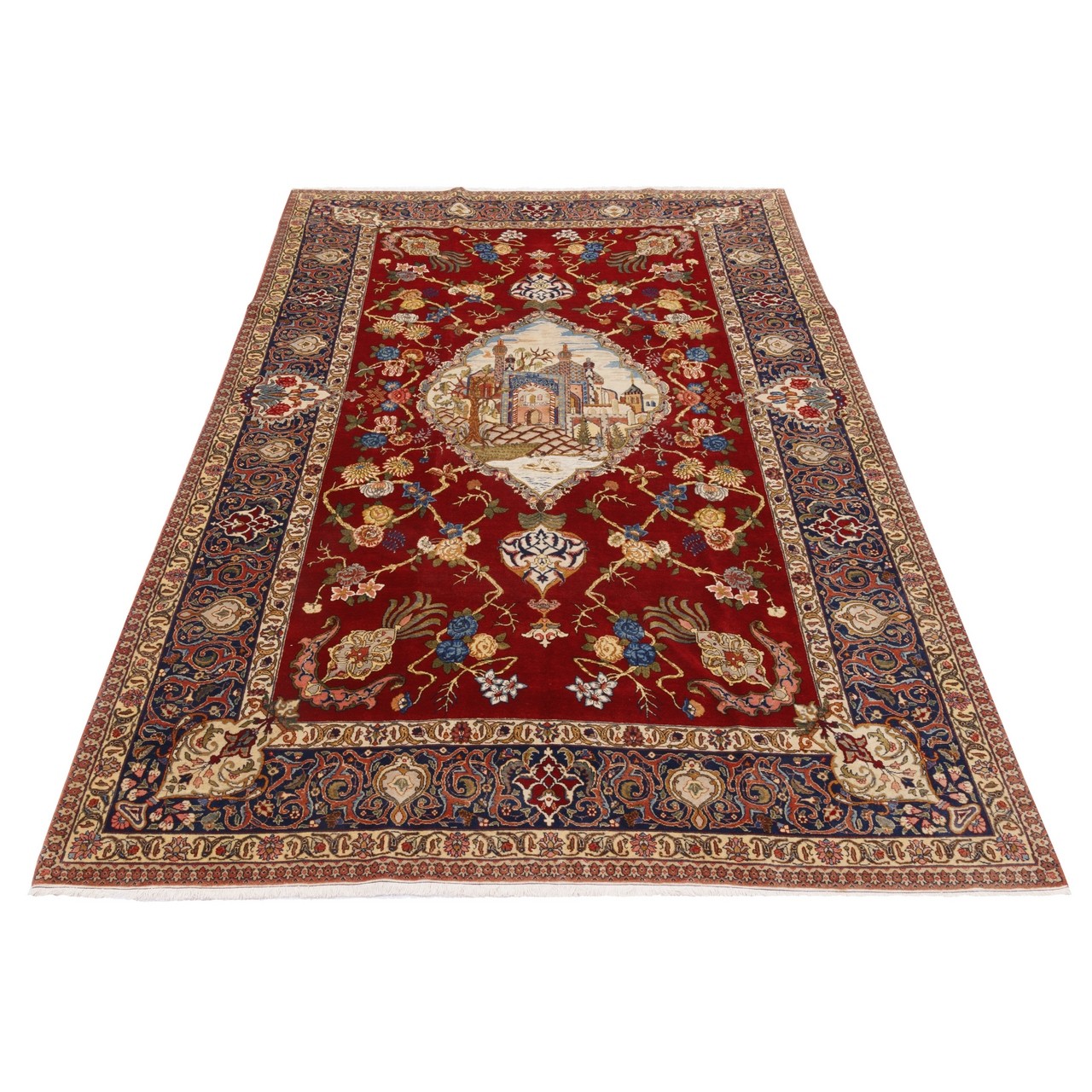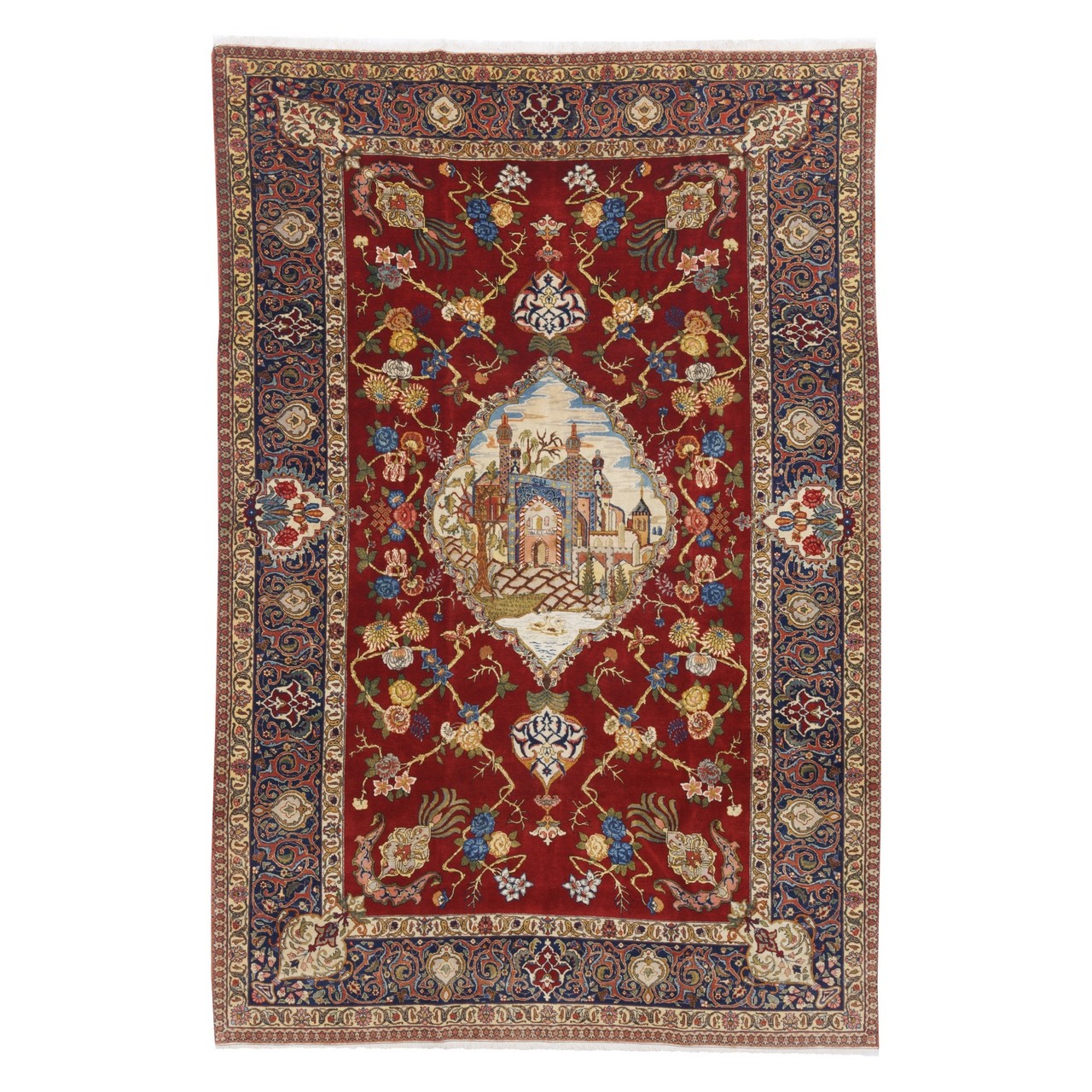 هذه السجادة اليدوية القديمة ذات تصميم ترنج ونقوش تصويرية ليست مجرد بساط، بل رواية بصرية لتاريخ وثقافة إيران. تبلغ أبعادها 195 × 290 سم (6'5" × 9'6") وبمساحة 5.66 م² (60.94 قدم²)، مما يجعلها خياراً مهيباً للمساحات الواسعة وذات الهوية. ما يميز هذا العمل عن غيره هو وجود نقش تصويري لقبة سلطانية، أحد أبرز المعالم المعمارية في العصر الإيلخاني، المنسوجة في قلب السجادة لتجسد عظمة العمارة الإيرانية في إطار السدى واللحمة. تبلغ كثافة النسج نحو 3,300 عُقد/دسم²، ورغم أنها لا تنتمي إلى أدق الفئات، فإنها تُظهر دقة عالية وتماسكاً في تجسيد الزخارف، خصوصاً العناصر المعمارية، مما أضفى مشهداً مليئاً بالتفاصيل وجاذباً للبصر. أرضية باللون اللاكي الدافئ مع حاشية سرمهئية أصيلة صنعت تركيبة كلاسيكية ومشرقة، تعزز الشعور بالوقار والعمق الثقافي إلى جانب الجاذبية الفنية البصرية. أما مادة الصوف مع سدى من قطن، فهي تعكس أصالة البنية ومتانة التقليد: نسيج متين وناعم وبهـيج يصلح للاستخدام اليومي أو للاقتناء كقطعة مميزة.
