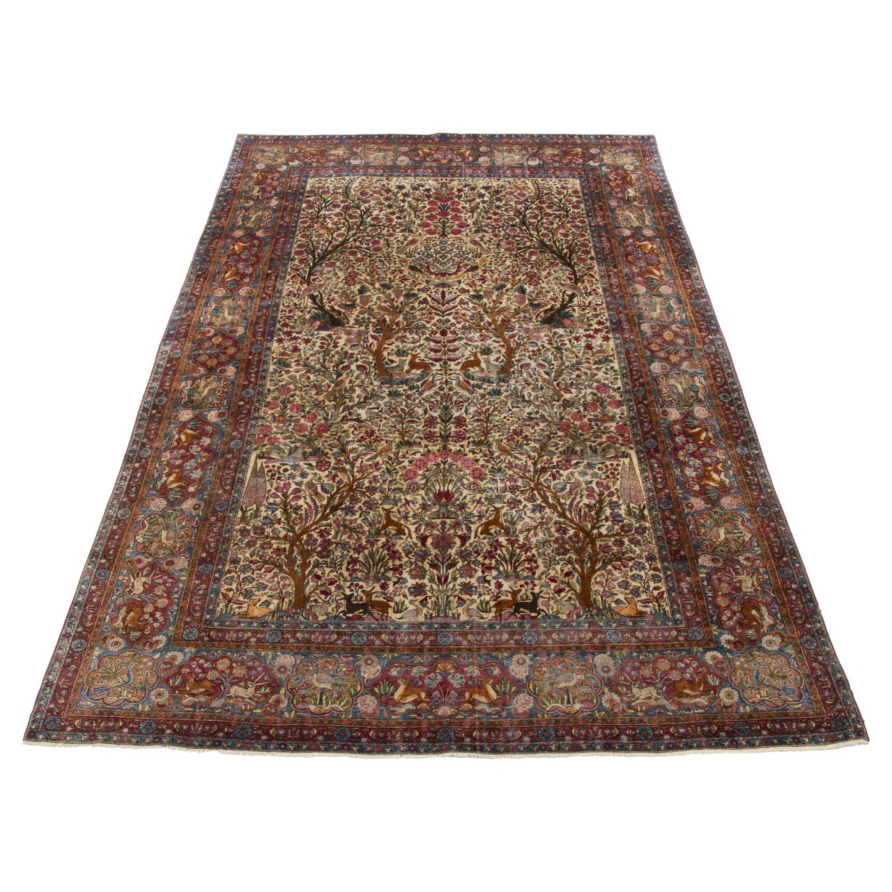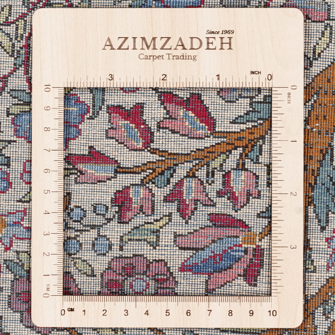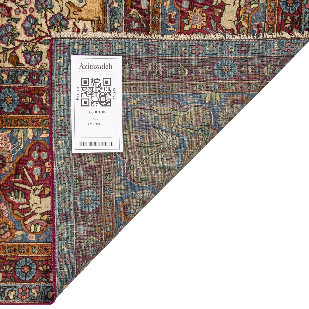 هذه سجادة أنتيك من كاشان بتصميم ممتد ونقوش حيوانية، ليست مجرد تجلٍّ للذائقة الجمالية، بل وثيقةٌ عن صِلة الإنسان بالطبيعة في ثقافة إيران. نُسجت بالكامل من حرير بالكامل بتقنية السوف، فتمنح حضوراً بصرياً ولمسياً مميّزاً. تأتي بمقاس 200 × 308 سم (6'7" × 10'1") ومساحة 6.16 م² (66.31 قدم²)، وهي هيئة مستطيلة تلائم البيوت ذات الروح الثقافية والنظرة الأصيلة. تنتشر النقوش الحيوانية على الأرضية الكريمية كلوحة منمنمات لعالم البرية والخيال؛ من الطيور الخفيفة إلى الأسود المهيبة، وكلها منفَّذة بدقة لافتة وبحيوية ظاهرة. تُتيح تقنية السوف في الحرير إبراز العناصر relief، ومع انعكاس الضوء تُكسب المشهد عمقاً وبعداً ولمعاناً أسطورياً. يحيط الإطار الأزرق بالمشهد في تضاد فنّي مع الأرضية الفاتحة، فيضفي على السجادة وقاراً وتماسكاً كلاسيكياً. كثافة النسج تقارب 7,300 عُقَد/دسم²، ما يدعم وضوح التفاصيل وصقل التنفيذ في مختلف أجزاء السجادة.