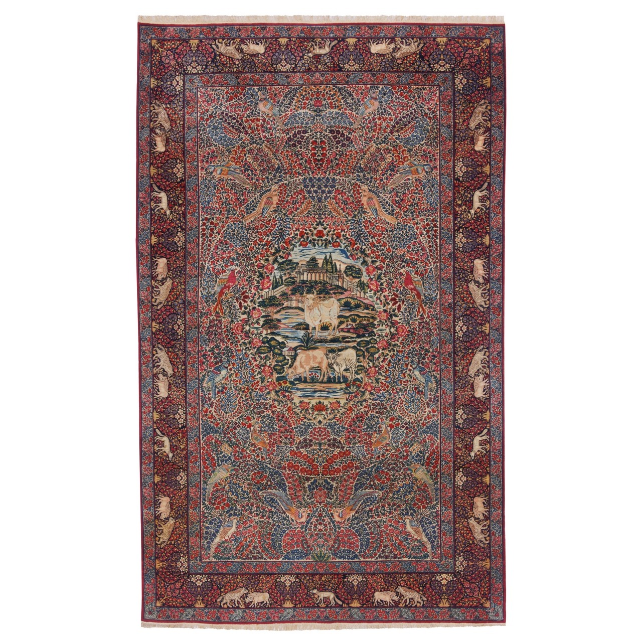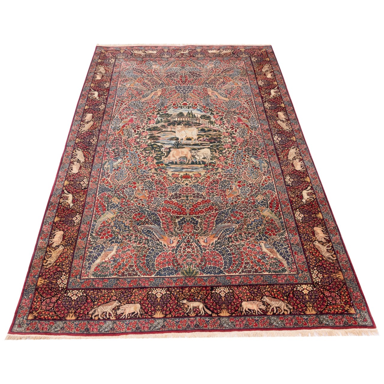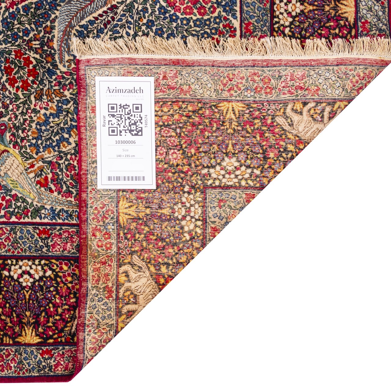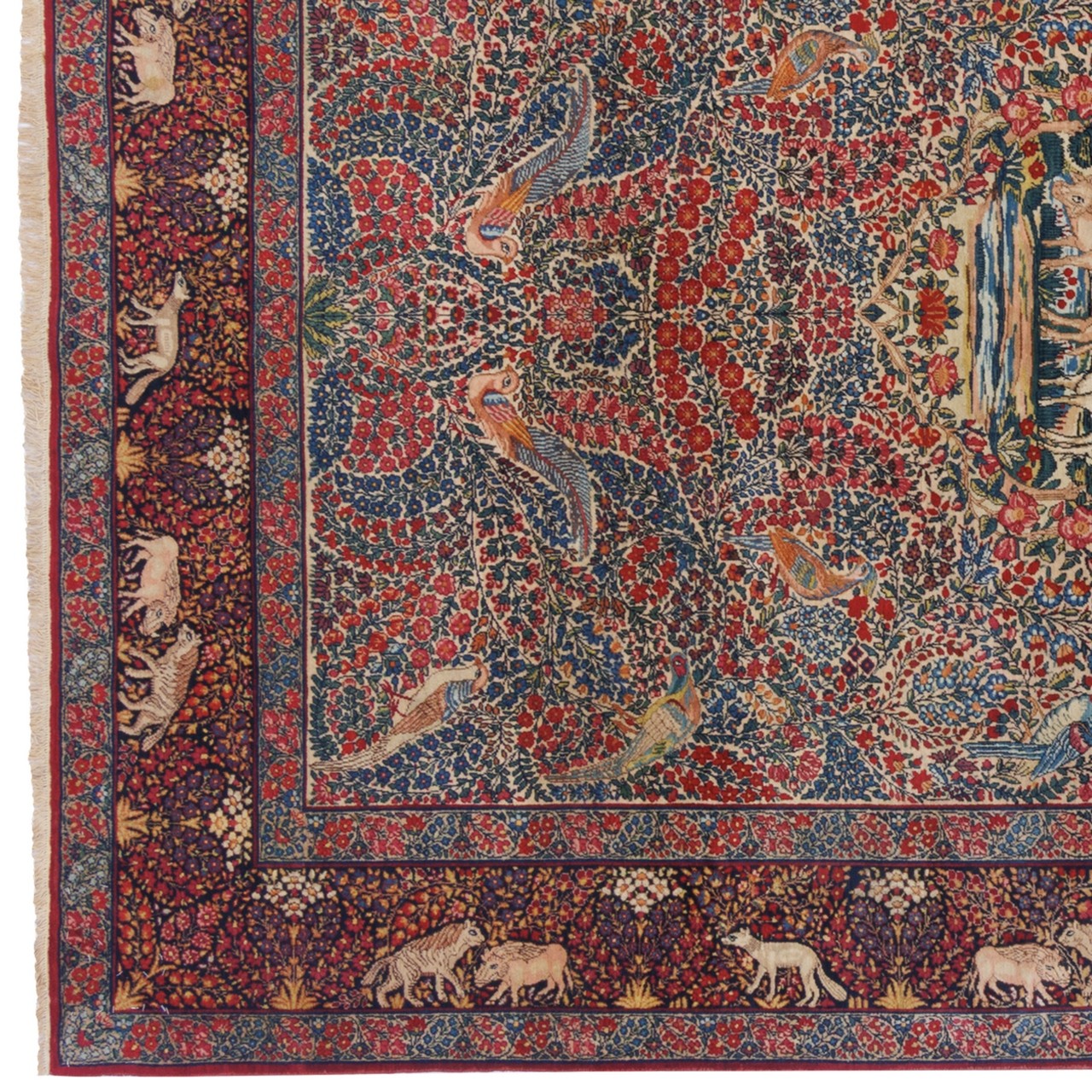 An antique handwoven Ravar rug, a precious and valuable creation from the art-rich Kerman province and the renowned city of Ravar—a land long celebrated for producing artistic and exquisite works. This unique masterpiece, unmatched in finesse, precision, and artistry, is adorned with an all-over design that skillfully and harmoniously covers the entire field with distinguished and refined motifs. Prominent and distinctive animal figures, depicted with exceptional delicacy, narrate ancient tales and symbolize nature and life in Iranian art. The refined artistry visible in this design is supported by a fine weaving density of approximately 6,200 knots/dm², making this piece extraordinarily delicate and valuable, worthy of admiration from every viewer. The cream-colored field creates a pleasing and tranquil backdrop on which the animal motifs shine with remarkable beauty, while the navy border forms a special, elegant, and balanced composition. Made from the finest grade-one wool and woven on a sturdy cotton warp with masterful skill, this rug offers not only beauty but also exceptional durability and longevity. Measuring 140 × 235 cm (4'7" × 7'9") with an area of 3.29 m² (35.43 ft²), it is an ideal choice for luxurious and authentic interiors seeking a distinctive and impactful presence. This Ravar handwoven rug is a symbol of Iranian history, culture, and identity, and its presence in any space reflects the owner’s authenticity, artistry, and refined taste.