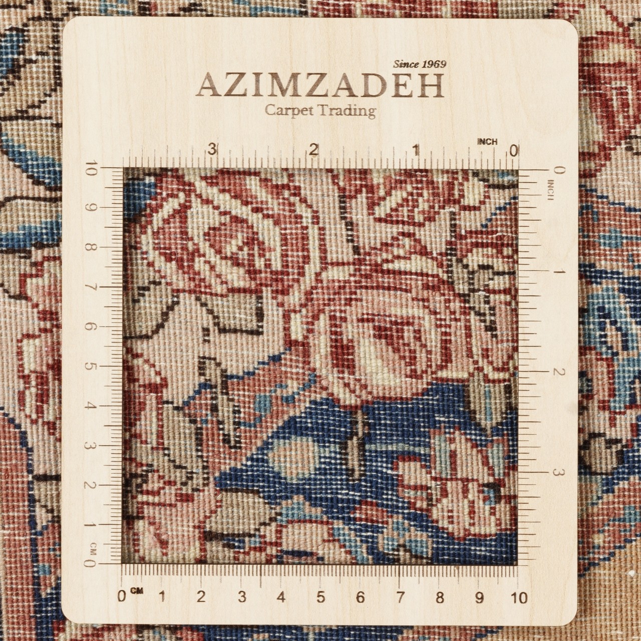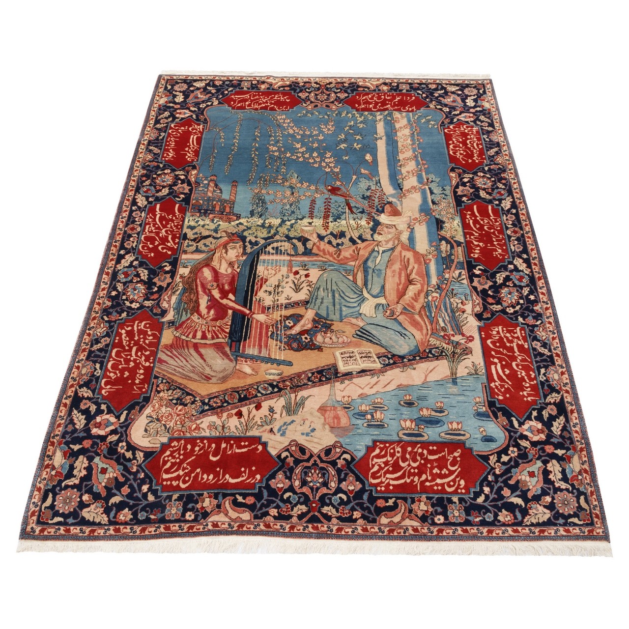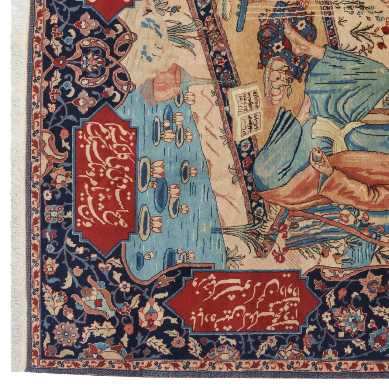 This antique Tabriz rug, measuring 165 × 220 cm (5'5" × 7'3") with an area of 3.63 m² (39.07 ft²), is not merely an artwork but a reflection of thought and literature. With the “Haddad Carpet” brand and an approximate weaving density of 5,100 knots/dm², it exemplifies the masterful fineness and exceptional precision of Tabriz weavers. Its all-over pictorial design, rendered in a polychrome palette and enclosed by a deep navy border, lends the piece a profound and noble presence. What truly distinguishes this rug is its subject: a portrayal that echoes the visage and intellectual world of Omar Khayyam— the renowned poet, philosopher, and astronomer of Nishapur—whose verses are woven into the border. Fine wool with a cotton warp ensures both softness and durability, a structure that withstands the passage of time while preserving its spirit. The motifs recall Khayyam, the poet of fate and free will, wine and transience, and the play of time. Colors, like the words of a quatrain, sit together with gentle richness, turning the carpet into a page of poetry. Some of the notable verses appearing in the rug read: Tomorrow I shall fold the banner of hypocrisy, with my white hair I will make my resolve. The measure of my life has reached seventy; if I do not rejoice in this moment, when shall I?