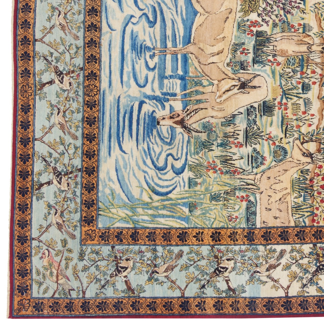 An antique handwoven Tehran rug, a distinctive and refined creation that rises from the heart of Iran’s capital—Tehran, a city with a singular place in the history of carpet art. This valuable piece is adorned with an all-over design that masterfully blankets the entire field with exceptional grandeur, reflecting the precision and finesse of Tehran’s artisans. The field presents a lively, multicolored palette, reminiscent of classical Iranian painting, paired with elegant animal motifs that symbolize life, movement, and vitality. Arranged in a regular, harmonious manner across the field, these figures evoke narratives from Iran’s timeless, nature-inspired imagination. Premium wool, combined with a sturdy thread warp, lends outstanding quality and durability. Its very fine weaving shows a density of about 5,100 knots/dm², allowing every motif to appear with heightened clarity and definition. A light blue border frames the composition with a gentle, poetic calm. The rectangular dimensions are 130 × 210 cm (4'3" × 6'11"), and the area is 2.73 m² (29.39 ft²), making it a discerning choice for luxurious, artistic interiors. With its special splendor and beauty, this antique Tehran rug stands as a prominent emblem of authentic Iranian artistry, bringing a unique, historical presence to refined spaces.