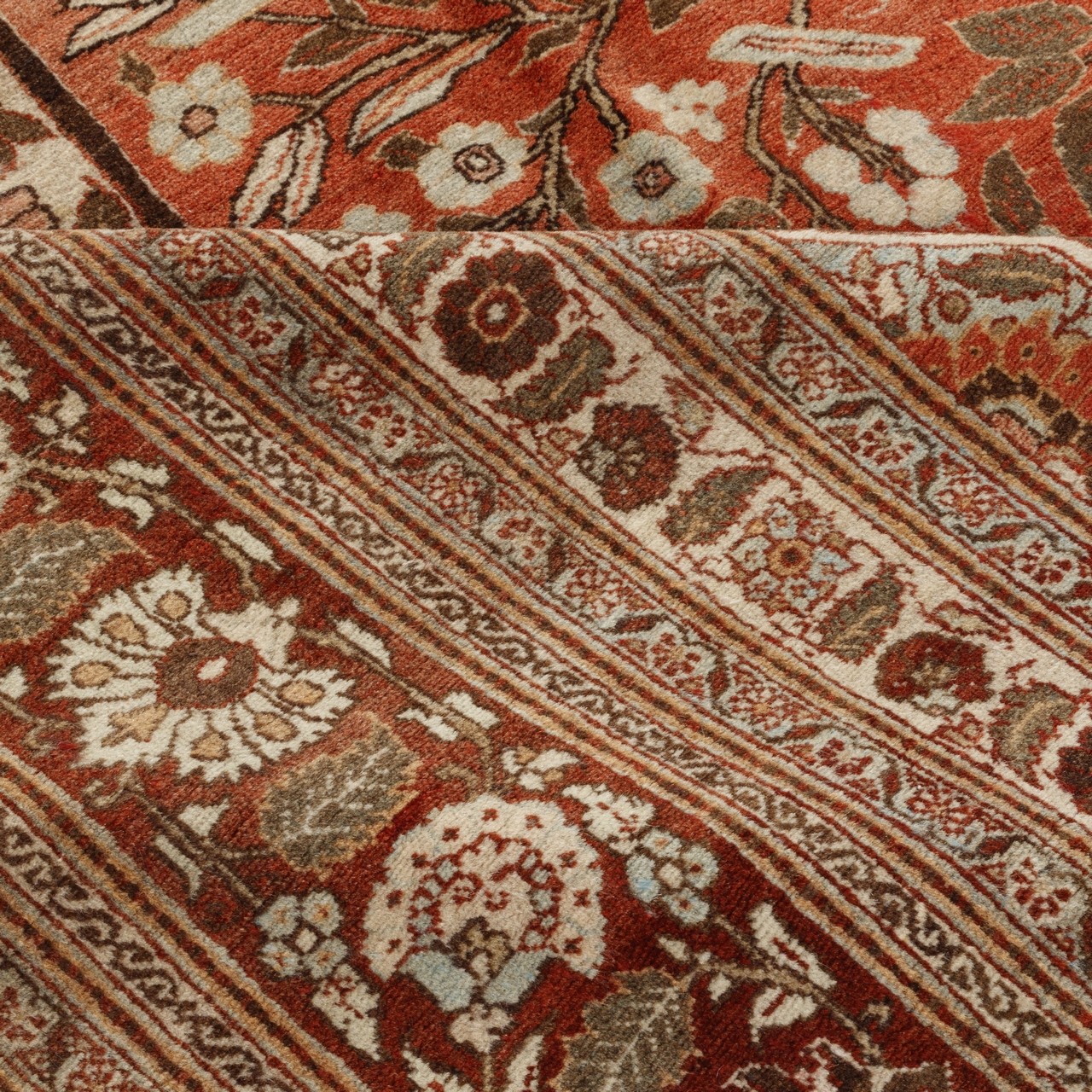 This antique handwoven rug from Tabriz, in a medallion-and-corner design and associated with the “Haj Jalili” carpet brand, measures 335 × 462 cm (11'0" × 15'2") with an area of 15.48 m² (166.63 ft²), making it well suited to ceremonial halls and historic mansions. A copper-colored field, in a warm and aristocratic aura, creates a distinctive and bold atmosphere in which the floral motifs are rendered with remarkable precision. The border, in the same copper tone, brings an exceptional sense of chromatic continuity and balance. The weaving density is approximately 3,300 knots/dm², presenting the rug’s details effectively. The medallion-and-corner layout, arranged symmetrically and harmoniously, reflects Persian gardens—where the medallion shines like a radiant sun at the center and the corner motifs embrace beauty at the four corners of the rug. High-quality wool pile and a durable cotton warp ensure a balance of softness and strength.