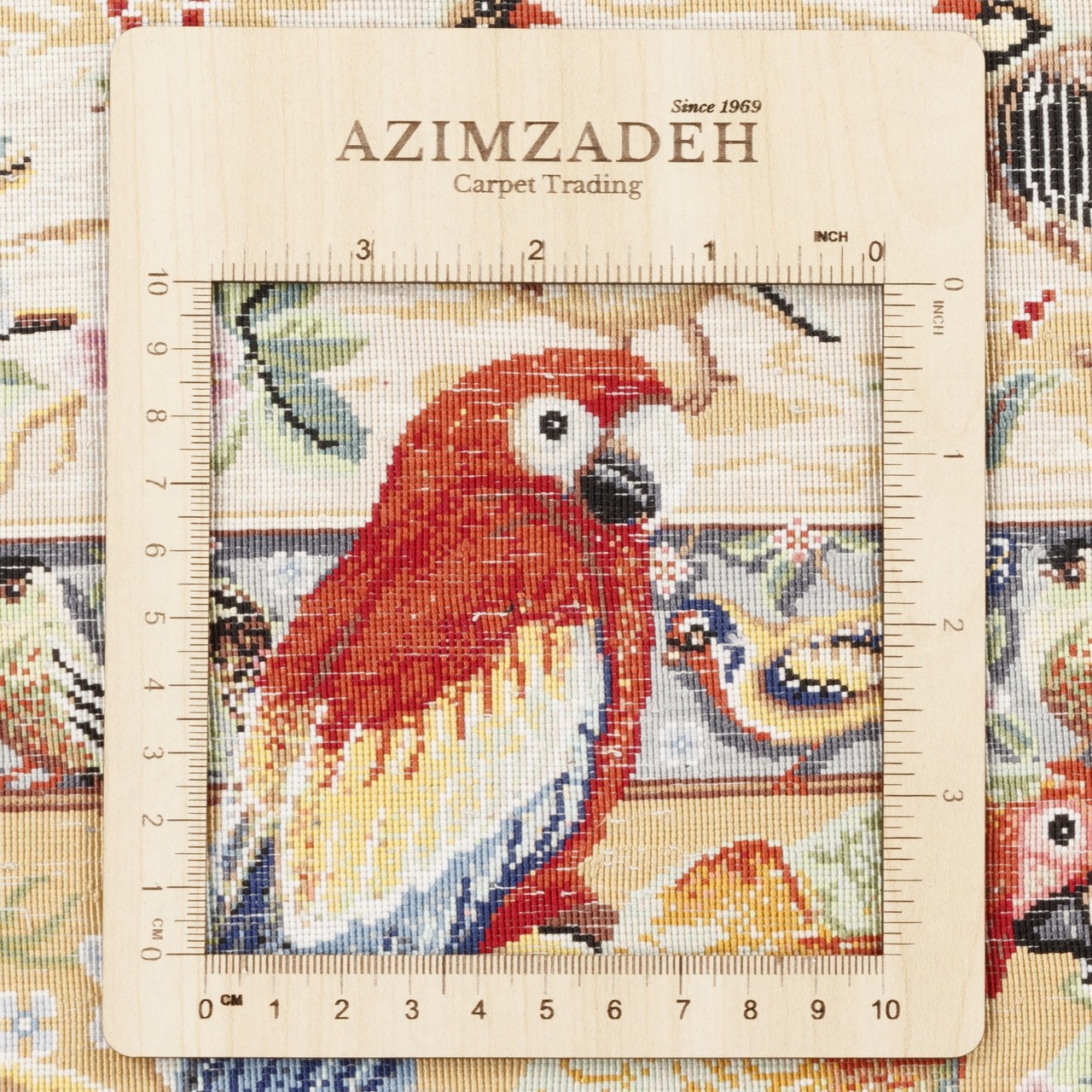 This all-silk handwoven Qom rug measures 137 × 200 cm (4'6" × 6'7") with an area of 2.74 m² (29.49 ft²). It is woven in an all-over design. Produced under the “Mehdi Sadeghzadeh” brand, it has an approximate density of 10,000 knots/dm². The unified all-over composition is densely covered with delicate bird motifs and natural elements. A calming turquoise field paired with a warm brown border creates a harmonious, balanced presence. In this rug, the birds are created not merely as decorative elements, but as a symbol of freedom.