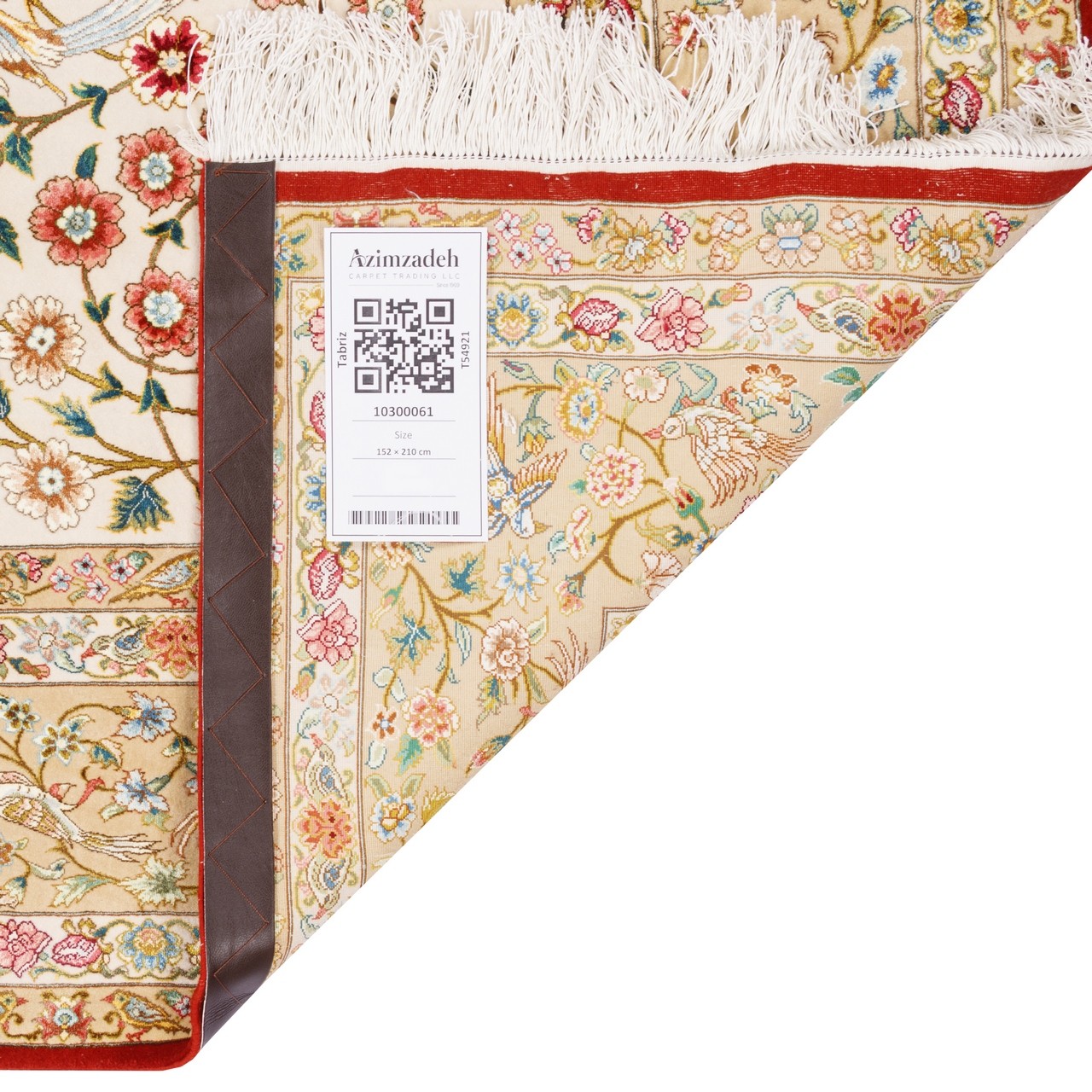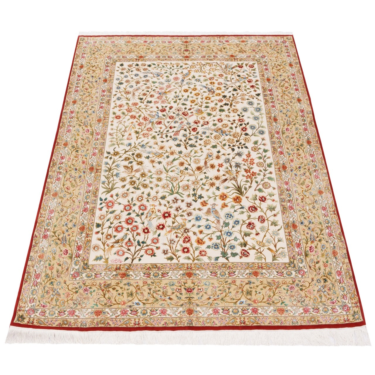This distinguished rug with an all-over silk-flower design, commissioned by the renowned Azimzadeh brand, is a showcase of grandeur and refinement within a classical framework. The rectangular rug measures 152 × 210 cm (4'12" × 6'11") with an area of 3.2 m² (34.45 ft²), offering a distinctive expression of visual beauty. Delicate and radiant blossoms grow ceaselessly across a cream-colored field, gently framed by a beige border that settles the composition in dignity and subtle elegance. This color harmony adds brightness, poise, and balance to the surrounding space. Constructed entirely of silk—in both the floral motifs and the warp—it symbolizes authenticity and luxury, while creating a lightweight, silken texture that softly reflects light, casting a gentle glow of brilliance and delicacy. This natural sheen imparts a dreamy and serene atmosphere to the environment. The weaving density of about 10,000 knots/dm² represents the pinnacle of precision and mastery in this work. The fineness is evident in the meticulous rendering of petals, the orderly arrangement of motifs, and the miniature-like weaving, placing the rug among collectible artistic creations of the highest order.