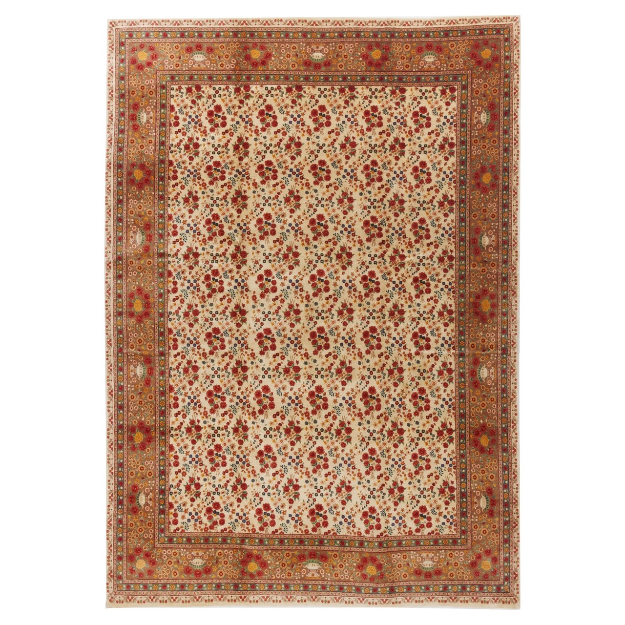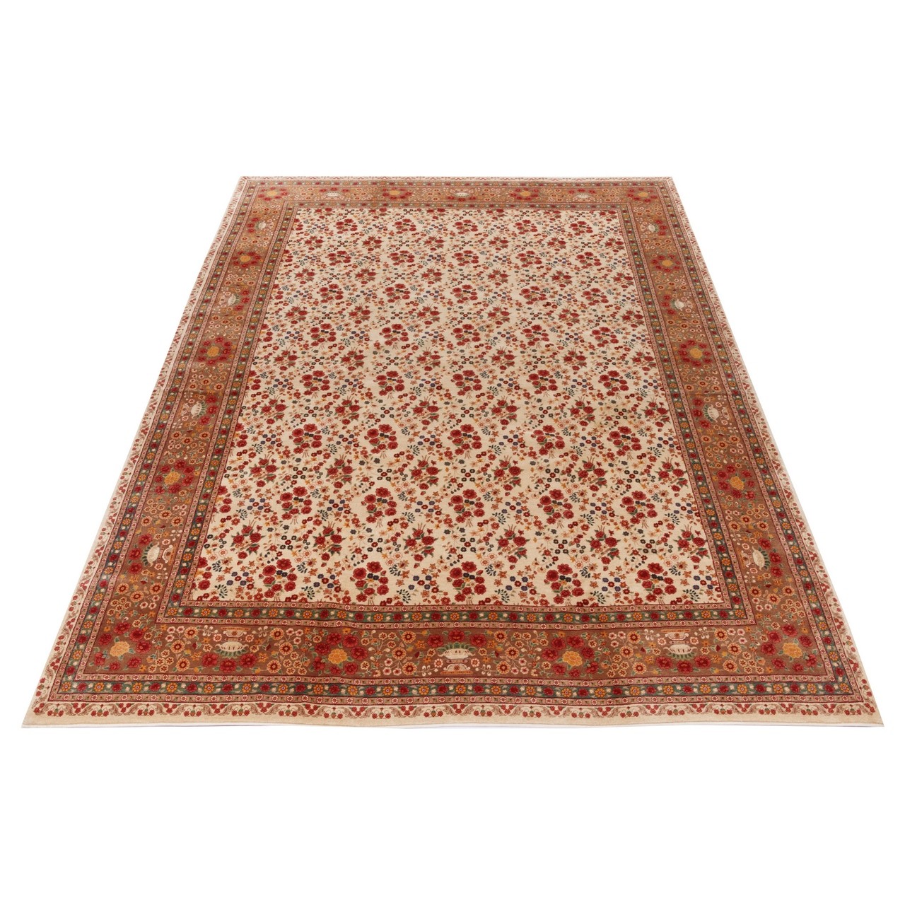 This handwoven Varamin rug in an all-over floral design measures 318 × 450 cm (10'5" × 14'9") with an area of 14.31 m² (154.03 ft²). A cream field acts as a bright canvas for flower motifs that flow across the entire surface, giving a sense of boundless, fluid harmony—like a garden unfolding before the eye. The all-over layout, with its measured repetition and balance, conveys serenity and gentle movement. With a weaving density of approximately 2,500 knots/dm², the relatively coarse construction is a smart choice for this generous size, ensuring both durability and a traditional character. A warm camel-toned border embraces the floral expanse and adds visual cohesion. A high-quality wool pile combined with a strong cotton warp provides a structure that is both sturdy and pleasantly soft for long-term use.