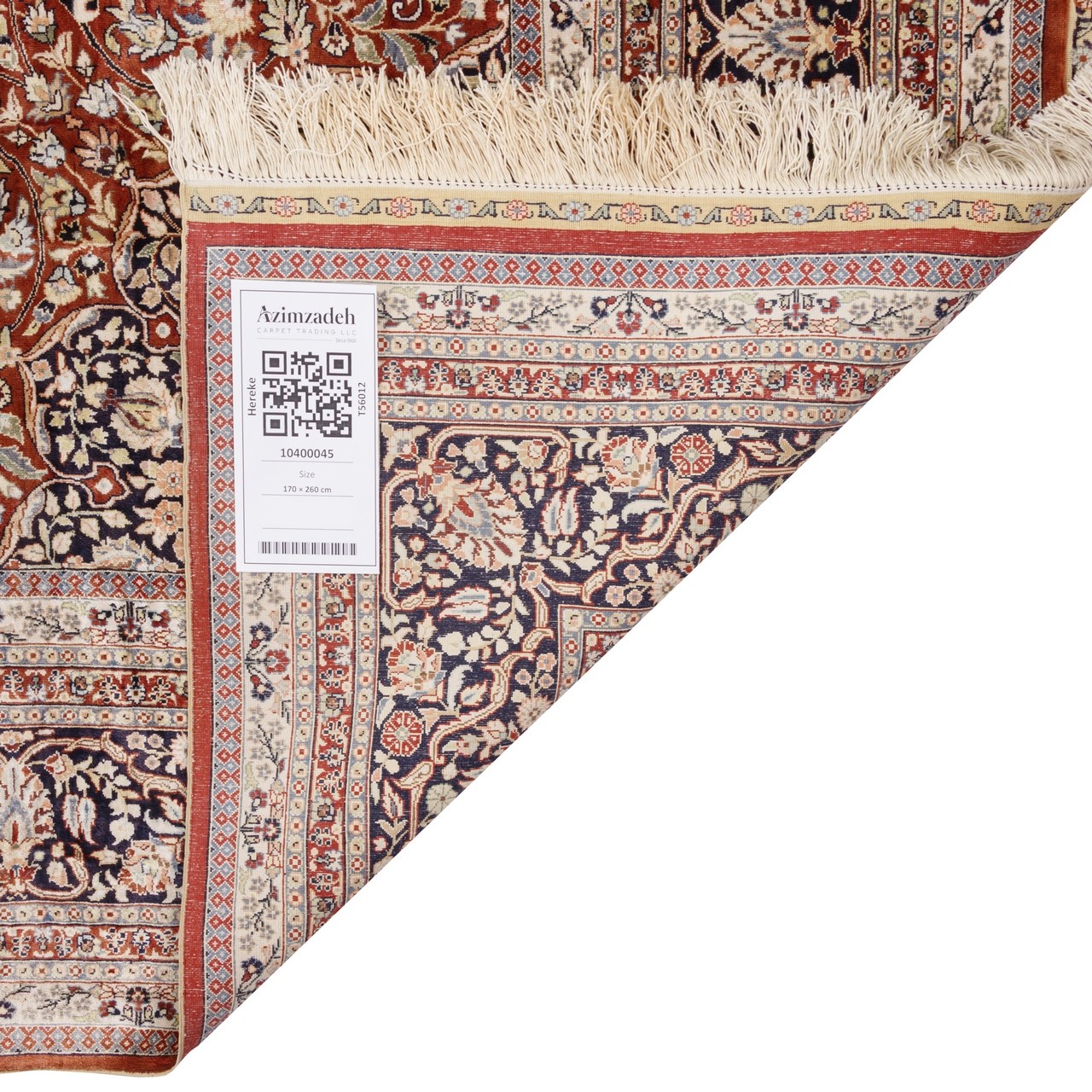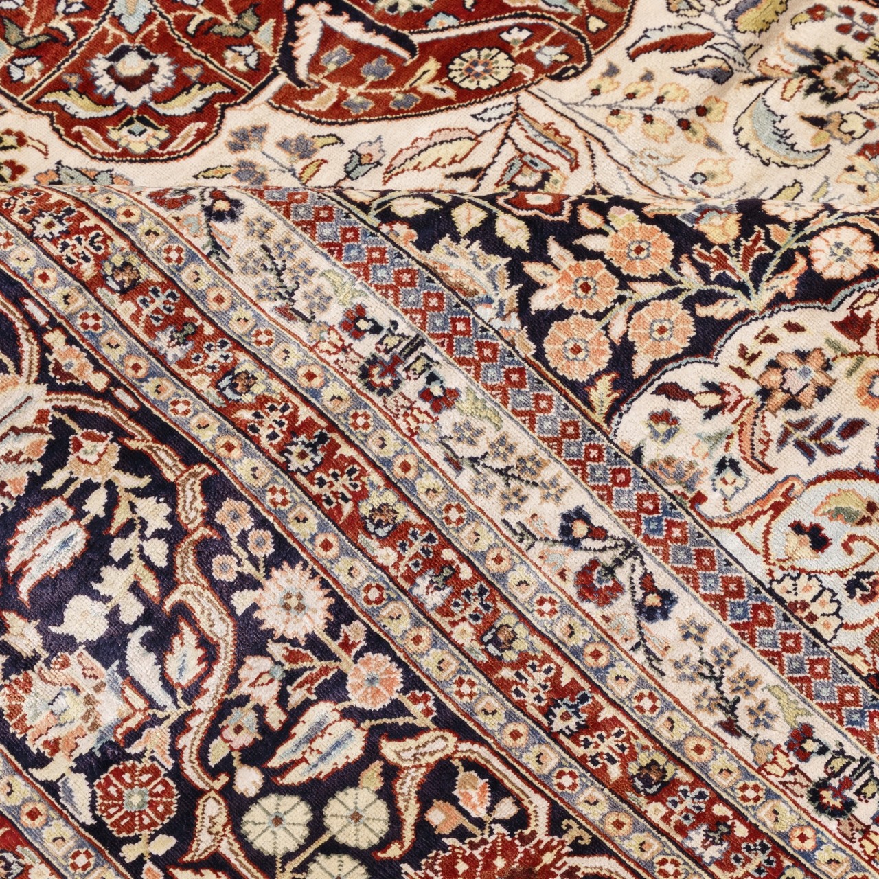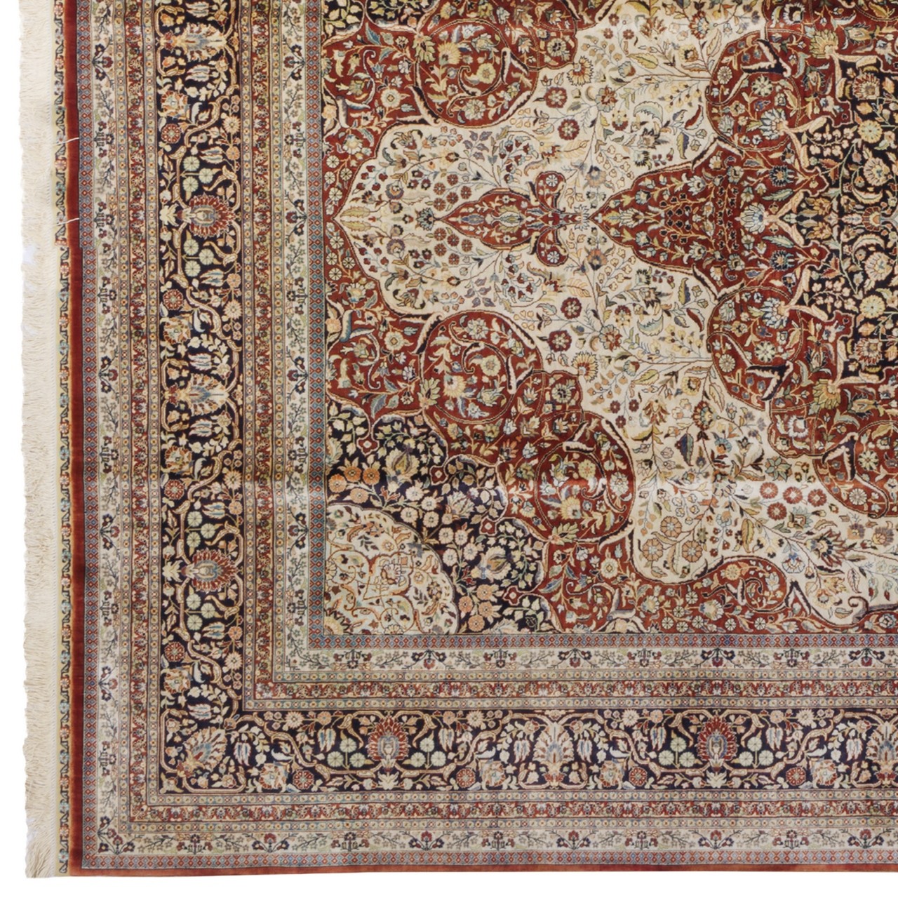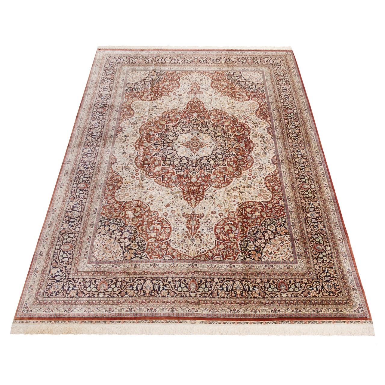 This distinguished all-silk handwoven rug measures 170 × 260 cm (5'7" × 8'6") with an area of 4.42 m² (47.58 ft²), standing among the finest expressions of Persian all-silk weaving. With a weaving density of approximately 10,000 knots/dm², it embodies exceptional finesse and meticulous craftsmanship. Woven entirely from pure silk, the piece offers unparalleled softness, while the natural sheen animates the colors so they come alive and seem to dance in the light. The classical medallion-and-corner design presents a well-balanced central medallion with corner spandrels. A cream field acts as a luminous canvas for the floral motifs, while the navy border lends the composition a poised, traditional dignity. The fine small-scale florals recall the miniature-painting aesthetics of the Qajar and Safavid periods.