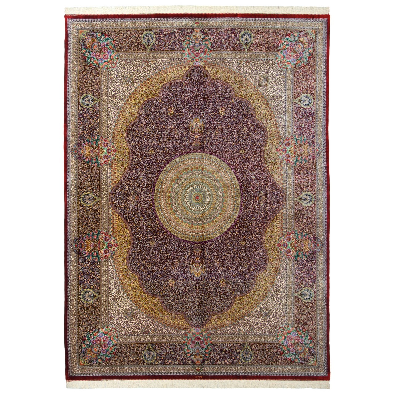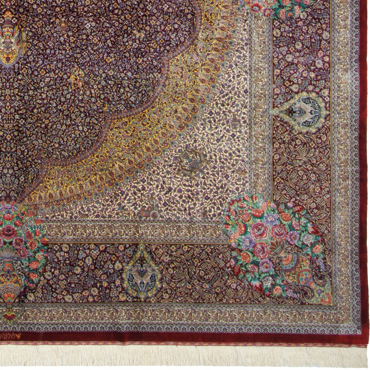 Handwoven Carpet, Corner Medallion Layout, All Silk, Qom, 294 × 406 cm Ref 11100646