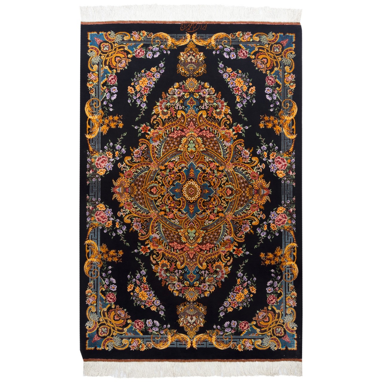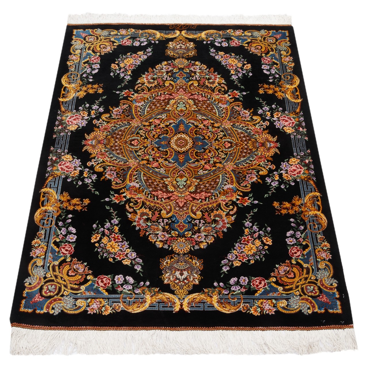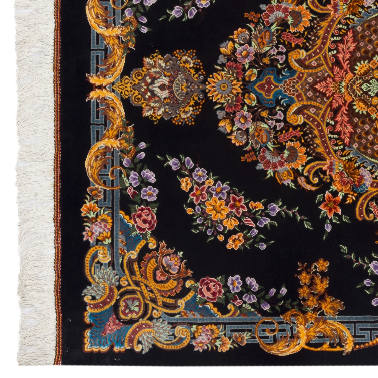 This all-silk handwoven Qom rug under the “Mohammad Movarrej” brand, in a medallion-and-corner design, measures 120 × 80 cm (3'11" × 2'7") and has an area of approximately 1 m² (10.76 ft²). Woven at a fineness of 10,000 knots/dm², it immediately signals a distinctive work. Delicate flowers, leaves, and curvilinear forms are orderly arranged within the central medallion and the corner spandrels. The boldly chosen black field and border—rare among traditional rugs—lend a special gravitas; together with silk’s natural sheen, they create a striking yet pleasing contrast. Across the black ground, blossoms shine like bright stars, setting up a captivating balance of light and shadow and bringing the floral ornament to the height of visual delicacy. This artful contrast not only attests to the weaver’s mastery, but also offers a contemporary reading of a classic template—a rug that, beyond decoration, stands as a panel-like expression of Iranian finesse and identity.