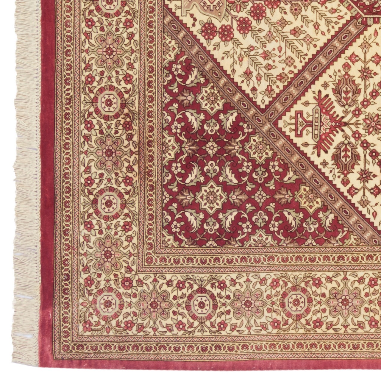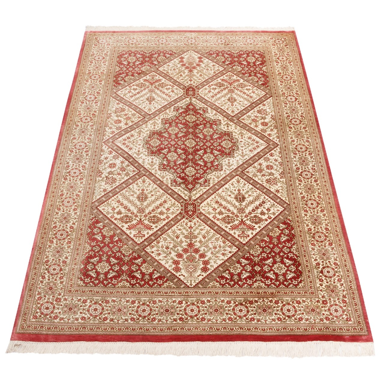 This Qom handwoven rug, measuring 99 × 151 cm (3'3" × 4'11") with an area of 1.50 m² (16.15 ft²), is a creation of the Salehi brand. It is woven in the authentic medallion-and-corner design with a geometric perspective, where angular, broken, and symmetrical lines form a pleasing harmony with traditional Persian motifs, presenting a novel sense of balance. The weaving density of about 8,600 knots/dm² highlights its fine craftsmanship. The cream-colored field, a symbol of delicacy and purity, paired with a matching border, conveys a particular visual calmness and adapts easily to various interior styles, whether classical or modern. The all-silk composition places this rug among the most precious pieces. Silk not only offers a unique, gentle sheen but also reflects light within its weave, bringing a vivid and dynamic presence to the surrounding space.