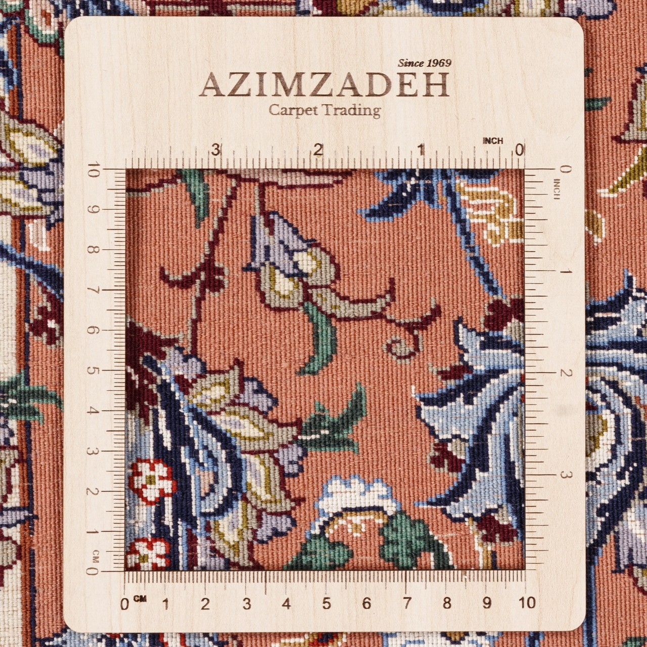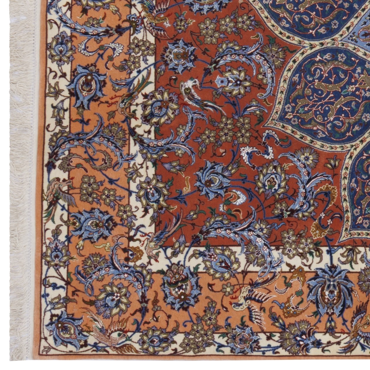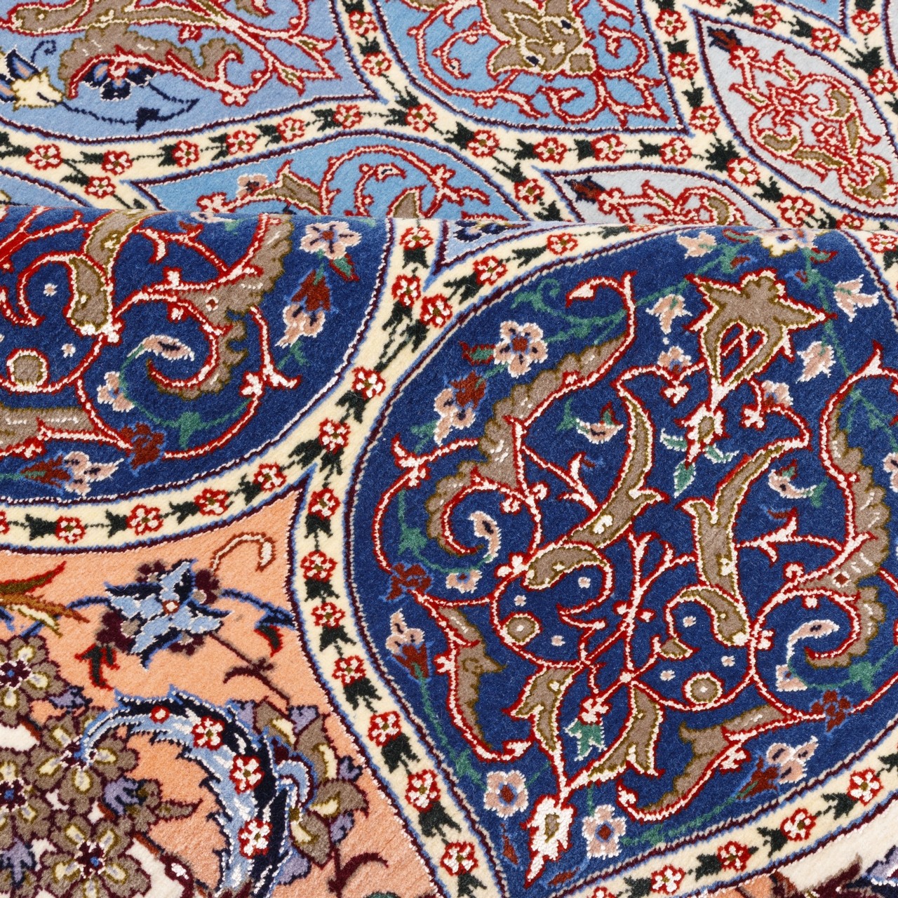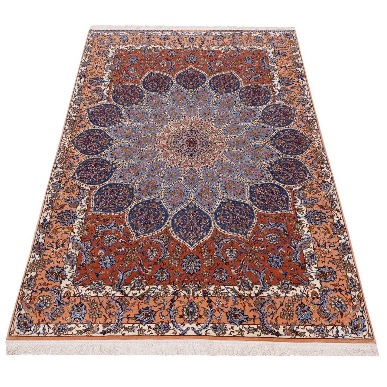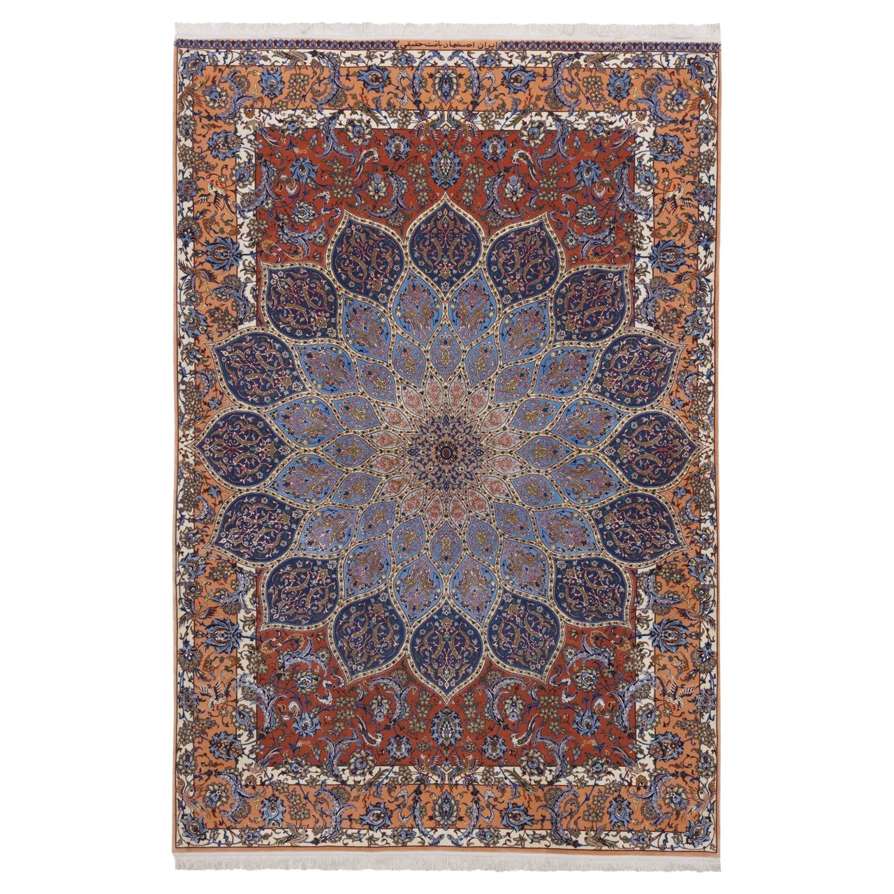 This fine “Gol Abrisham” rug by the Haghighi brand, measuring 151 × 225 cm (4'11" × 7'5") with an area of 3.40 m² (36.60 ft²), is the work of master artisans from Isfahan, uniting color, design, and meaning. With an approximate weaving density of 7,300 knots/dm², it showcases admirable fineness and precision. Crafted with silk highlights in the field and a pure silk warp, it carries unmatched subtlety and a clear, natural sheen; with every shift of light, the palette revives and reveals a gently changing, soul-pleasing presence. This distinguished piece bears the reputable Haghighi name, backed by nearly 150 years of experience in Isfahan carpet art and recognized as a pioneer in producing all-silk rugs, silk-highlight pieces, and three-dimensional designs with tile-like motifs. Its dome design—drawing on the sacred geometry of Iranian architecture—radiates outward from a medallion-like center toward the borders, as though gazing from within a turquoise dome into the starry sky of art. Floral motifs throughout act like visual melodies, infusing life and delicacy into the geometric framework. A madder-red field with a serene blue dome pattern is paired with a delicate, peach-toned border, creating a distinctive and pleasing harmony.
