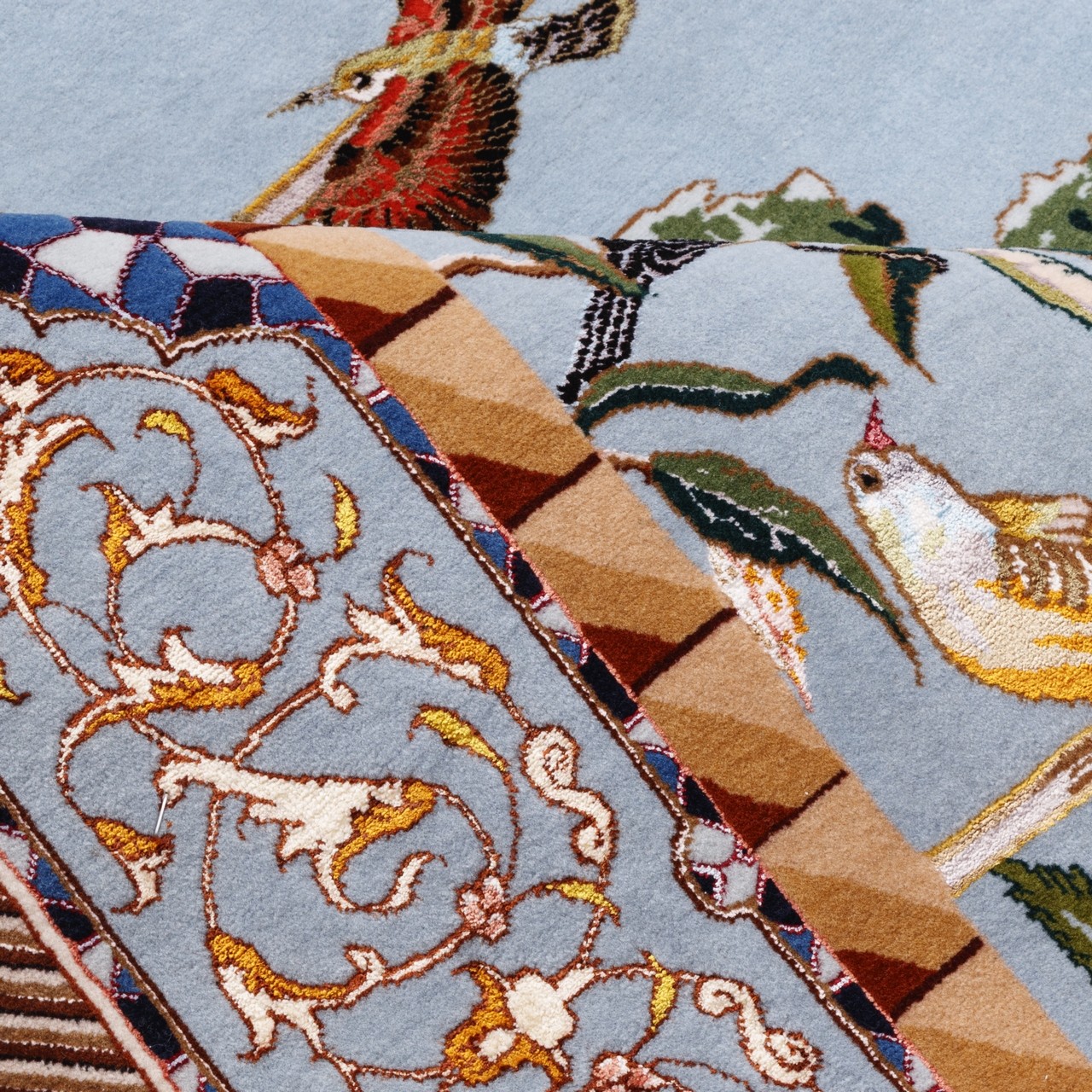 This beautiful handwoven Tabriz rug measures 150 × 205 cm (4'11" × 6'9") with an area of 3.08 m² (33.15 ft²), standing among the distinguished works of Tabriz ateliers. With an approximate weaving density of 5,100 knots/dm², it reflects notable fineness and uncommon craftsmanship. The rug is woven with silk floral highlights on a pure silk warp, yielding a luminous, soft, and refined handle—well suited to spaces seeking authentic luxury and quiet elegance. Its mihrab design with avian motifs lends the piece a spiritual and poetic character; the mihrab, a symbol of human connection with meaning, here finds a sense of release and flight through the presence of birds. A blue field and blue border confer visual calm, presenting the rug like a fragment of sky laid upon the floor. In the lower border, galloping gazelles appear—emblems of freedom and the unbound spirit.