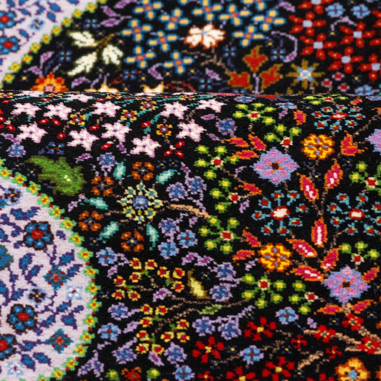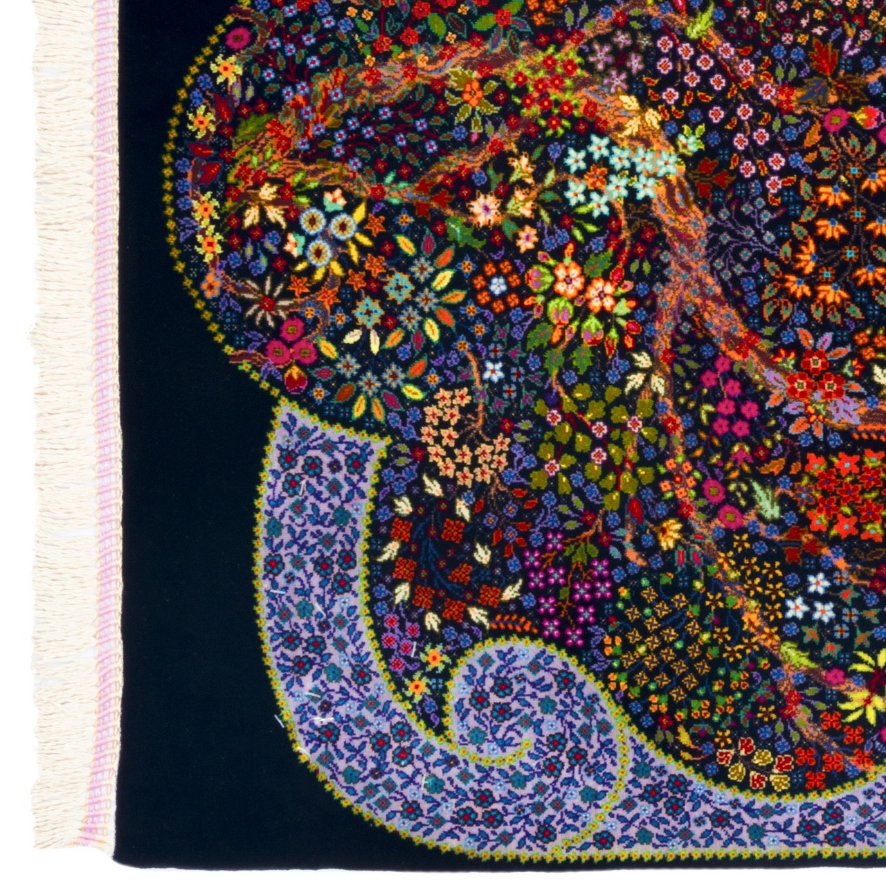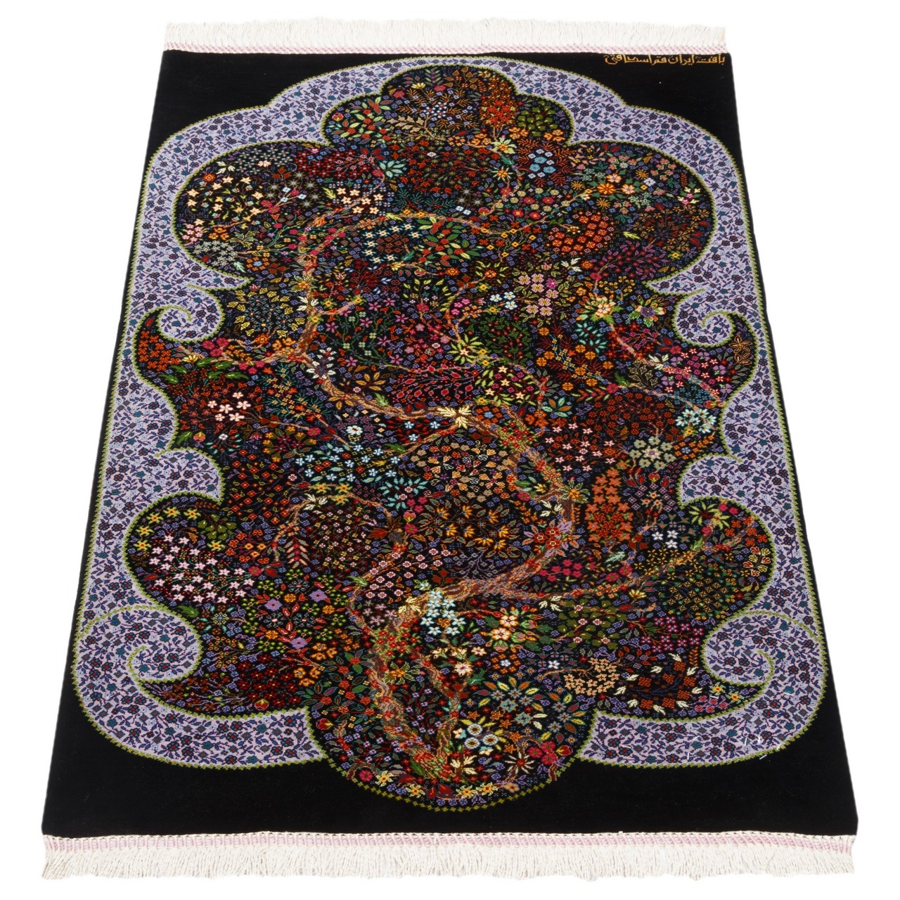 This handwoven Qom rug measures 60 × 105 cm (2'0" × 3'5") with an area of 0.63 m² (6.78 ft²). Produced under the “Eshaqi” brand in an all-silk weave, it carries a weaving density of approximately 10,000 knots/dm². The tree design, deeply rooted in Iranian art, has been beautifully reinterpreted in this piece. A sturdy trunk rises with branches filled with colorful flowers and leaves, symbolizing life, blessing, and continuity woven into its structure. Set against a black background, the blossoms and natural elements are made more prominent and vivid. A lilac-colored border softens the composition, adding gentle tranquility while creating a pleasing contrast with the dark field. The use of all-silk endows the rug with a delicate, lustrous surface that reveals subtle plays of color and texture as the light shifts. This rug is an ideal choice for interiors where calm, depth, and authentic Iranian aesthetics are cherished.