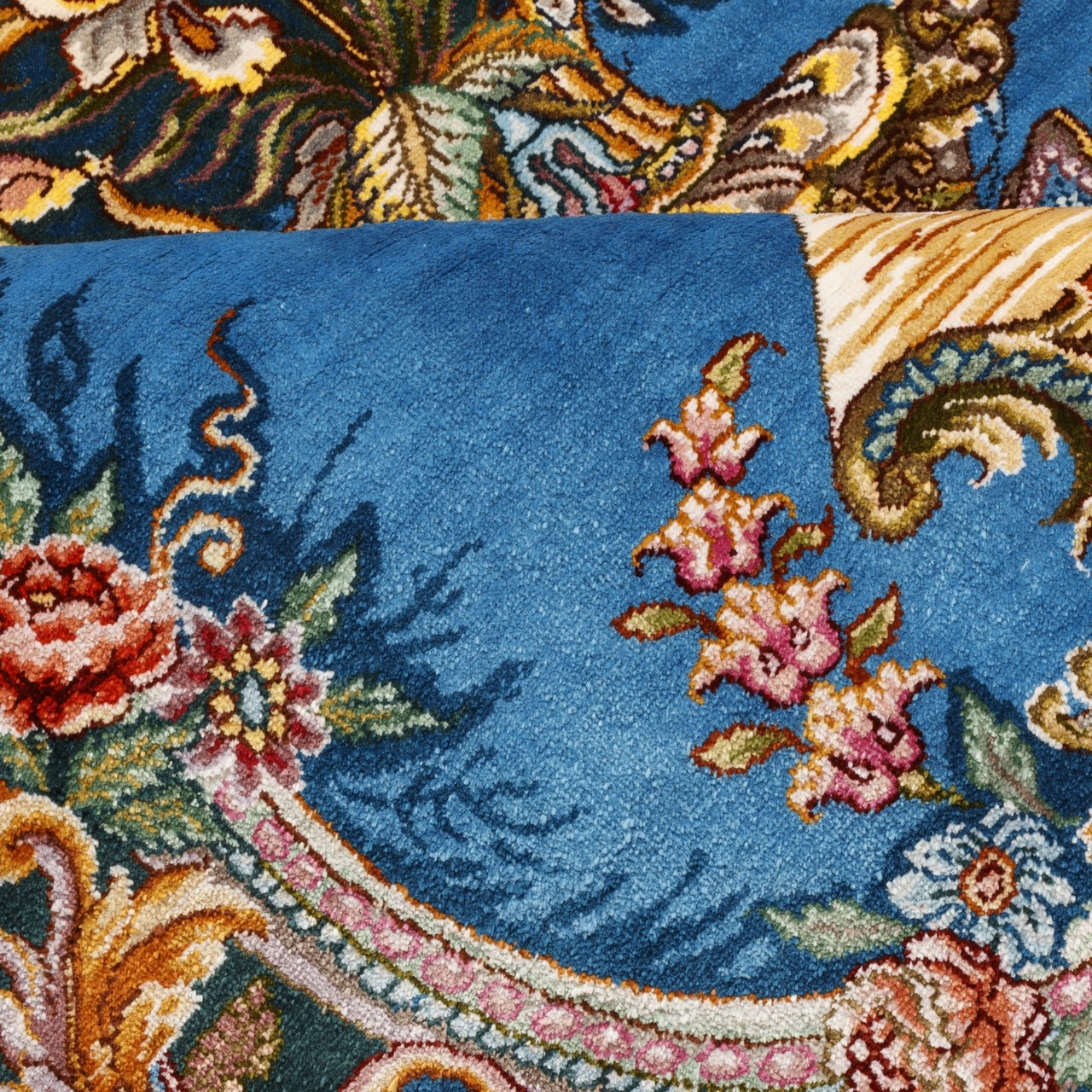 A rug measuring 100 × 160 cm (3'3" × 5'3") with an area of 1.6 m² (17.22 ft²), woven by the skilled hands of Qom weavers under the “Mirzaei” brand. With a knot density of ≈ 7,300 knots/dm² and a vase design, richly detailed and well-arranged flowers surge from the center like a spring of life, shining with freshness and grandeur across a blue ground. The floral field is enclosed by a deep green border—a palette that evokes calm and depth in the viewer. A section of the Persepolis motif appears at the center of the upper border. Its all-silk construction not only grants unparalleled softness but also reflects light in a captivating way. From every angle, the rug reveals new tones and, like a living, dynamic painting, comes to life.