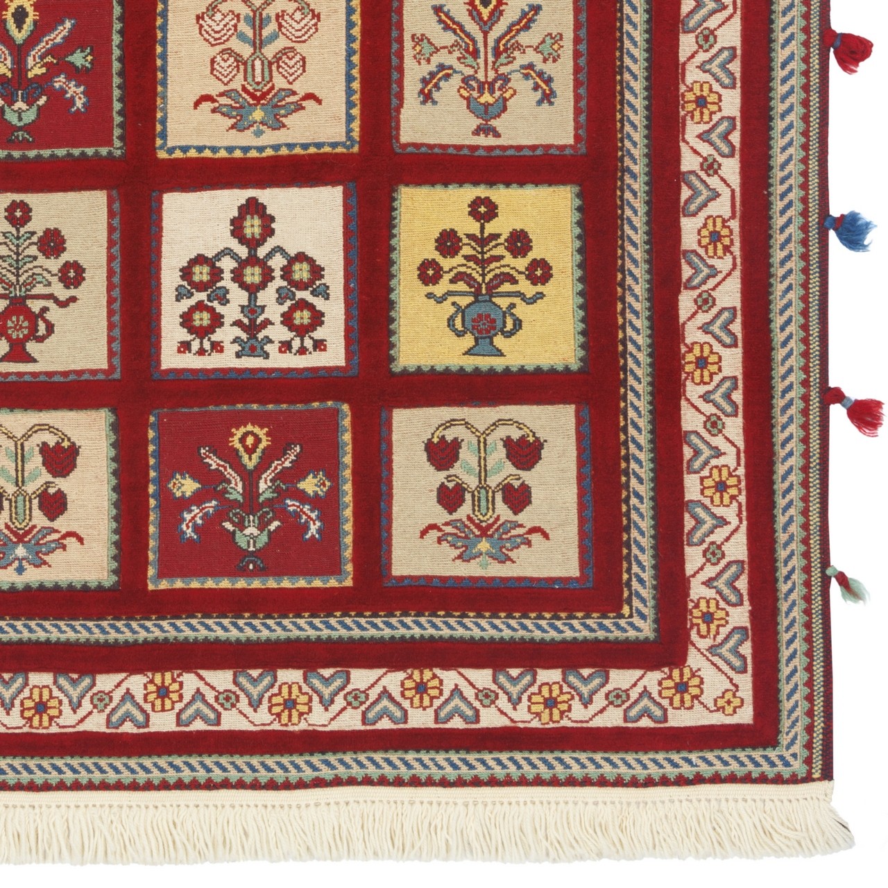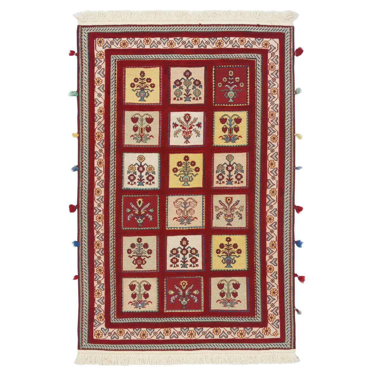 Handwoven Sirjan kilim-rug, 100 × 155 cm (3'3" × 5'1"), area 1.55 m² (16.68 ft²). Woven in the kheshti (panel) design and crafted in all-wool. Knot density: 3,200 knots/dm². The kheshti layout—an Iranian motif—is beautifully reinterpreted here through precise combinations of diverse geometric forms; each panel conveys a visual language of order, repetition, and meaning. The lac-red field, long associated with vitality in Iranian art, lends a warm, inviting character, while the cream border introduces a gentle, balanced calm. Suitable for both contemporary and classic interiors.