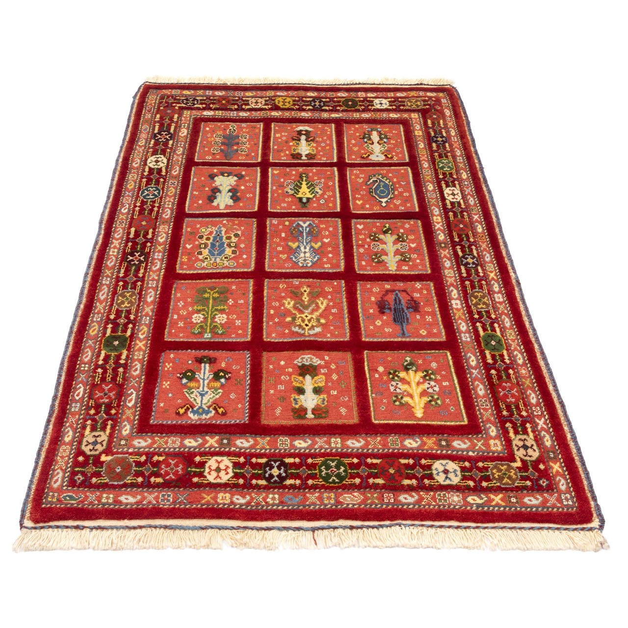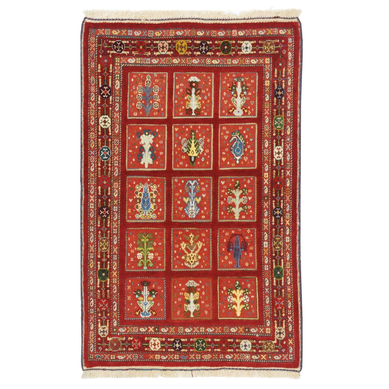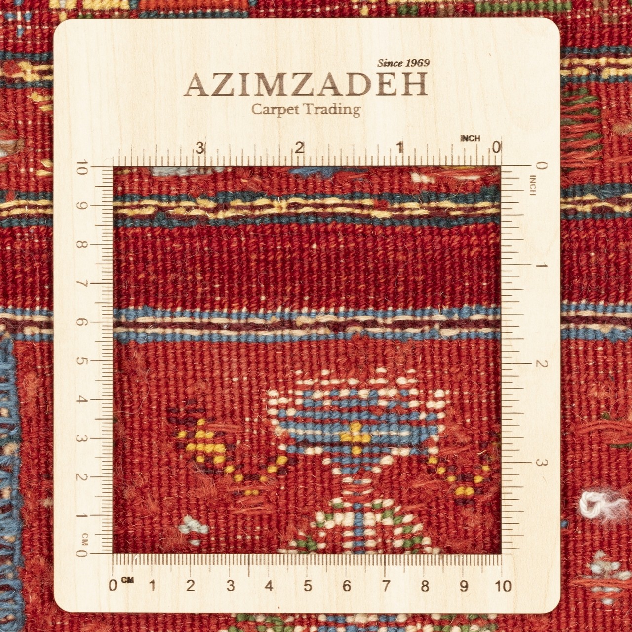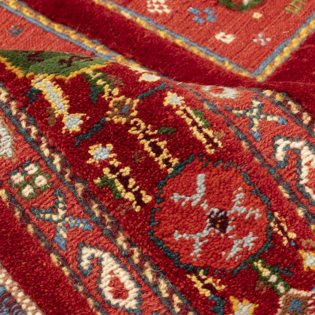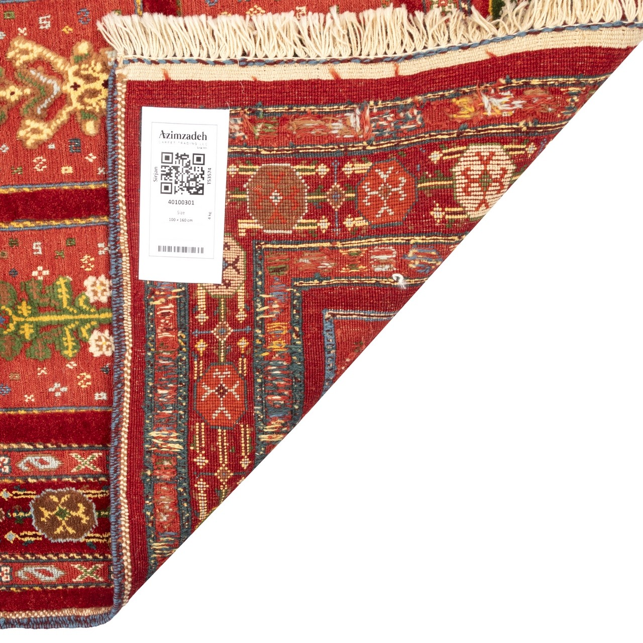 This handwoven Sirjan kilim rug in a kheshti (panel) design measures 100 × 160 cm (3'3" × 5'3") with an area of 1.6 m² (17.22 ft²). The kheshti structure, rhythmic and grid-like, gains a distinctive presence here with a madder-red field. Each interior panel functions as an independent “window,” carrying geometric motifs whose composition conveys order, repetition, and beauty. The simultaneous use of madder red for both field and border reinforces unity and depth, giving the kilim a dignified, stately character. Material: all-wool. Weave density: approx. 1,800 knots/dm².
