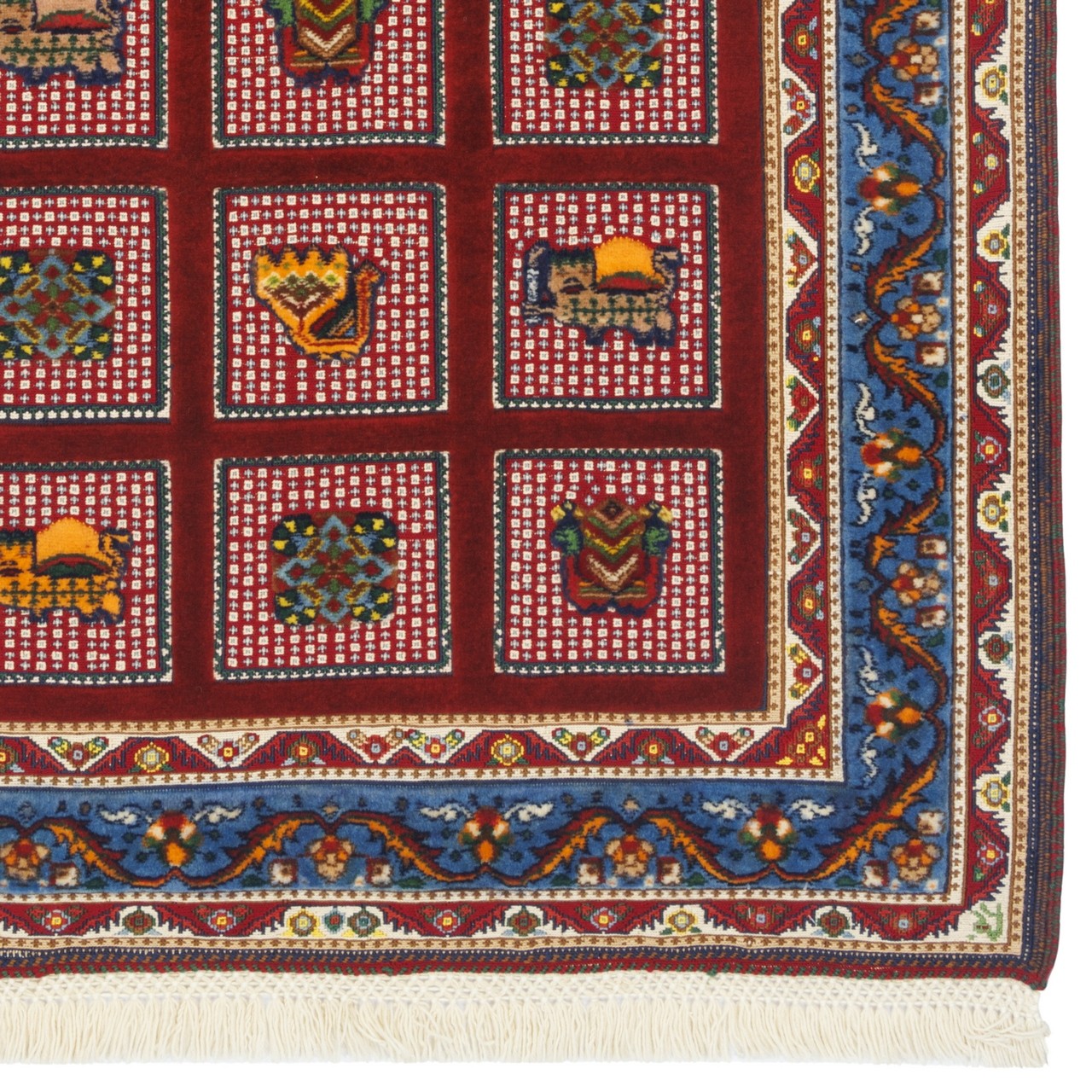 Handwoven Sirjan kilim rug, size 100 × 165 cm (3'3" × 5'5"), with an area of 1.65 m² (17.76 ft²). Woven at approximately 1,800 knots/dm² in all-wool, it stands as an authentic example of Sirjan kilim craftsmanship. What captivates at first glance is the balanced kheshti design with precise geometric motifs and a considered palette rooted in the region’s visual traditions. The kheshti layout, like windows opening onto the weaver’s garden of imagination, sets squares and rectangles side by side, each a self-contained world of motif and color. The laki-red field, paired with a blue border, creates a gentle equilibrium between warmth and calm; this measured contrast heightens the rug’s visual allure. The all-wool fibers used throughout the warp and weft make this kilim a durable, finely patterned, and warming floor covering.