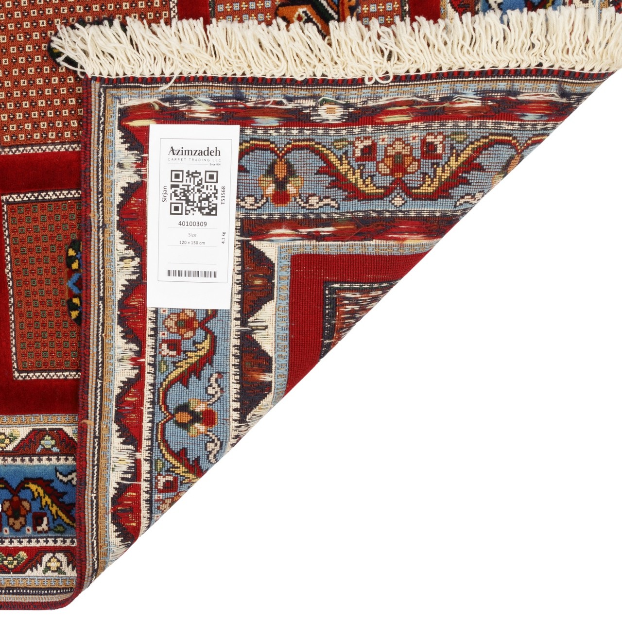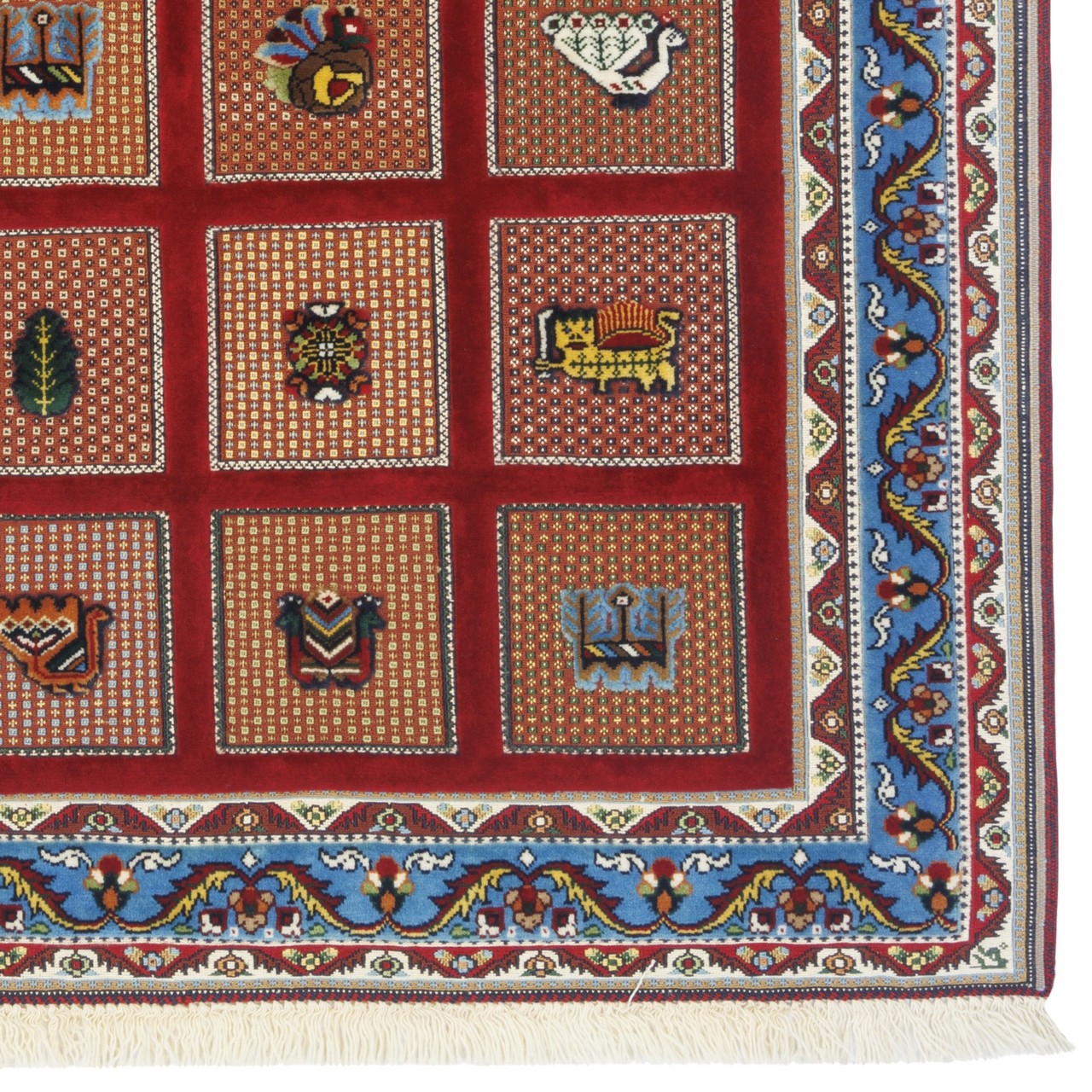 This Sirjan handmade kilim-rug measures 120 × 150 cm (3'11" × 4'11") with an area of 1.8 m² (19.38 ft²). Woven in all-wool at approximately 3,200 knots/dm², it offers a balanced blend of finesse and durability. The kheshti (panel) design brings together orderly geometric forms with symmetrical, balanced motifs—birds, animals, trees, and flowers—each depicted within framed compartments. A madder-red field pairs with blue borders to create visual equilibrium; this palette lifts the rug beyond uniformity and imparts a sense of depth and meaning. Its all-wool construction holds a special place both for the weave’s softness and strength, and for its authenticity.