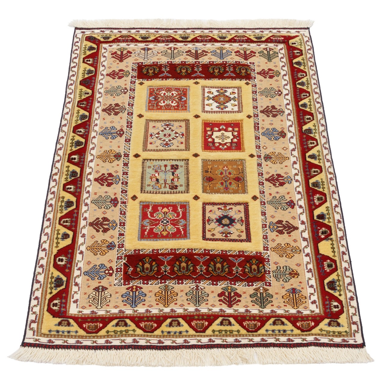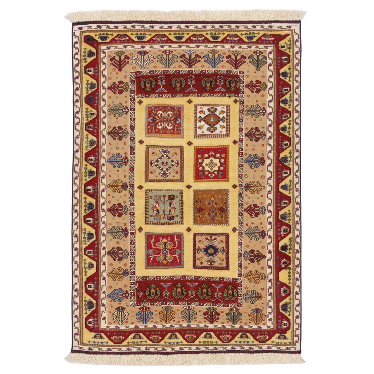 Handwoven Sirjan kilim rug, 80 × 120 cm (2'7" × 3'11"), with an area of 0.96 m² (10.33 ft²). Woven at approximately 2,500 knots/dm². The kheshti (panel) design presents diverse geometric motifs laid out like orderly windows over a world of balance and color. Each panel contains a universe of rhythmic repetitions and native forms rooted in Iranian beliefs and traditional architecture. A cream field paired with a light-beige border imparts a pleasant sense of calm and coordinates easily with a range of interior styles. This piece is woven entirely in natural, all-wool fibers. With its geometric repetitions and interplay of colors, it captivates the viewer—a kilim rug that is not only a practical floor covering but also a work of art.