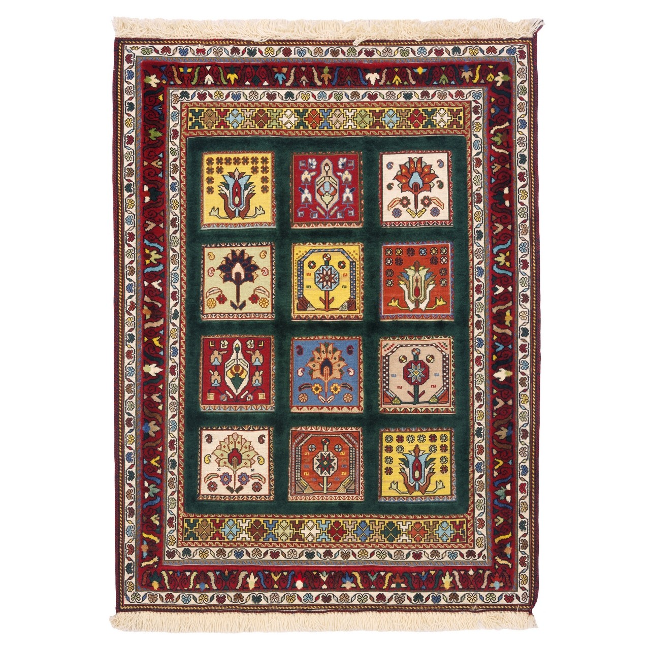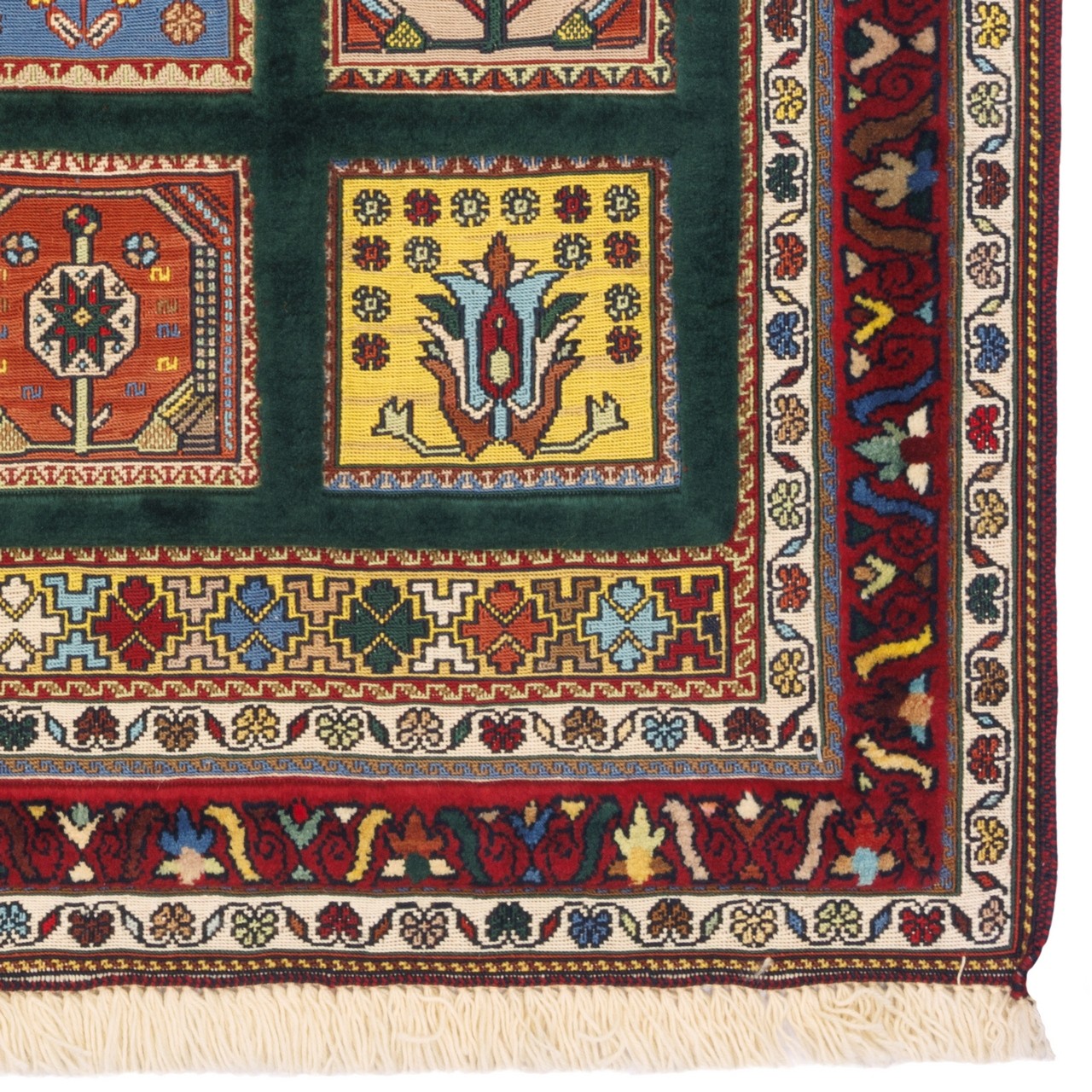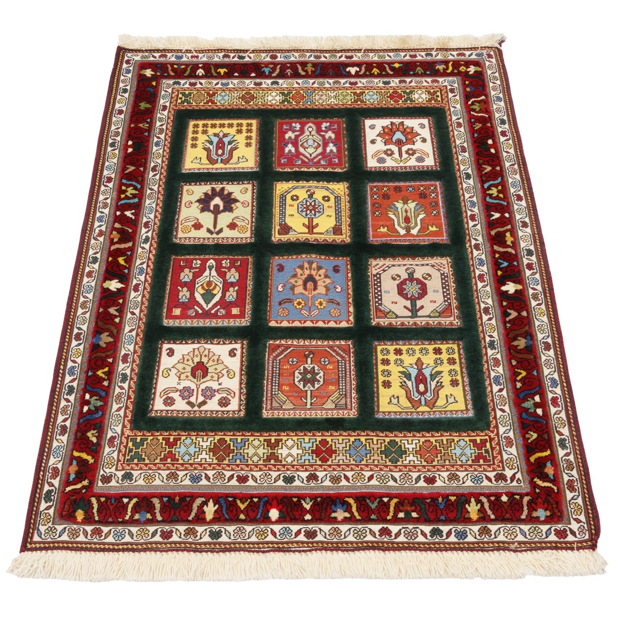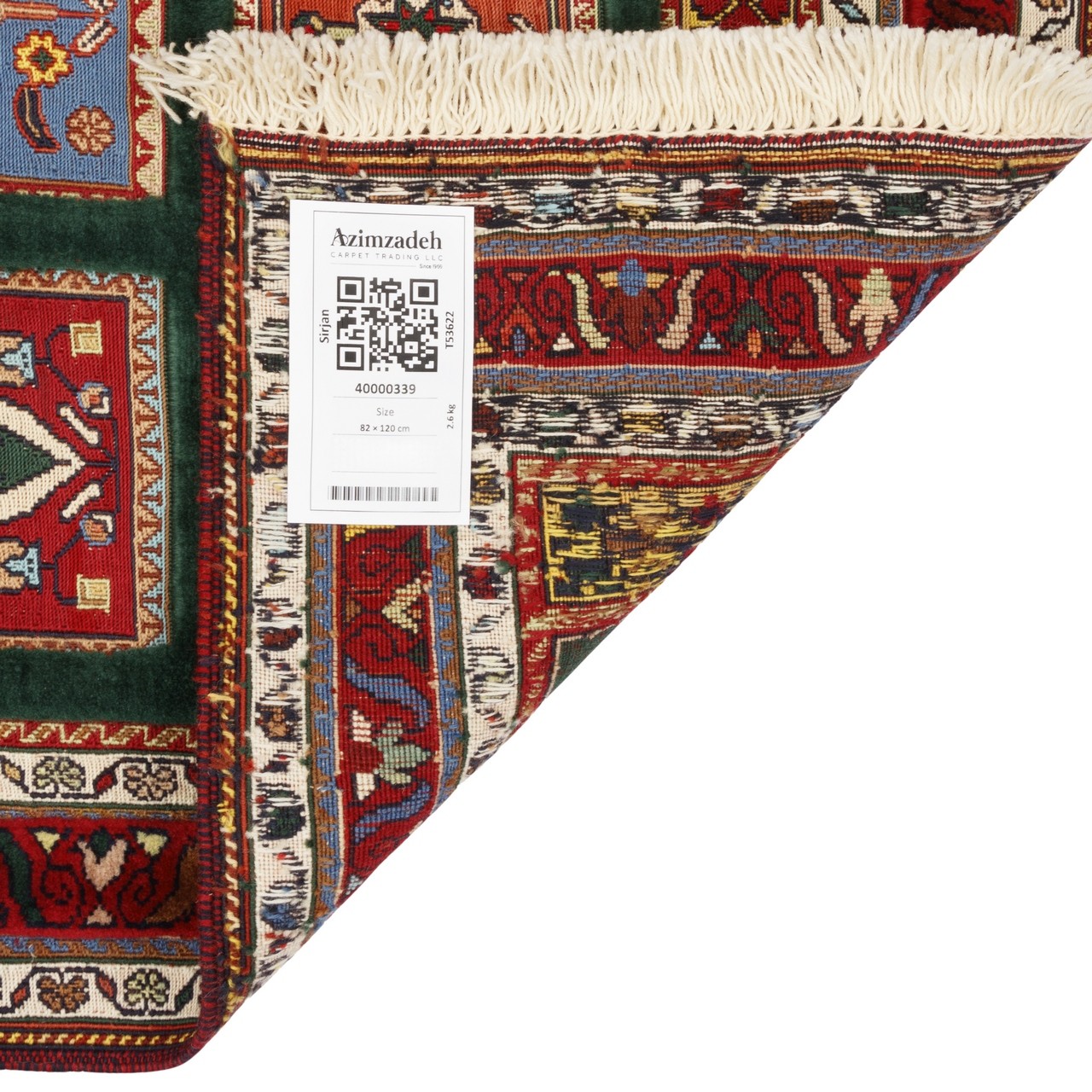 This handwoven Sirjan kilim rug, measuring 82 × 120 cm (2'8" × 3'11") with an area of 0.99 m² (10.66 ft²), is woven in a khesti (panel) design. It is produced in an all-wool construction, and its weaving density is approximately 3,200 knots/dm². The khesti layout, with its geometric and orderly structure, conveys a sense of order, balance, and beauty. A jade-green field, with distinctive depth and calm, evokes freshness and stability, while the madder-red border forms a warm, powerful frame for this eye-catching artistry.