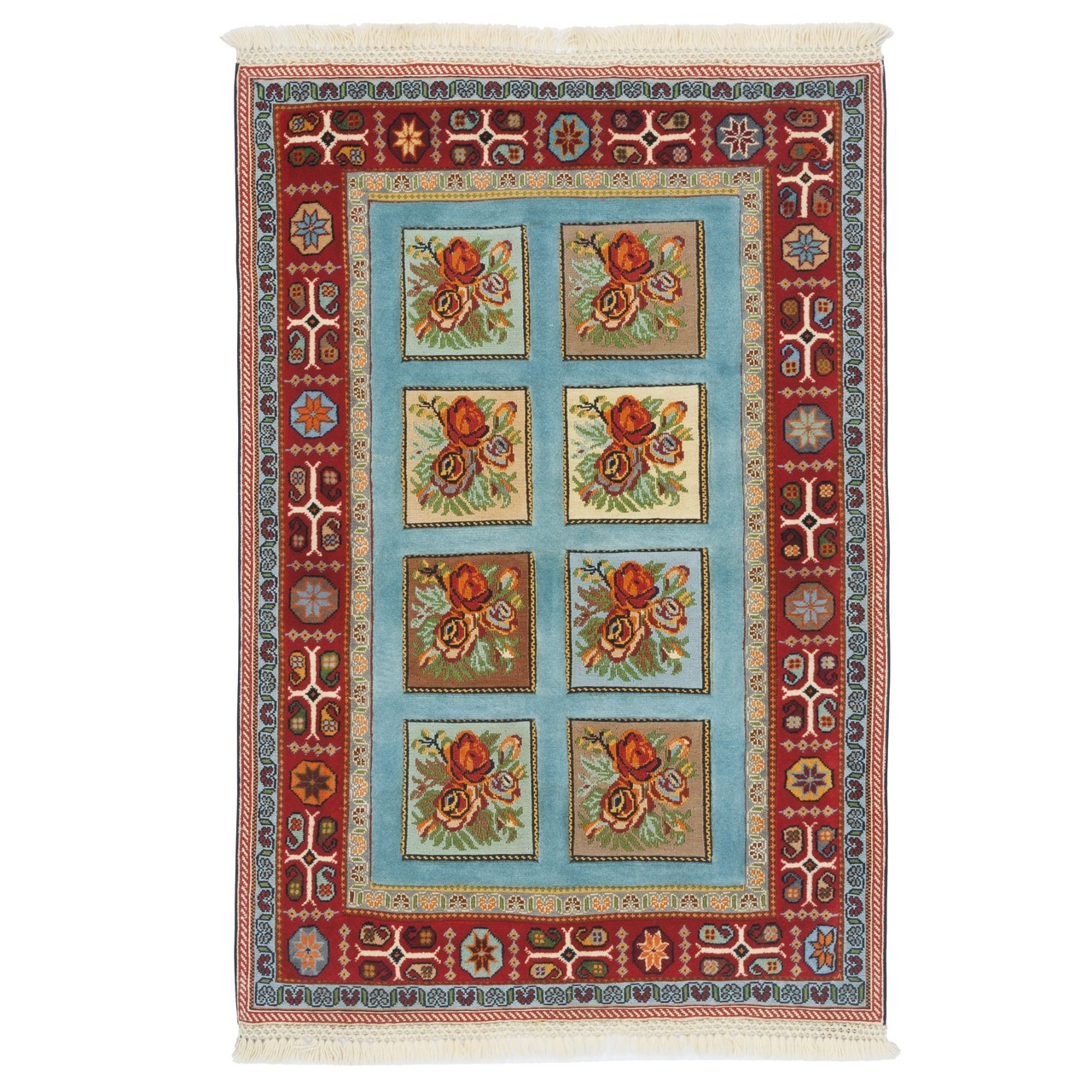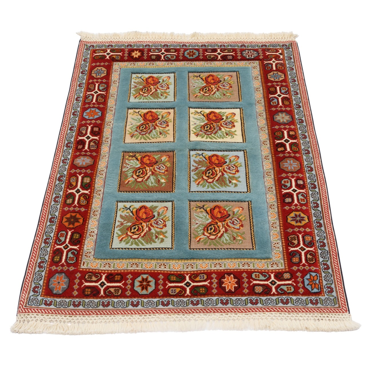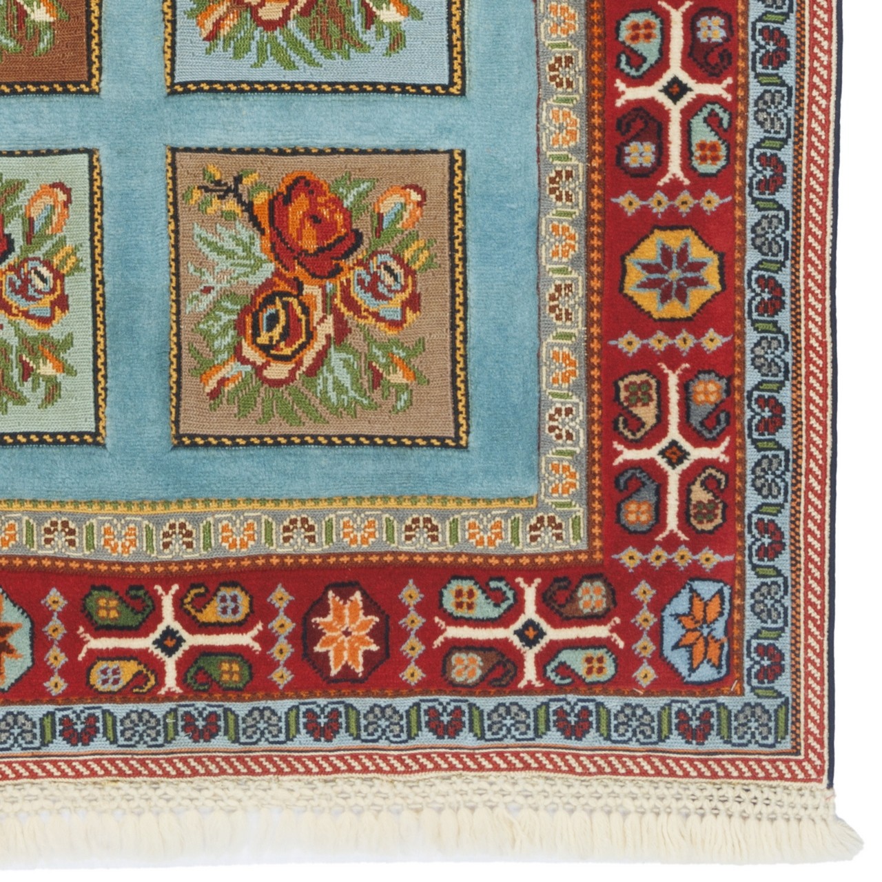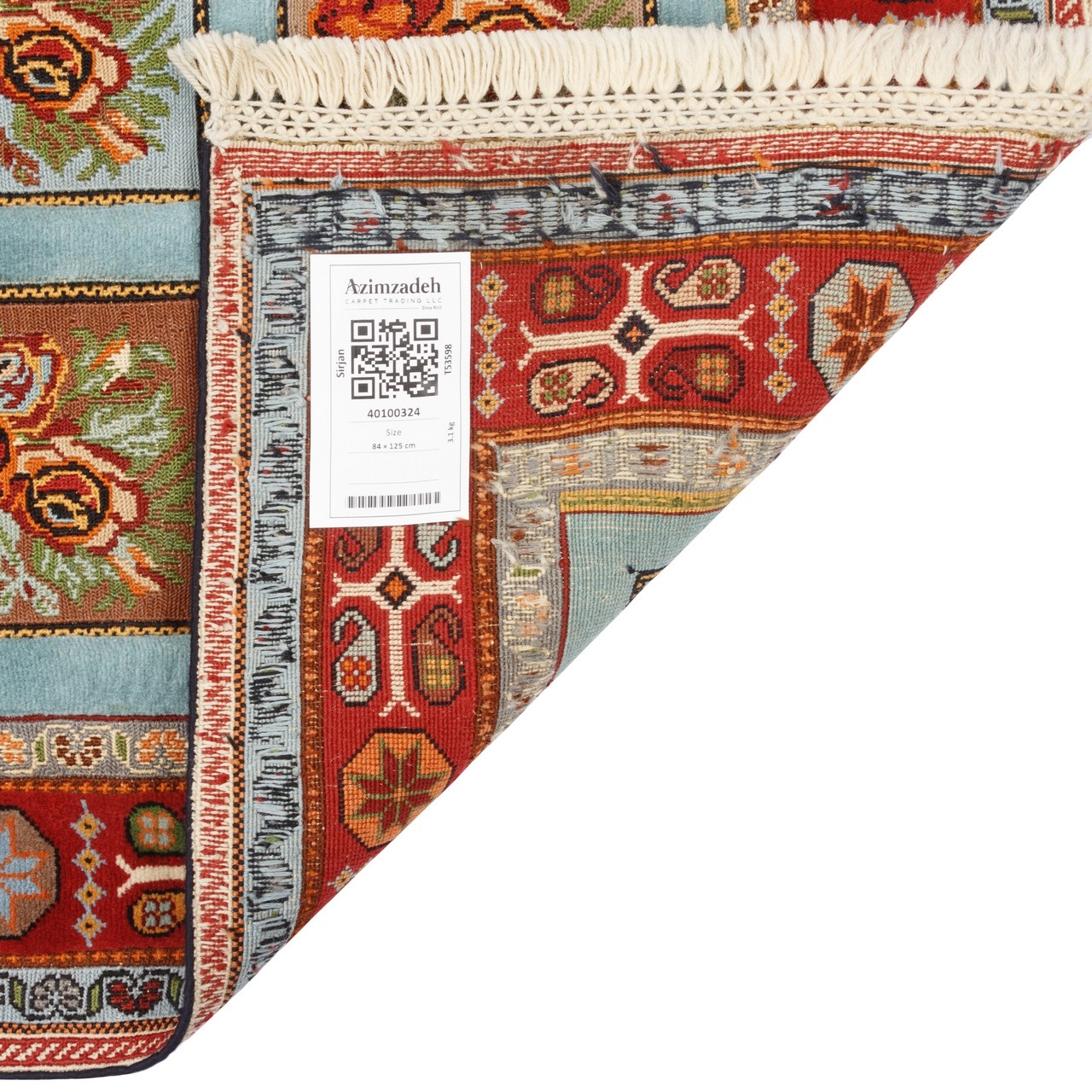 This Sirjan kilim rug, measuring 84 × 125 cm (2'9" × 4'1") with an area of 1.05 m² (11.30 ft²), is woven in a khesti design. The kilim is all-wool, and its weaving density is approximately 2,500 knots/dm², attesting to the weaver’s precision and skill. It represents traditional beauty expressed with a fresh narrative. The khesti layout in this piece draws inspiration from Iranian architectural geometry, and within each panel, delicate floral motifs appear as though depicting a garden of imagination. Its floral character, coupled with a turquoise field and a madder-red border, creates a refined and striking contrast that enlivens and refreshes its surroundings.