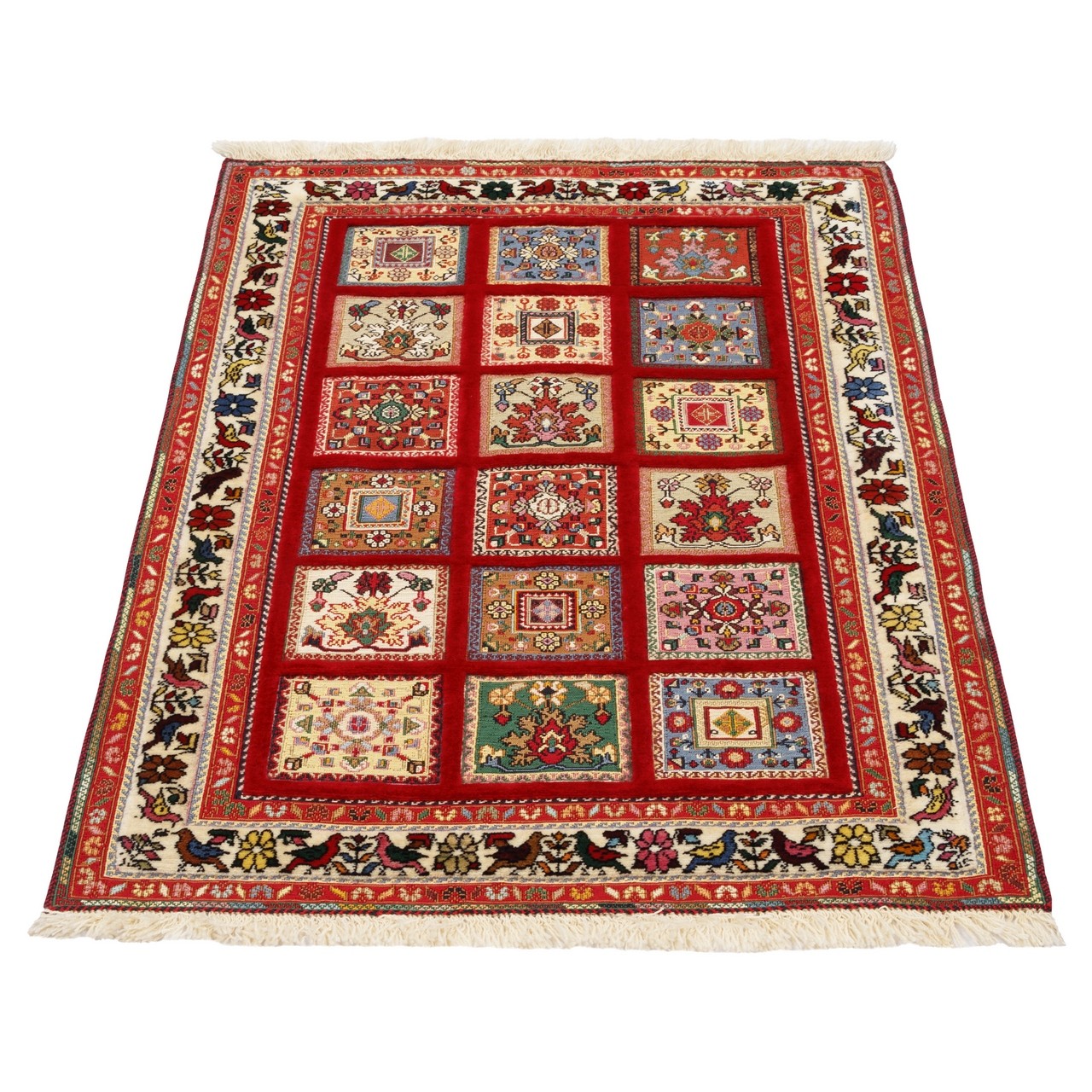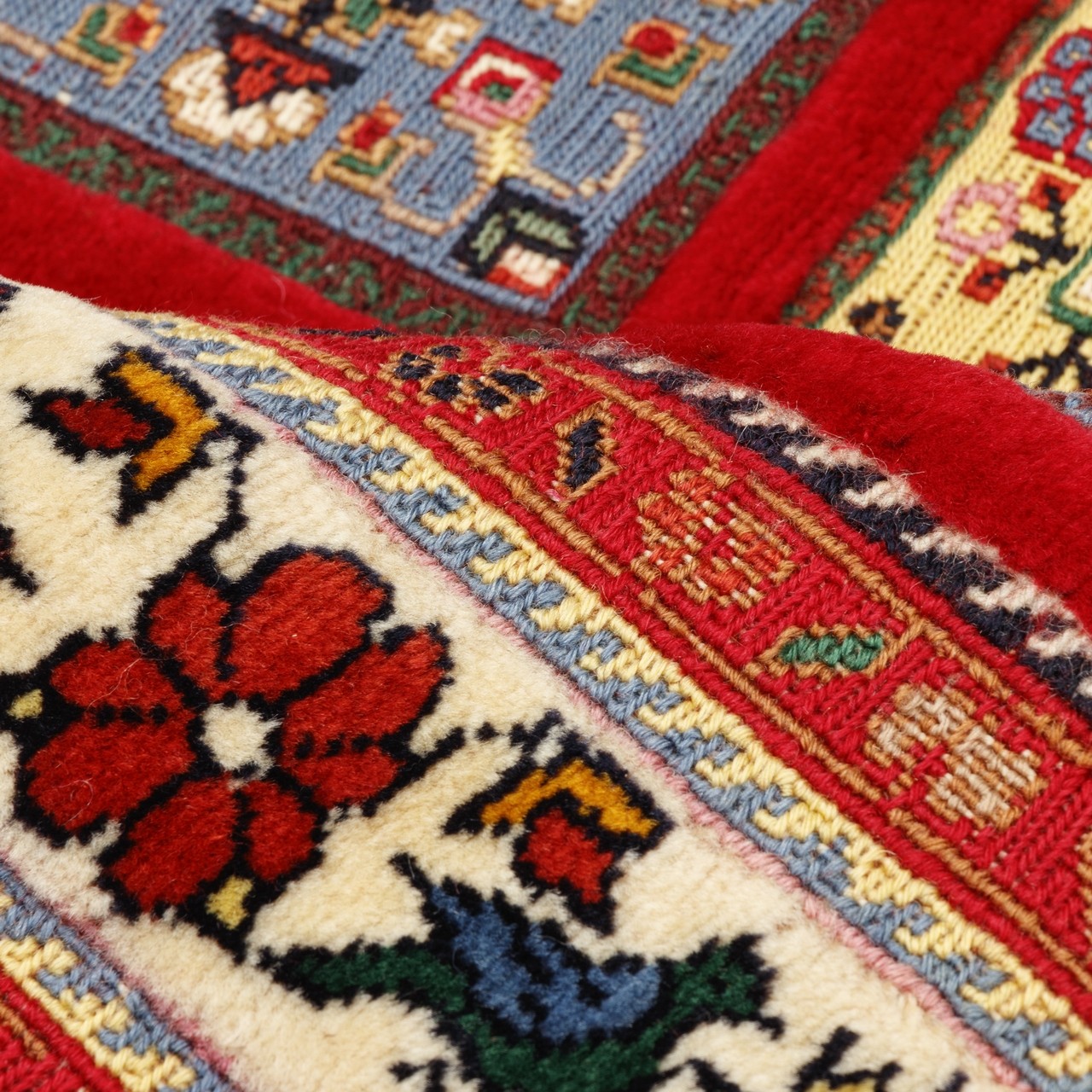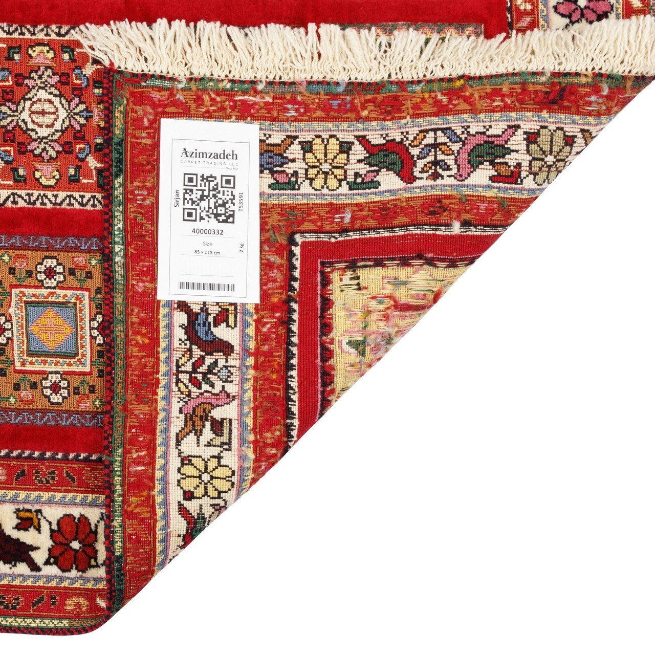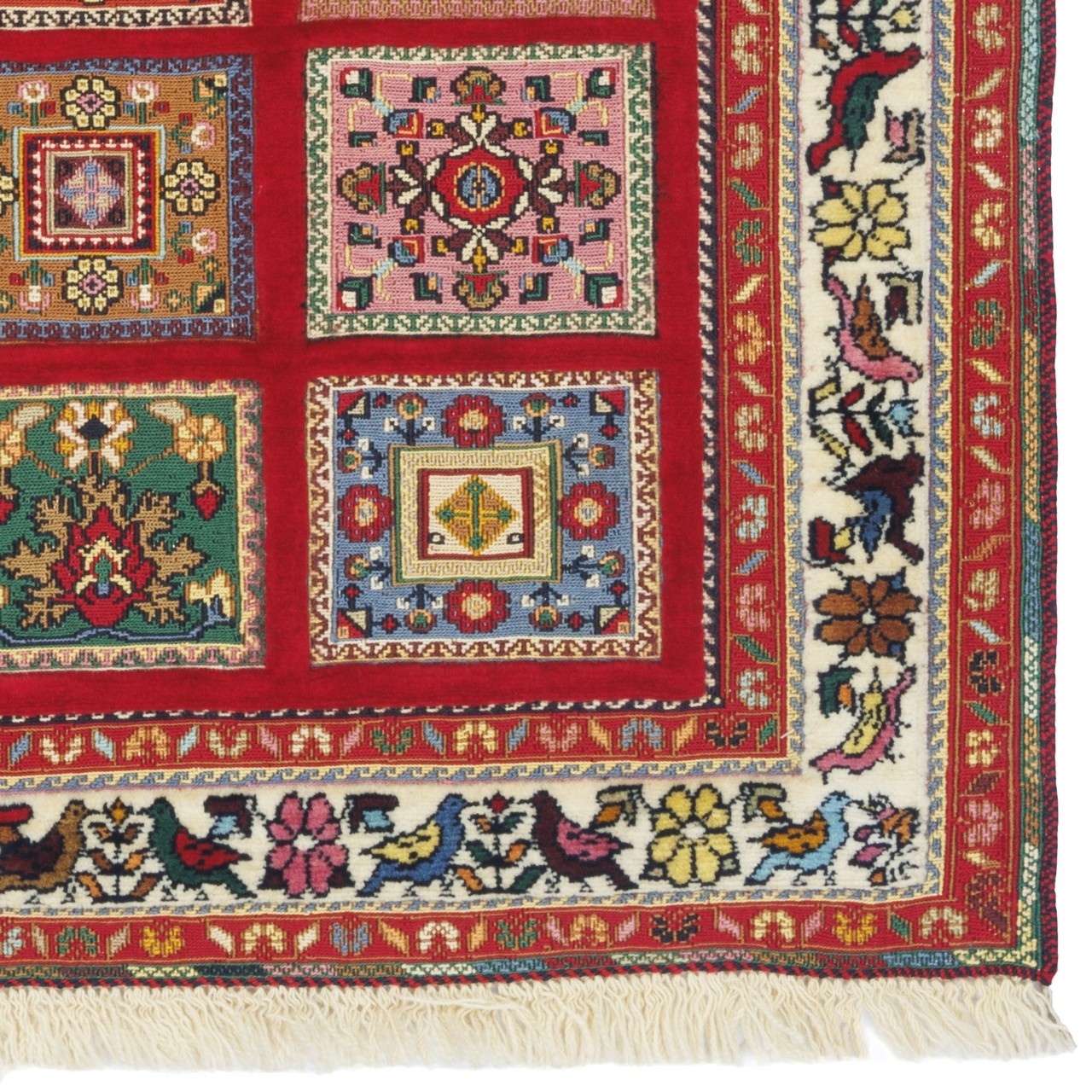 This handwoven Sirjan kilim rug, measuring 85 × 115 cm (2'9" × 3'9") with an area of 0.98 m² (10.55 ft²), is woven in a khesti (panel) design. Its weaving density is 2,500 knots/dm², reflecting cohesion in the weave and the artisan’s precision. The khesti layout, formed by the orderly repetition of small frames, creates unity and harmony. A deep madder-red ground, in full accord with the cream border, yields a balanced, classic, and eye-catching composition. The all-wool fibers provide natural softness, resilience, and warmth, making this piece a distinguished choice for everyday use and for both traditional and modern interiors. This handwoven kilim is not merely utilitarian; it is part of Iran’s kilim-weaving art.