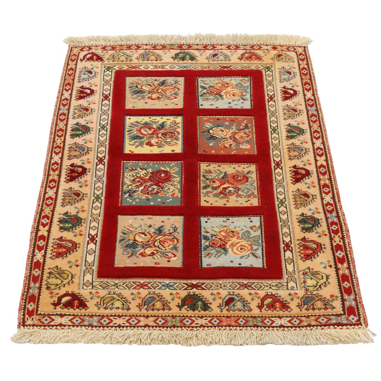 This handwoven Sirjan kilim rug, measuring 85 × 117 cm (2'9" × 3'10") with an exact area of 1.00 m² (10.76 ft²), is crafted in a khesti (panel) design. The kilim has a weaving density of approximately 2,500 knots/dm² and is produced in an all-wool structure, standing as a distinguished example of the authentic art of Iranian kilim weaving. The khesti design creates an orderly and structured composition of floral panels, each resembling a small garden of imagination and color. The floral motifs within each frame are delicately and harmoniously designed. The madder-red background lends a pleasant warmth and a classical richness to the piece, while its striking harmony with the cream-colored border engages the eye with an exceptional balance of color and form. The natural wool used in both warp and weft not only ensures durability but also provides the rug with a soft and pleasing texture. This work is not merely a symbol of precision and mastery in execution but also a reflection of the visual culture of a people who weave every thread with love, meaning, and identity.