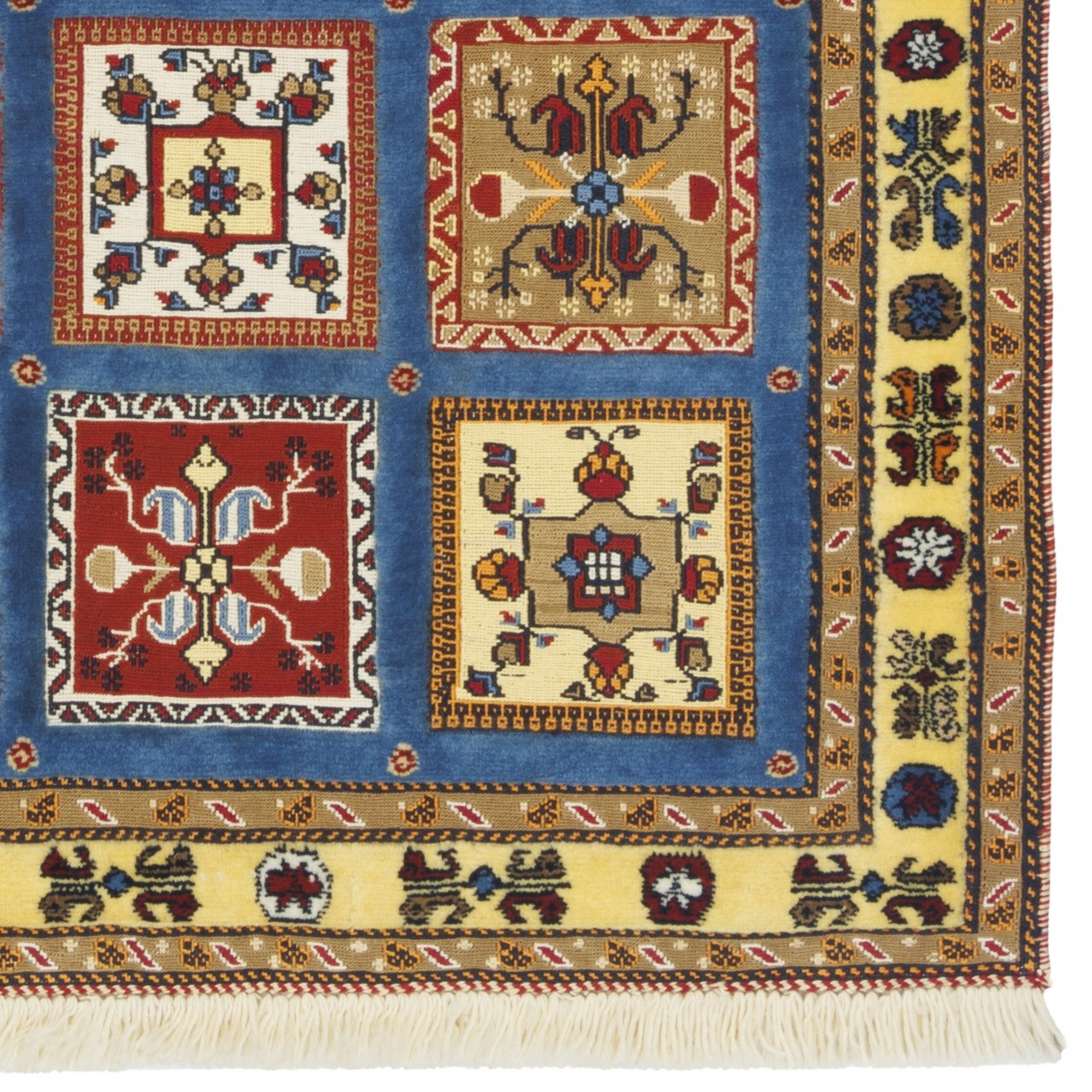 This handwoven Sirjan kilim-rug measures 85 × 120 cm (2'9" × 3'11") with a surface area of 1.02 m² (10.98 ft²). Crafted in an all-wool construction at 2500 knots/dm², it balances firmness with authenticity for a practical yet artful choice. The khesti (panel) design employed here relies on a geometric, orderly structure that frames small panels of traditional motifs. A calm, lustrous blue field lends serenity to the rug, while the cream border creates a balanced yet fresh palette that coordinates well with a wide range of interiors. Its all-wool composition brings natural warmth and softness to the environment.