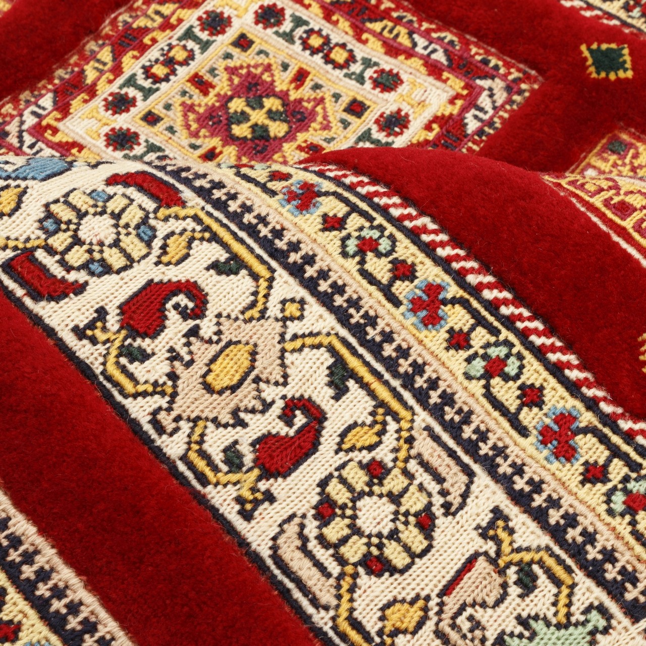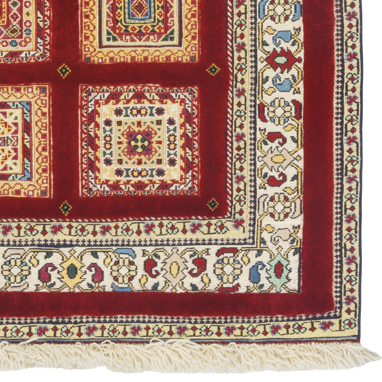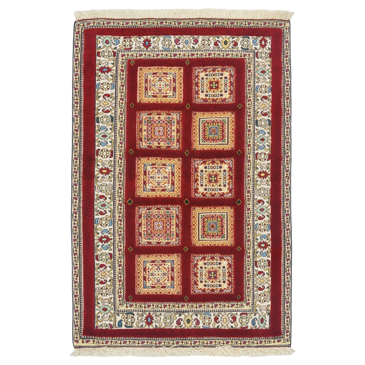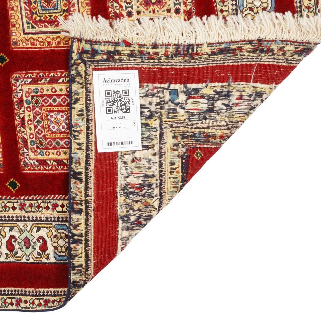 This handwoven Sirjan kilim rug, measuring 85 × 120 cm (2'9" × 3'11") with an area of 1.02 m² (10.98 ft²), is woven in a khesti (panel) design. Made in an all-wool construction, its weaving density is approximately 2,500 knots/dm². The khesti layout used in this kilim is inspired by the order of Iranian architecture. A madder-red ground, paired with a cream border, creates a measured and balanced contrast that enhances the rug’s beauty. The use of natural wool, in addition to durability, brings a sense of warmth and intimacy to the space.