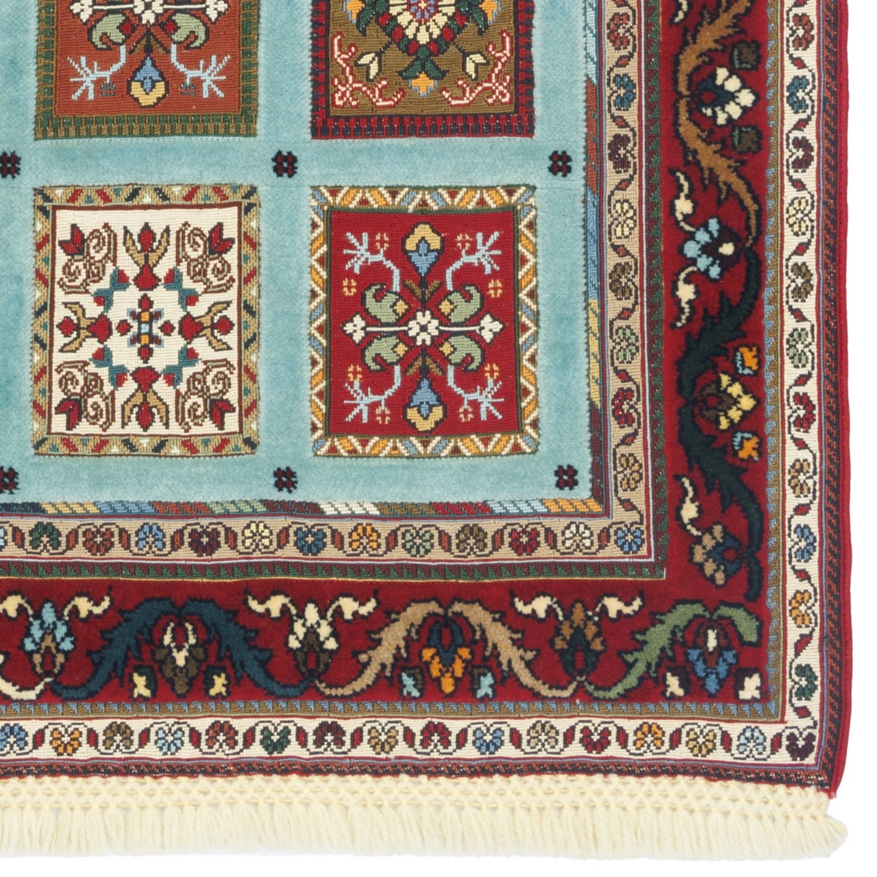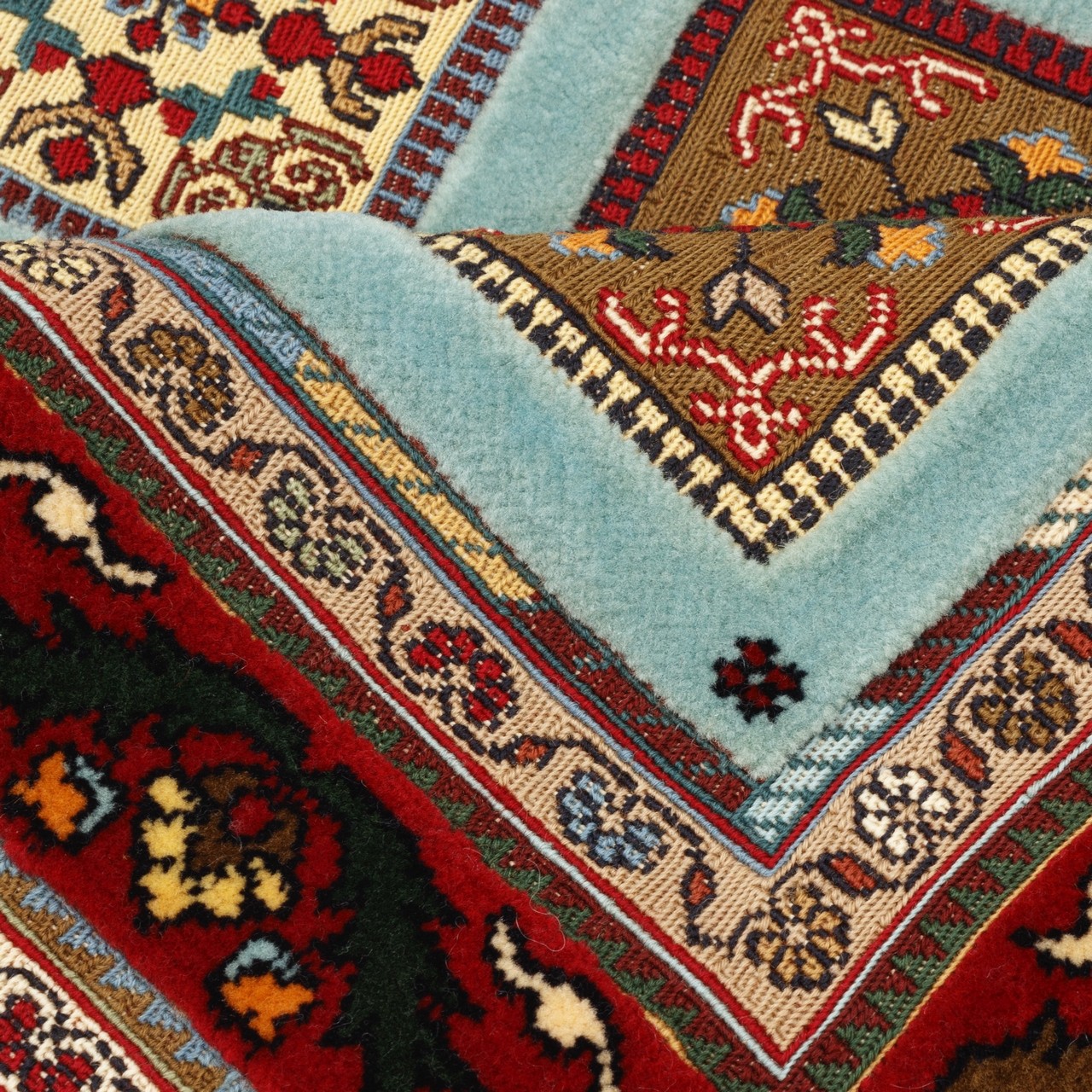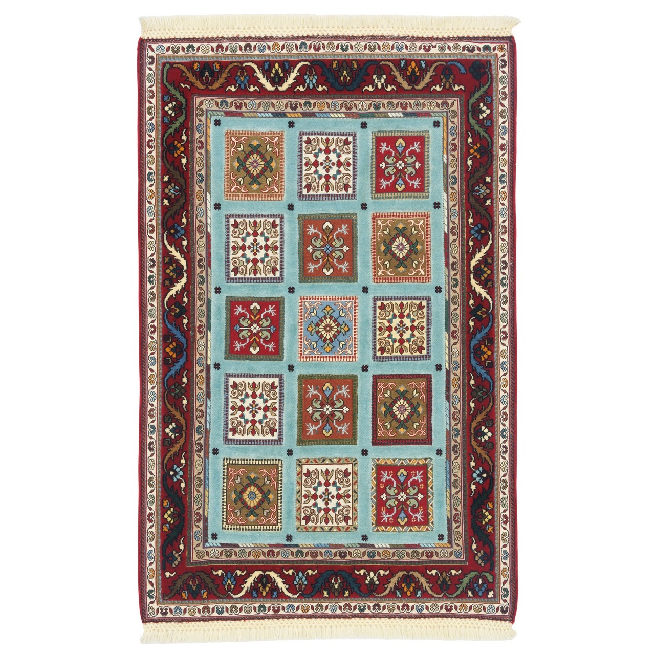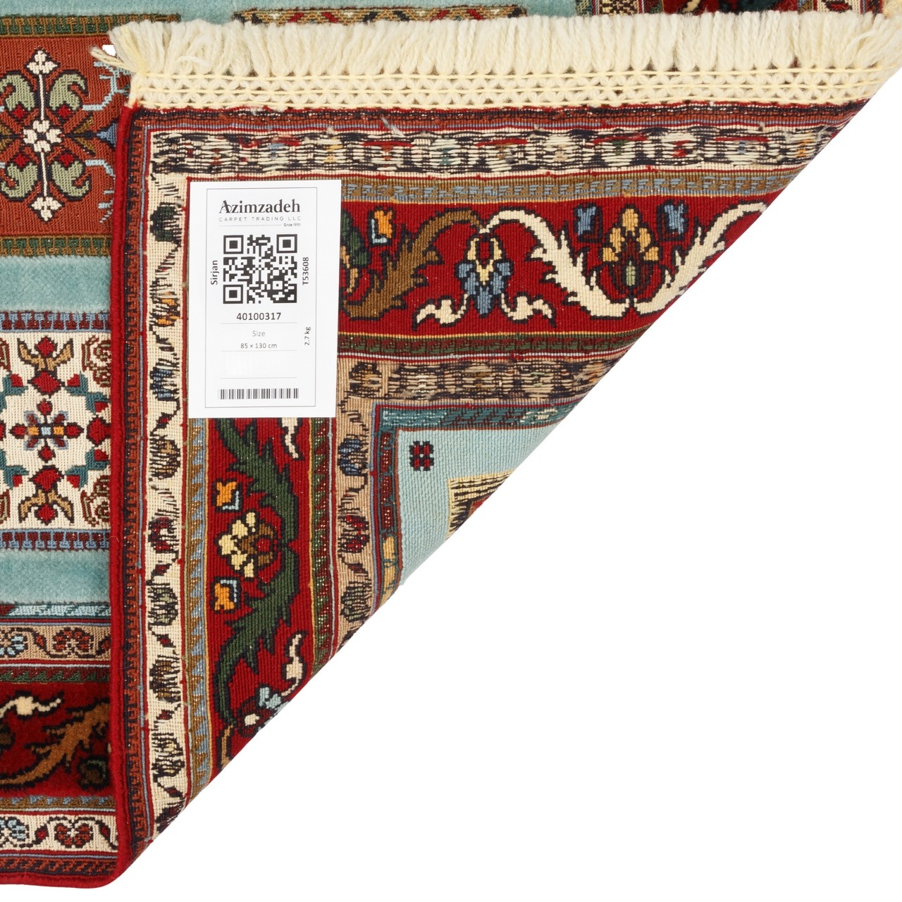Handwoven Sirjan kilim-rug measuring 85 × 130 cm (2'9" × 4'3") with an area of 1.11 m² (11.95 ft²). Crafted all-wool, the weave fineness corresponds to approx. 3,200 knots/dm², reflecting notable precision and structural regularity. The kheshti (panel) design presents a disciplined array of small geometric frames, each acting like a window onto traditional motifs and forms. A turquoise field set against a lacquer-red border creates a poised, intelligent contrast that enhances visual impact while remaining versatile for both modern and classic interiors. Natural wool throughout imparts softness, warmth, and long-lasting durability, underscoring the piece’s authenticity.
