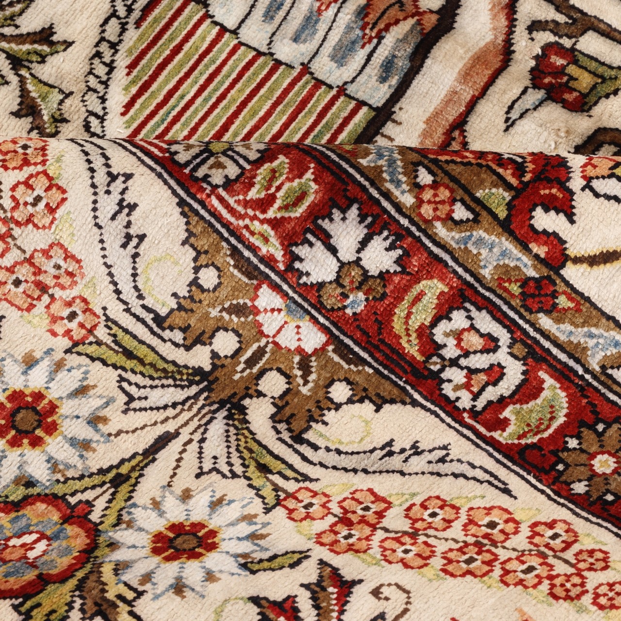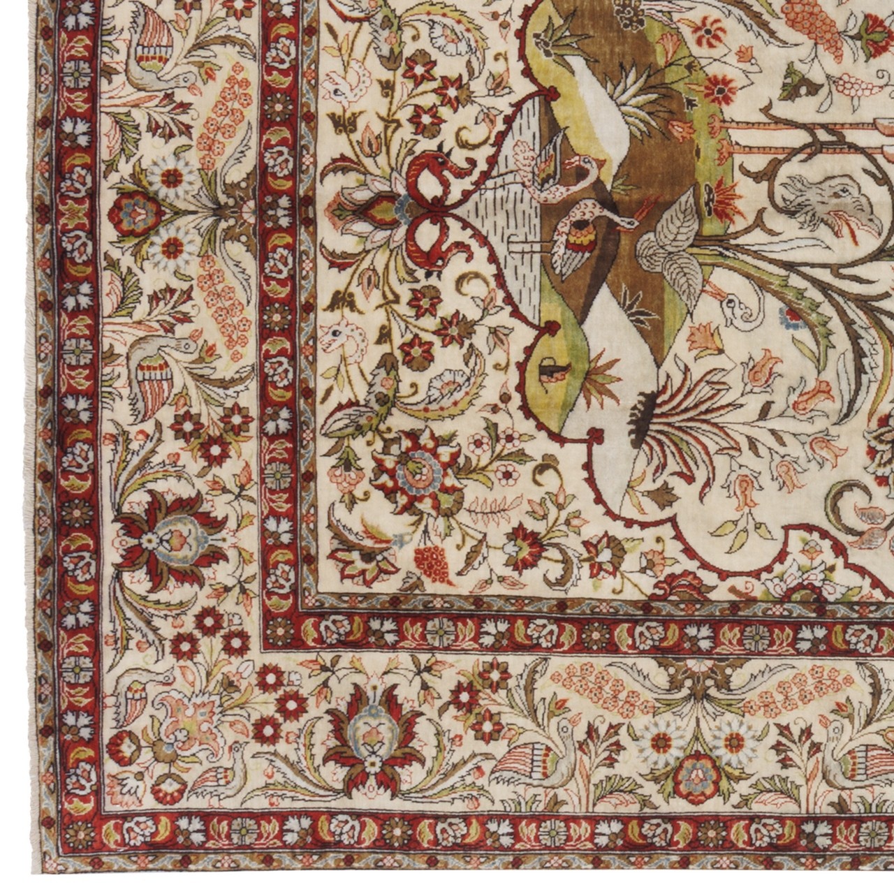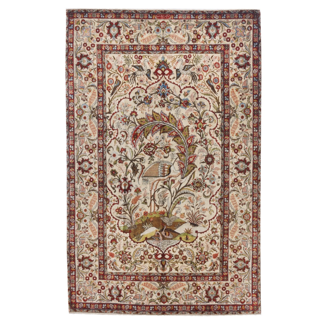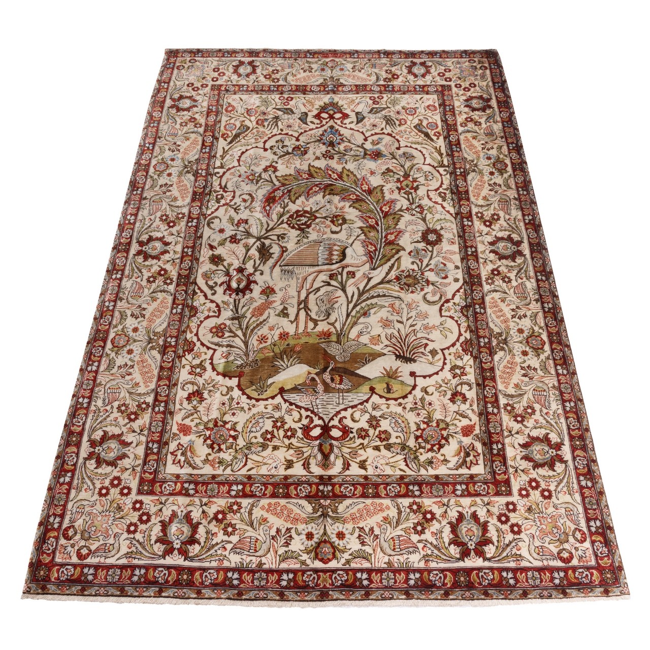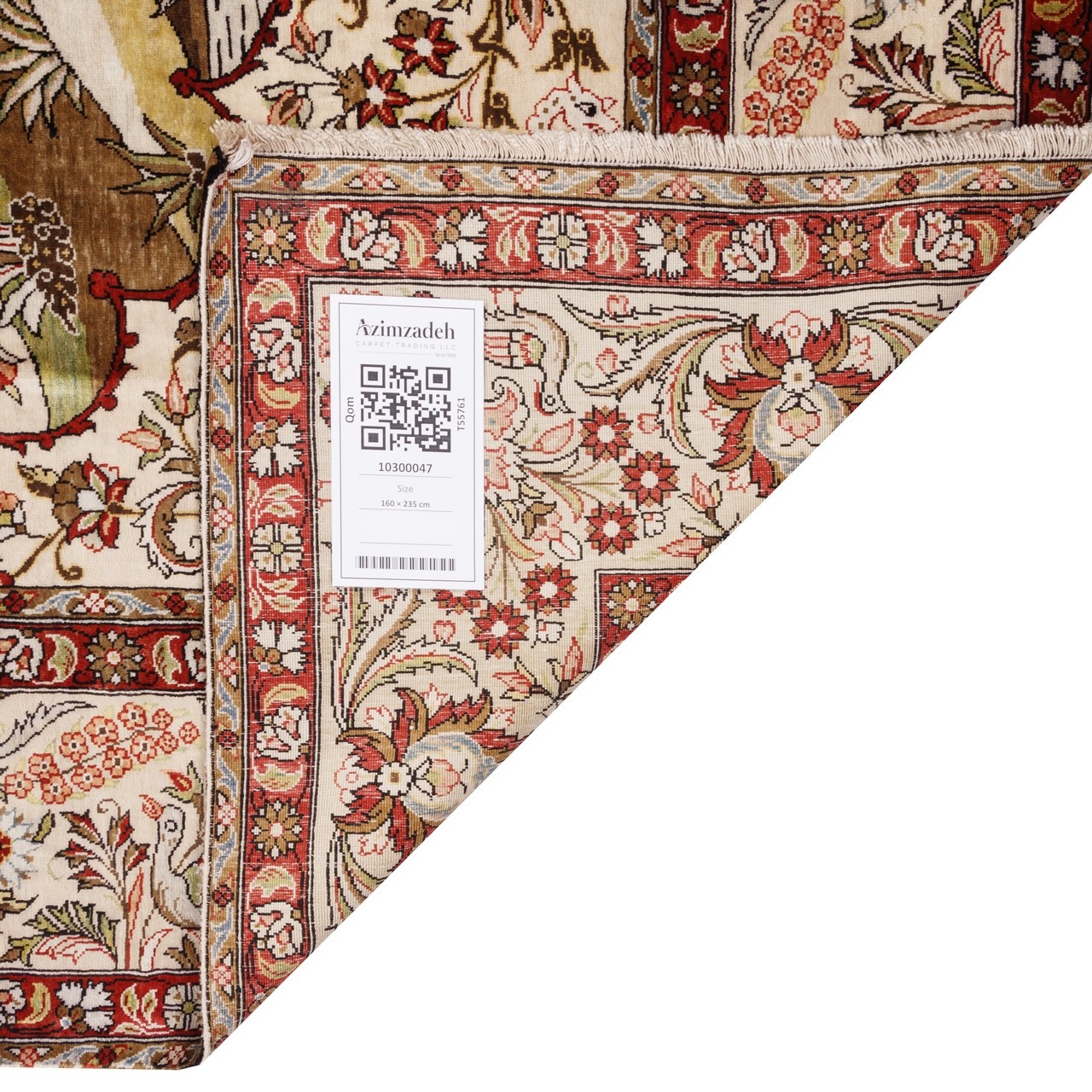 This all-silk handwoven Qom rug in an all-over design, measuring 160 × 235 cm (5'3" × 7'9") with an area of 3.76 m² (40.47 ft²) and a weaving density of about 5,100 knots/dm², is one of the purest expressions of Qom carpet artistry. Using pure silk in both warp and weft endows the rug with a luminous, soft, and lightweight handle; it is not only visually captivating but also offers a touch that is an experience of unalloyed delicacy. These qualities grant the palette a distinctive depth and sheen that shift and come alive in the light. The all-over composition with bird motifs—especially a depiction of the hoopoe or stork at the center—reflects an imaginative vision of Eastern nature: birds, free and unbound, as if in flight among branches and blossoms. In Iranian art, the bird symbolizes the soul, freedom, and release; its presence here is not merely decorative but a poetic statement of the search for meaning. A cream field and cream border create a calm, noble, and harmonious accord that clears the space of clutter and invites contemplation. This rug is not just an eye-catching adornment but a mirror of majestic simplicity and visual balance.