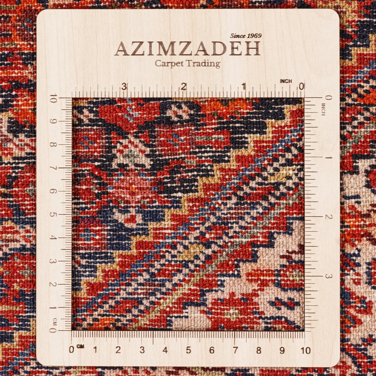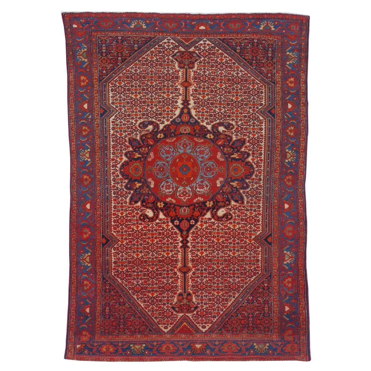 This antique handwoven Malayer rug, in a refined and intricate medallion-and-corner design, not only recalls the grandeur of classical Iranian carpets but also reflects a vivid, breathing creativity in its weaving. Measuring 130 × 190 cm (4'3" × 6'3") with an area of 2.47 m² (26.59 ft²), and woven at approximately 6,200 knots/dm², it belongs to the very fine category—evidence of the exceptional skill of Malayer weavers who set each knot with patient, discerning hands. A high-quality wool pile on a cotton warp is laid over a calming cream field, while a blue border introduces a pleasing, thoughtful contrast that stabilizes the composition. The fish motif flowing within the central medallion and the corner spandrels is among the oldest and most cherished patterns in Persian carpets, symbolizing life, blessing, and continuity. More than decoration, this rug carries a message of deep, authentic Iranian aesthetics—an artwork that offers a fresh story of culture and craft with every look.