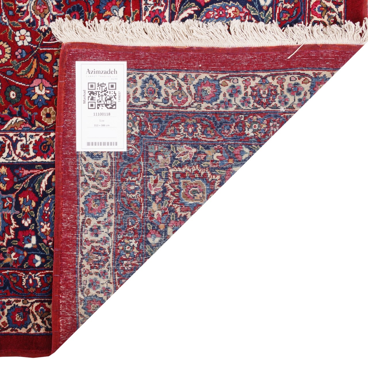 این فرش دستباف آنتیک، با ابعاد ۳۱۰ × ۳۸۶ سانتی‌متر، با مساحتی نزدیک به 11.97 مترمربع و حاصل برند پرآوازه «عمواوغلی»، نمونه‌ای از هنر رفیع قالی‌بافی مشهد است. فرش‌های عمواوغلی نه‌ تنها در میان مردم هنر دوست مشهور شدند، بلکه سفارش‌های دربار پهلوی مانند قالی‌های کاخ سعدآباد و نیاوران را نیز در کارنامه داشتند. طرح افشان، که یکی از محبوب‌ترین سبک‌ها در قالی ایرانی است، در این اثر با دقت و نظم خاصی گسترش یافته؛ گویی گل‌ها در نسیمی نامرئی در حال رقص‌اند، بی‌آن‌که مرکزی وجود داشته باشد. این پراکندگی ظریف، فضای بصری را پویاتر می‌کند و آرامشی لطیف در جان بیننده می‌نشاند. رنگ لاکی گرم در زمینه، با حاشیه‌ی سرمه‌ای عمیق، هارمونی‌ای دلنشین خلق کرده که هم جسور است و هم ترکیبی که به‌خوبی فضای فرش را غنا می‌بخشد. پشم نرم و مرغوب به‌عنوان پرز و نخ پنبه‌ای مقاوم در چله، تضمین‌کننده‌ی دوام و لطافت فرش است.