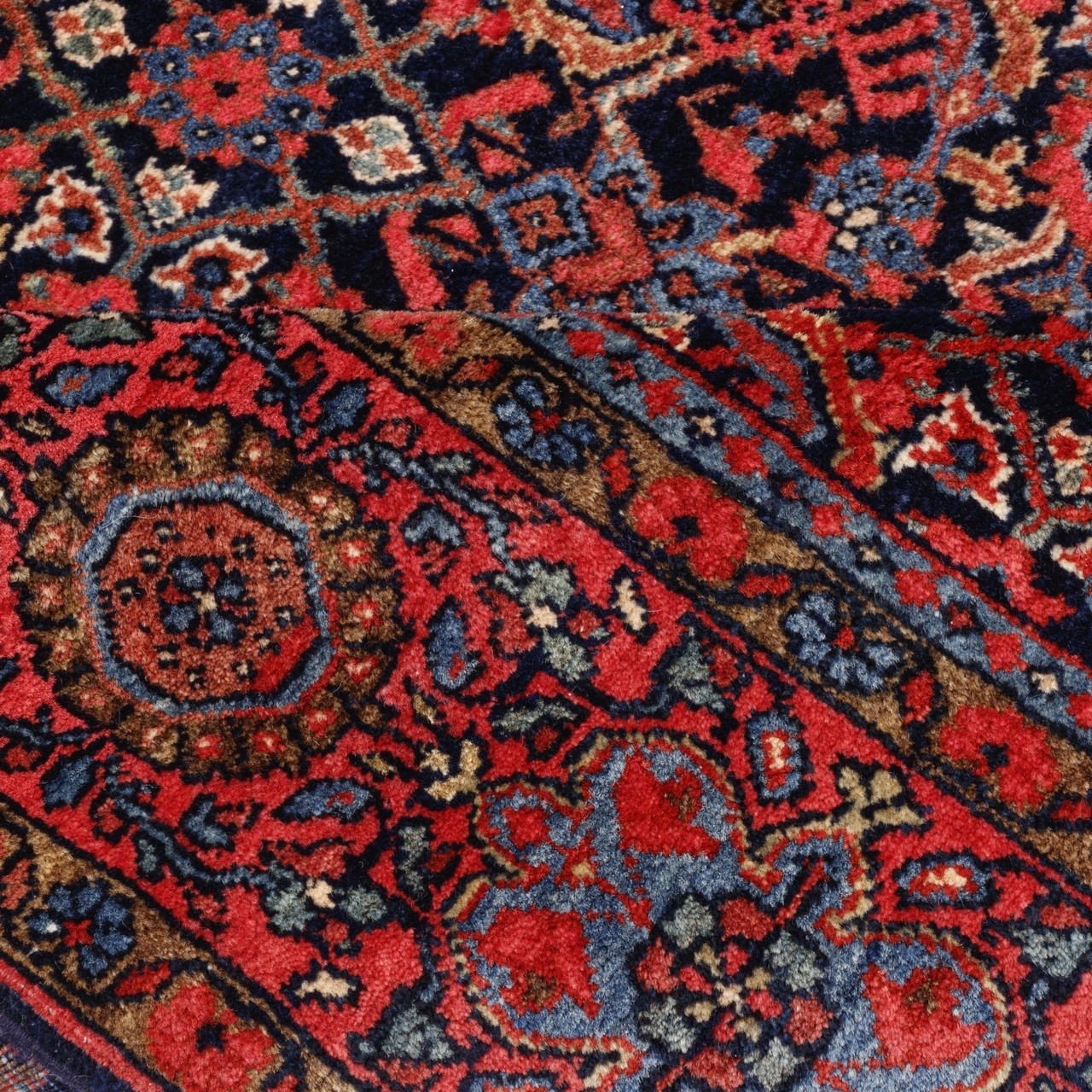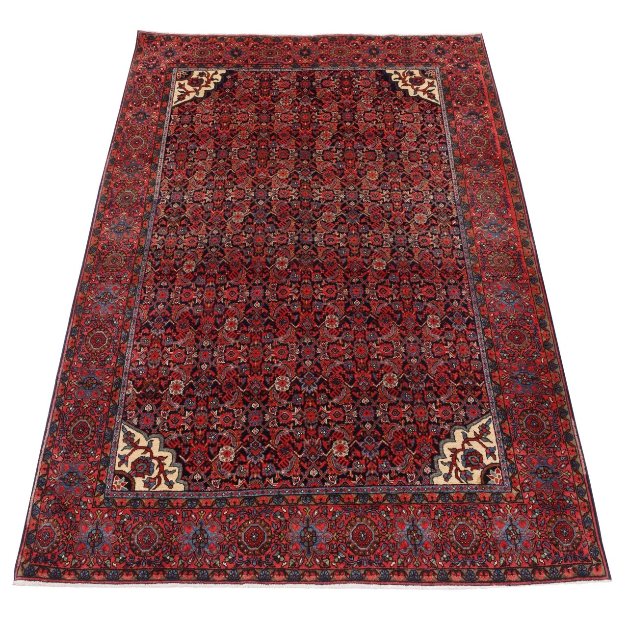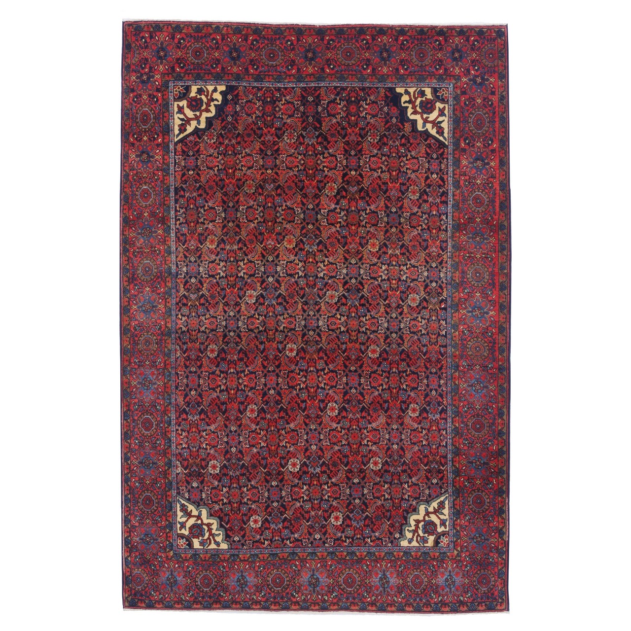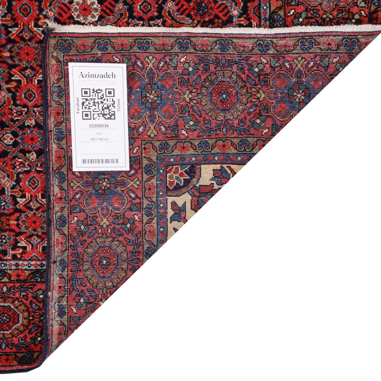این فرش دستباف آنتیک فراهان با طرح سراسر و ترکیب بینظیر رنگها، گویی با هر گرهاش قصهای را از دل تاریخ زمزمه میکند. سرتاسر این فرش با نقش ماهیدرهم و چهار لچک در زمینه بافته شده است. طرح ماهیدرهم، یکی از اصیلترین و کهنترین نقوش قالی ایرانیست که در این اثر با مهارت خاصی پیاده شده و این نقش از نقوش تکرارشوندهی گل و برگهایی هندسی و ریز تشکیل میشود که به شکلی منظم و متقارن، سراسر فرش را در بر میگیرند. اینجا طرح در قالب طرح لچک و ترنج ارائه شده، که بدون ترنج است، اما ویژگی خاص آن در پر شدن کامل متن فرش با موتیفهای کوچک و تکرارشونده است که به آن حالت درهمتنیده میبخشد. زمینهی سرمهایِ عمیق، بستری است دلفریب برای درخشش نقشها؛ در حالی که حاشیهی لاکیرنگ، با طنین گرم و شاداب خود، قاببندی استادانهای برای این روایت تصویری فراهم آورده است. این اثر در ابعاد ۱۳۰ × ۱۹۵ سانتیمتر و با رجشمار ۴۰، با چلهی نخی و پشم مرغوب بافته شده است؛ ترکیبی که دوام، استحکام و نرمی را بهطور همزمان فراهم میآورد. هر گره در این قالی، نشانی است از هنر دستان بافندهای که نه صرفاً تار و پود را در هم تنیده، بلکه روح فراهان را در آن دمیده است.