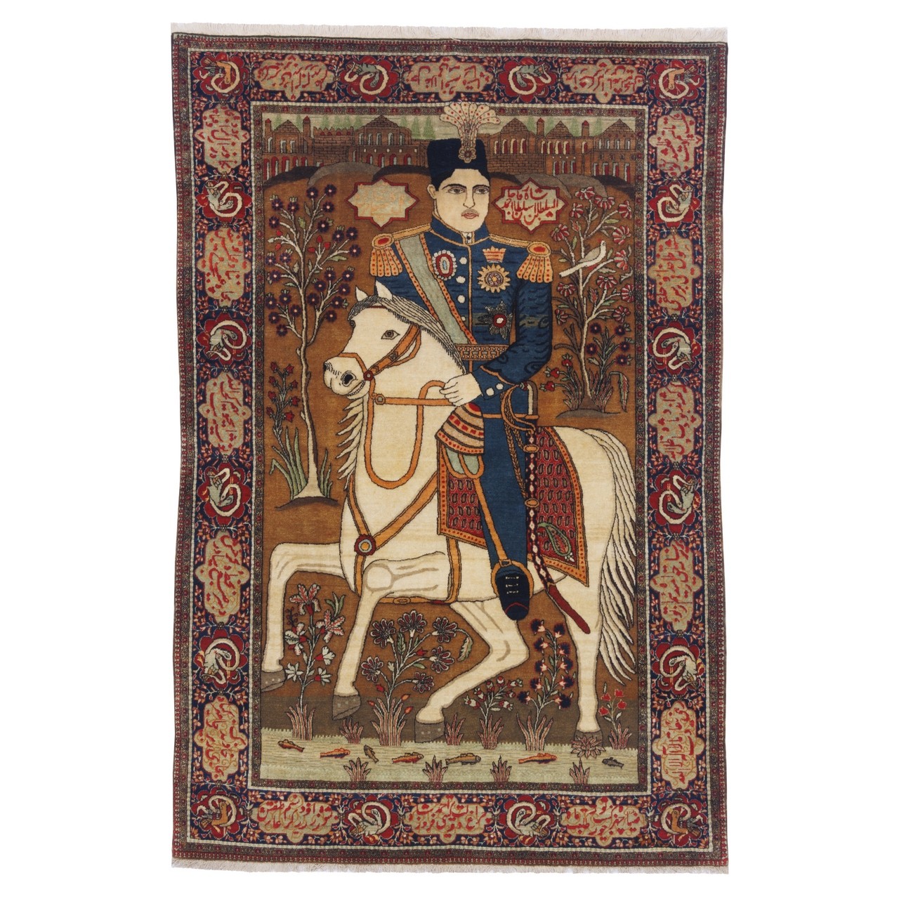 این فرش دستباف آنتیک با طرح سراسر و نقش تصویری از «احمد شاه قاجار» آخرین پادشاه دوره قاجار است و اشعاری در حاشیه‌ی فرش در مدح پاشاه نقش بسته است. روایتی که از دل کارگاه‌های سنتی، با دستان هنرمندی ناشناس از کارخانه «حسینعلی فرشچی» در شهر کاشان بافته شده است. در نخستین نگاه، ترکیب خیره‌کننده‌ی رنگ‌های گرم و سرد در متن، که با حاشیه‌ای اصیل و سرمه‌ای‌رنگ احاطه شده، بیننده را به سفری بصری فرا می‌خواند. این نقش سراسر، نه صرفاً یک ترکیب تصویری، بلکه همچون نگارینه‌ای است از عناصر اسطوره‌ای و نمادهای فرهنگی که در چینش منسجم خود، حسی از تقارن و روایی را به همراه دارد. این فرش مستطیل‌شکل با ابعاد ۱۳۳ × ۲۰۳ سانتی‌متر با مساحت 2.7 مترمربع بافته‌شده با پشم مرغوب و چله‌ی نخی، و با رجشمار ۵۰ رج، نمونه‌ای از مرز بین سنت و دقت فنی در قالیبافی است. برجسته‌سازی در برخی از بخش‌های طرح در حاشیه فرش، نه‌تنها به آن بُعدی ملموس و زنده می‌بخشد، بلکه نشانه‌ای از مهارت بافنده در تلفیق تکنیک با هنر است.