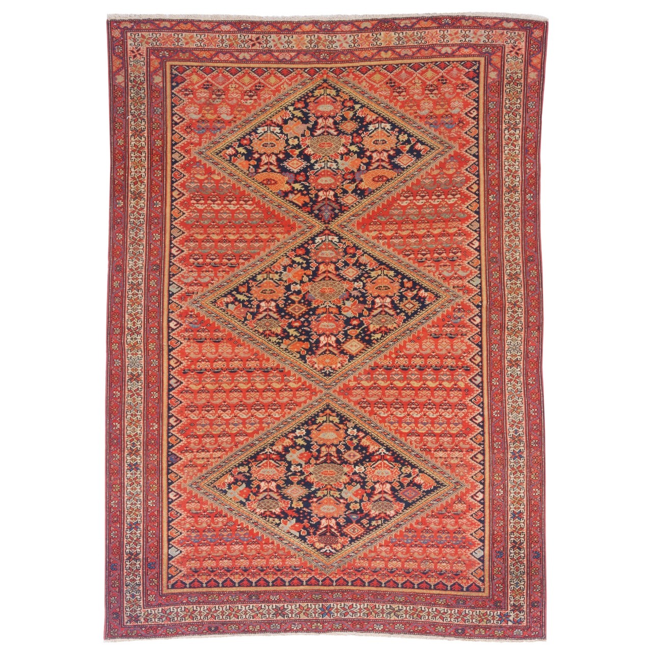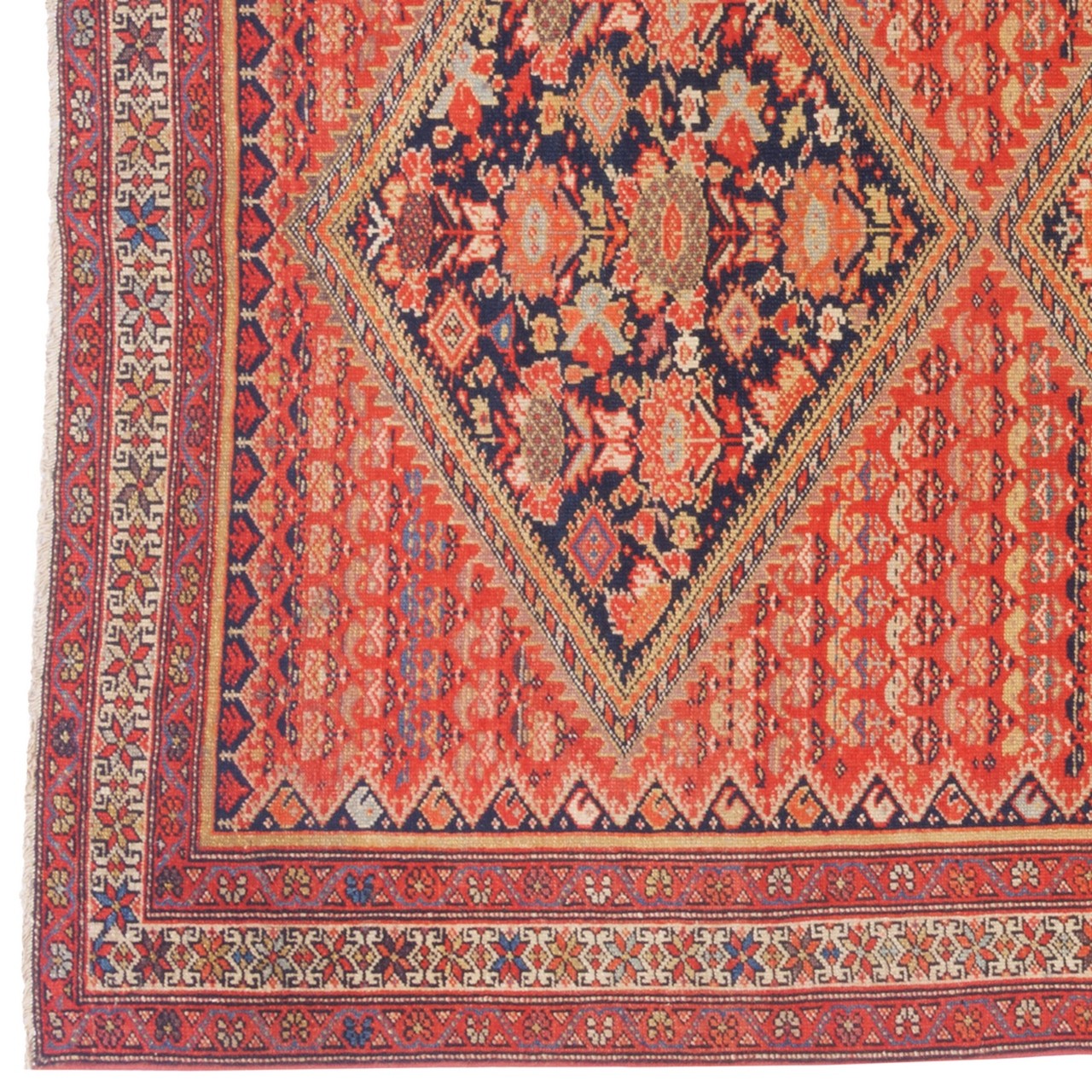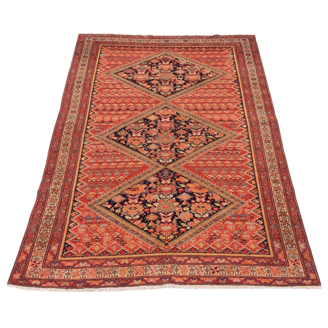 فرش آنتیک ملایر، جلوهای کمنظیر از میراث گرانبهای ایرانی است که در دل خطه هنرپرور استان همدان، به دستان توانمند بافندگان ملایری خلق شده است. این اثر منحصر بهفرد، طرحی زیبا و چشمنواز با نام سه ترنج را در خود جای داده؛ طرحی که با تکرار منظم و هندسی ترنجها، نمادی از نظم، تعادل و هماهنگی در هنر اصیل ایرانی را به نمایش میگذارد. در این طرح، از آرایههای فرش از گلهای متفاوت؛ همچون گل سرخ را نیز به تصویر کشیدهاند. نقوش هندسی ظریف و هنرمندانه این فرش، تداعی کننده باغهای ایران و بیانگر ذوق و خلاقیت خاص هنرمندان این منطقه است. زمینهای به رنگ گرم و دلنشین لاکی، فضایی مملو از شور، اصالت و انرژی را به این فرش بخشیده و در کنار حاشیهای کرمرنگ و آرامش بخش، ترکیبی متضاد و در عین حال متوازن را خلق کرده است. بافت ظریف و دقیق این فرش با تراکم ۵۰ رج، نشانهای از دقت فوقالعاده بالای بافت آن است که هر گره را به شکل منظم و دقیق در دل تار و پود جای داده است. این ویژگی، ظرافت چشمگیری به این اثر داده که برای علاقهمندان به فرشهای نفیس ایرانی بسیار جذاب خواهد بود. جنس مرغوب پشم به همراه چلهای مستحکم از نخ، باعث دوام، نرمی و انعطافپذیری منحصربهفردی در این اثر شده است. ابعاد ۱۲۷ × ۱۷۷ سانتیمتری و مساحت ۲٫۲۵ مترمربعی این فرش، گزینهای ایدهآل برای تزیین فضاهای شیک و لوکس با ابعاد متوسط است. فرش دستباف آنتیک ملایر، بیش از یک اثر دکوراتیو، نمایشی تمام عیار از هنر اصیل و غنی ایرانی است که حضورش در هر فضایی، نشان از سلیقه والا، اصالت و هویت ایرانی دارد.