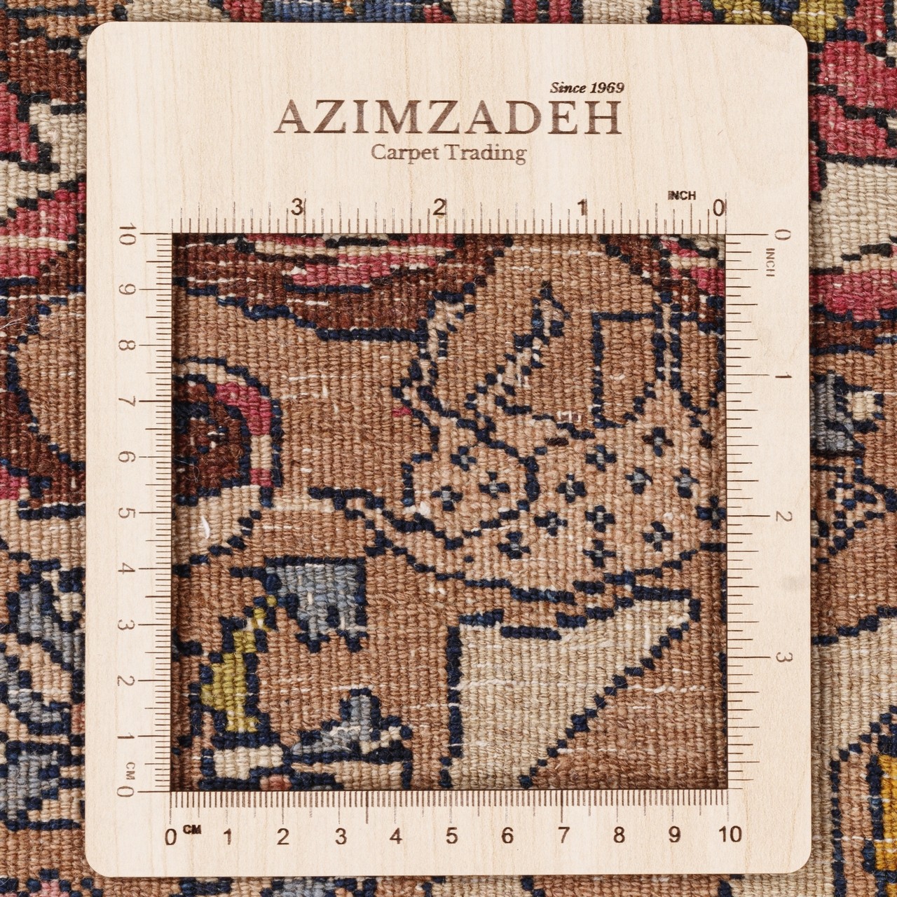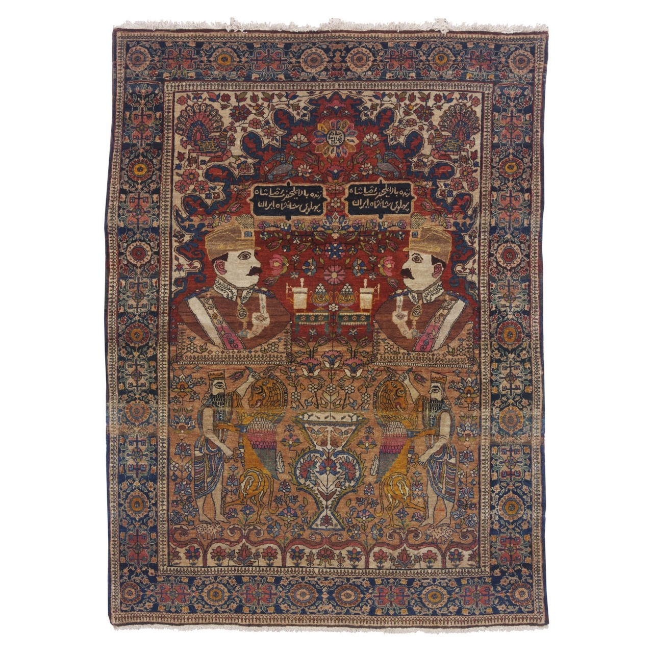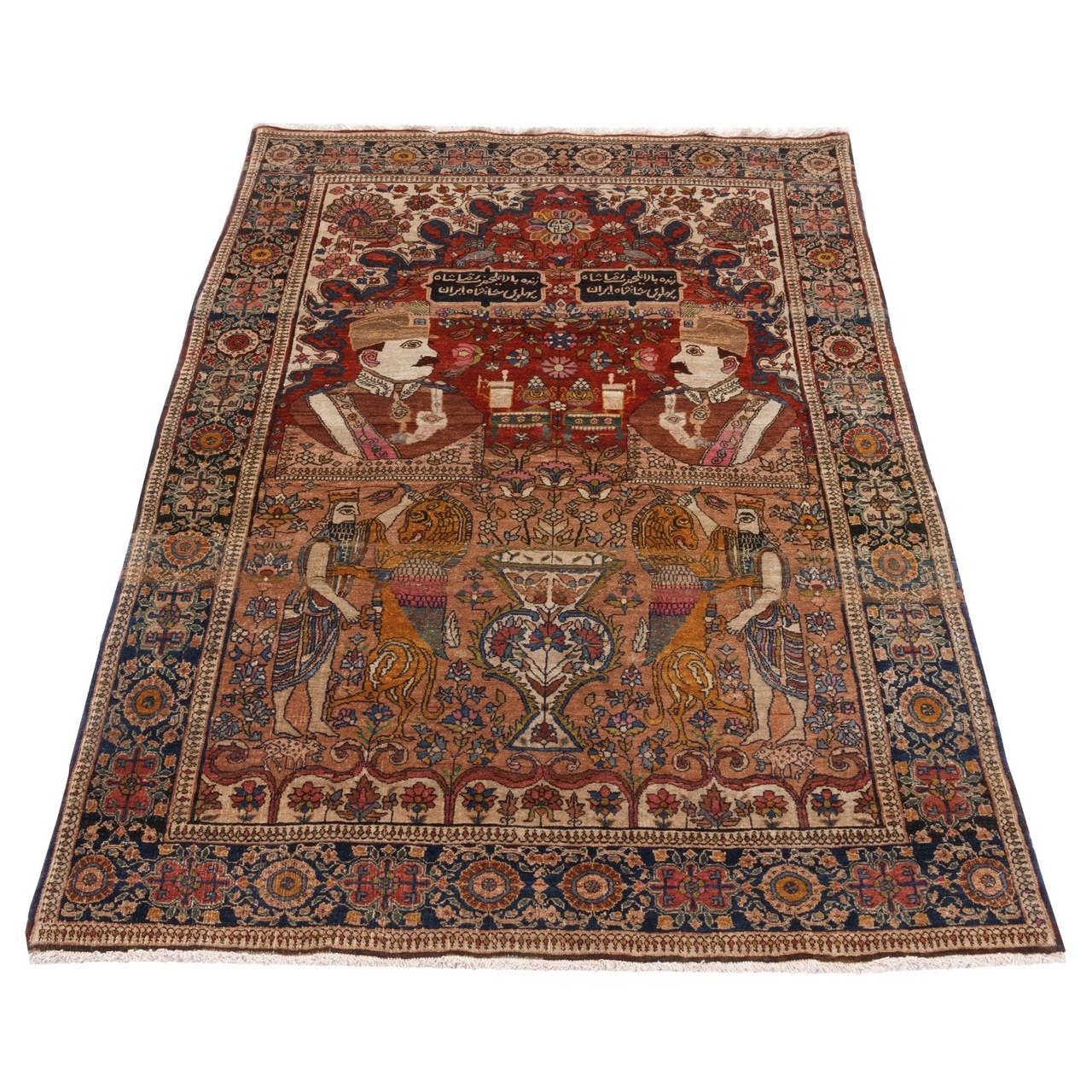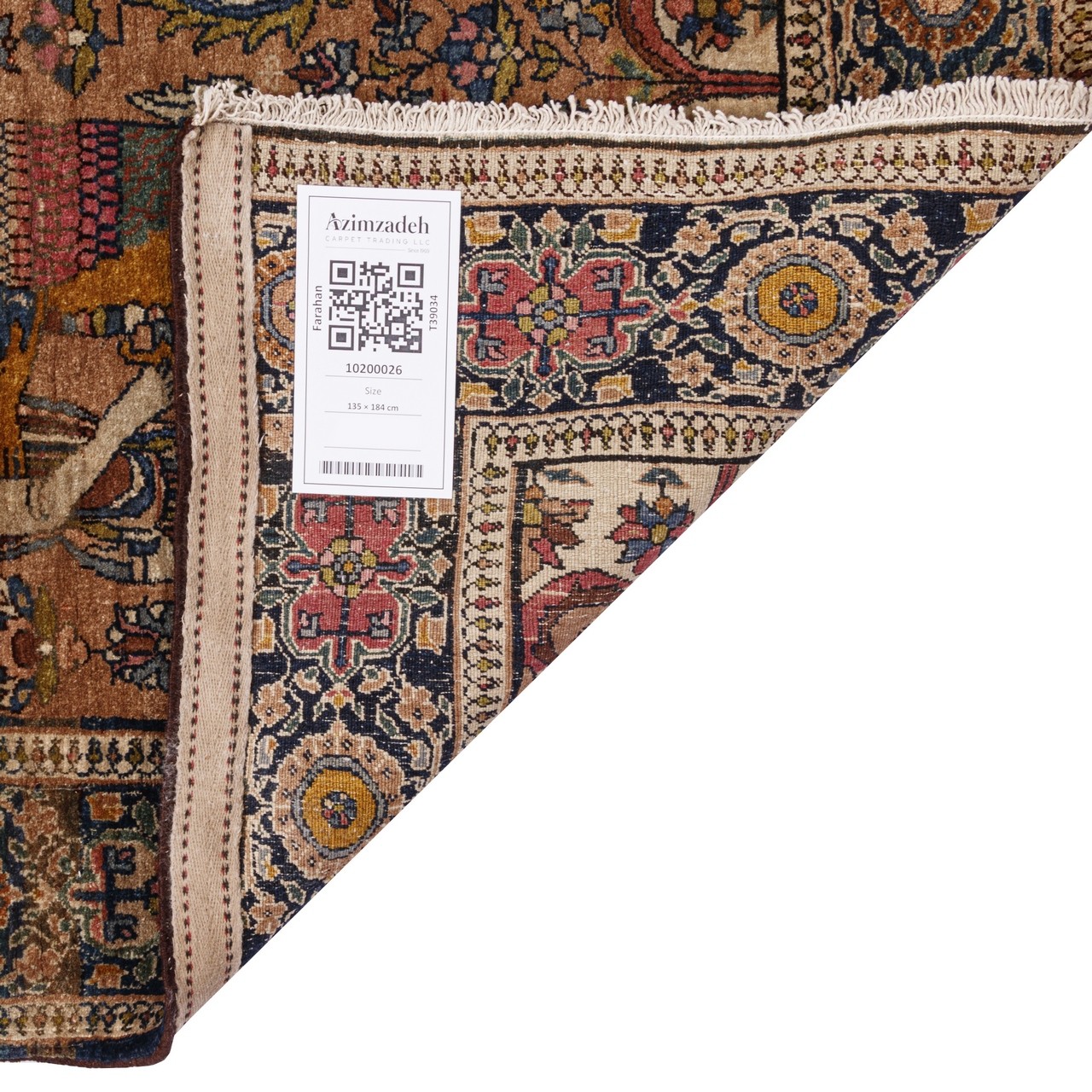 این فرش دستباف با طرح گلدانی و نقش تصویری ، تجسمی لطیف و خیالانگیز از پیوند طبیعت و هنر است؛ گلدانی پر گل که بر بستری از رنگهای الوان شکوفا شده و قصهای بیکلام از زندگی و شکوه روایت میکند. در بخش بالایی فرش، تصویر رضا شاه پهلوی، پادشاه معاصر ایران، با دقت و ظرافت به نقش درآمده است و در بخش پایینی، یکی از شاهان اسطورهای ایران، جمشید، در حال نبرد با جانوری افسانهای بازنمایی شده؛ صحنهای که الهامگرفته از نقشبرجستههای تختجمشید است و پیوندی ژرف میان تاریخ معاصر و اسطورههای باستانی ایران برقرار میکند. در فرشهای تصویری یا اسطورهای از دوره قاجار چهرهها و صحنههایی از شاهنامه بافته شدهاند. در میان این تابلوفرشها و فرشهای داستانی، جمشید گاه در حال نبرد، نشستن بر تخت زرین تخت طاوسمانند، یا در دست داشتن جام جهانبین تصویر شده است. در ابعاد ۱۳۵ × ۱۸۴ سانتیمتر با مساحت 2.49 مترمربع و با تراکم بافت ۴۰ رج، این فرش با بهرهگیری از پشم مرغوب و چله نخ، اثری ماندگار از هنر دست بافندگان فراهانی به شمار میرود. این تراکم رجشمار با حفظ اصالت طرح، حالتی گرم و صمیمی به آن میبخشد و برای فضاهایی با روح ایرانی یا دکور کلاسیک، انتخابی بینقص خواهد بود. رنگهای الوان زمینه در هماهنگی چشمنواز با حاشیهای به رنگ سرمهای، ساختاری متوازن و باشکوه را رقم زدهاند که گویی قالی را در قاب ارزشمندی جای دادهاند. این تضاد دلنشین، جذابیت بصری فرش را دوچندان کرده و آن را به اثری تزئینی و کاربردی بدل نموده است.