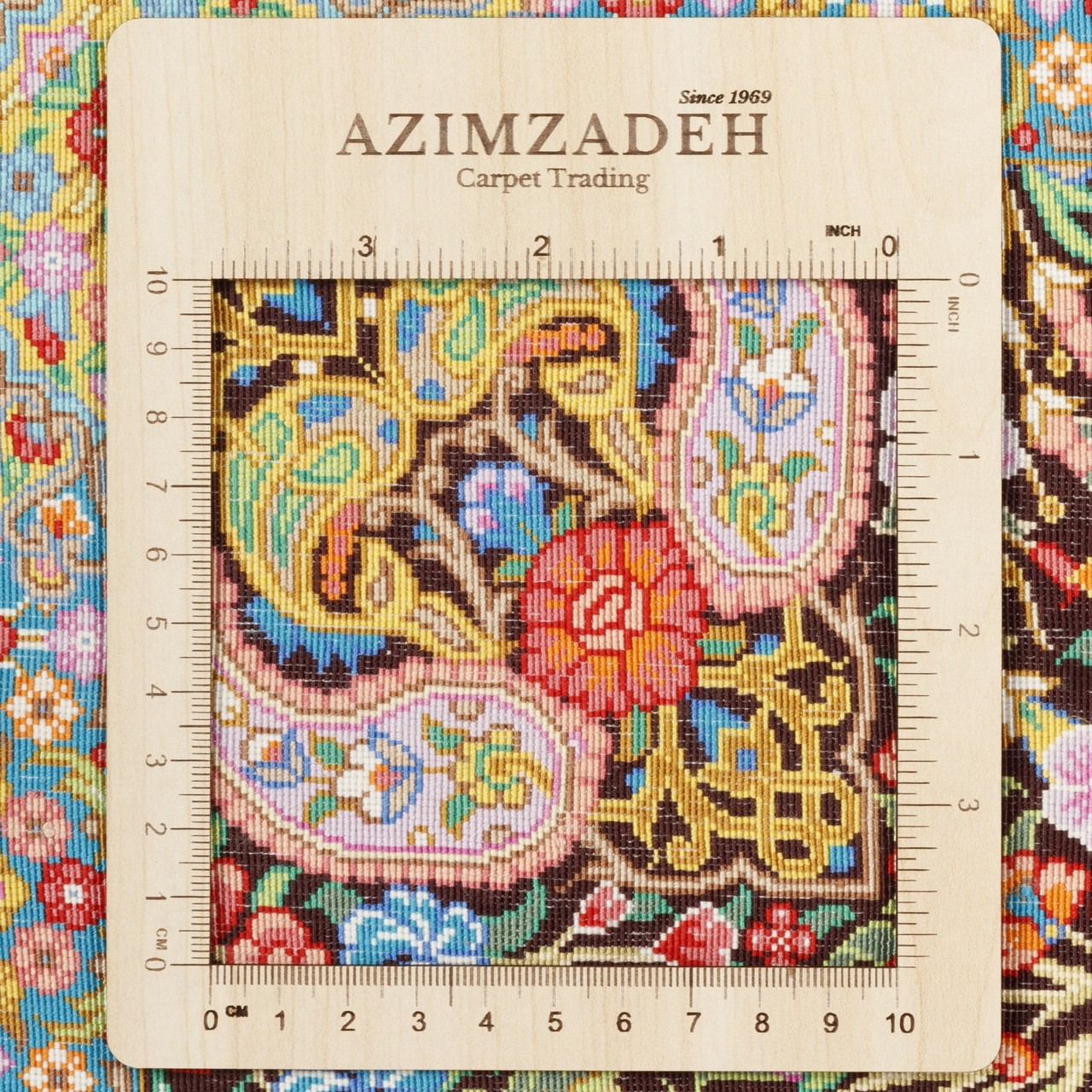 فرشی با طرح سراسر بافته شده که تبلور زیبایی، ظرافت و معنابخشی در قالب تار و پود ابریشم است. این فرش با ابعاد ۱۰۰ × ۱۵۰ سانتی‌متر و مساحت ۱.۵ مترمربع، تماماً از ابریشم بافته شده و با رجشمار ۷۰، جلوه‌ای از مهارت هنرمندان قم را به نمایش می‌گذارد. این فرش حاصل برند «عرب‌لو» است که با طرح سراسر و نقش بته، به‌گونه‌ای نو و تأمل‌برانگیز اجرا شده است؛ خاصه آنکه در مرکز فرش، تصویری بدیع و نمادین از بته‌جقه مادر و بچه به چشم می‌خورد. این نماد که در سنت ایرانی جلوه‌ای از زندگی، زایش و تداوم است، در میان انبوهی از نقش‌مایه‌های بته‌ای قرار گرفته و به قلب تپنده‌ی این باغ خیال بدل شده است. زمینه‌ی قهوه‌ای، عمق و گرمای خاصی به فرش می‌بخشد، در حالی که حاشیه‌ی آبی، آرامشی بصری و تعادلی هنرمندانه را به ترکیب رنگی آن می‌افزاید. این هماهنگی رنگ‌ها، با بافتی درخشان و ابریشمی، سبب شده تا فرش همچون تابلویی نفیس، در هر نور و زاویه‌ای جلوه‌ای تازه یابد.