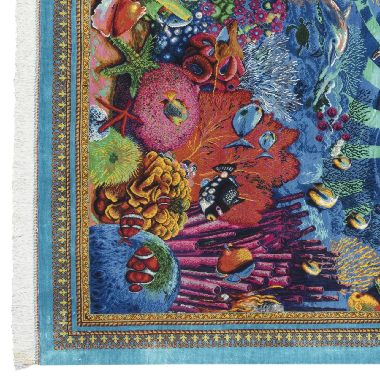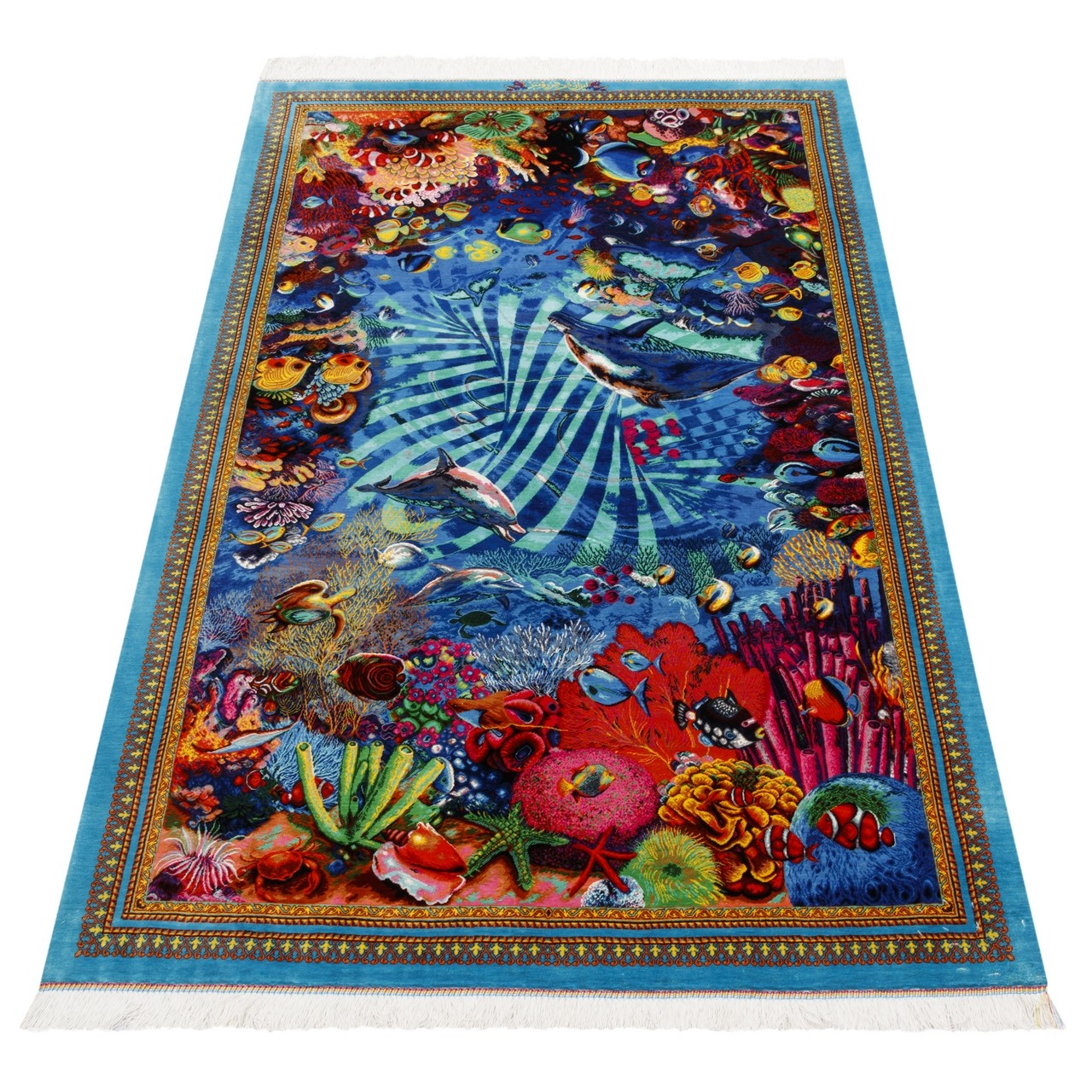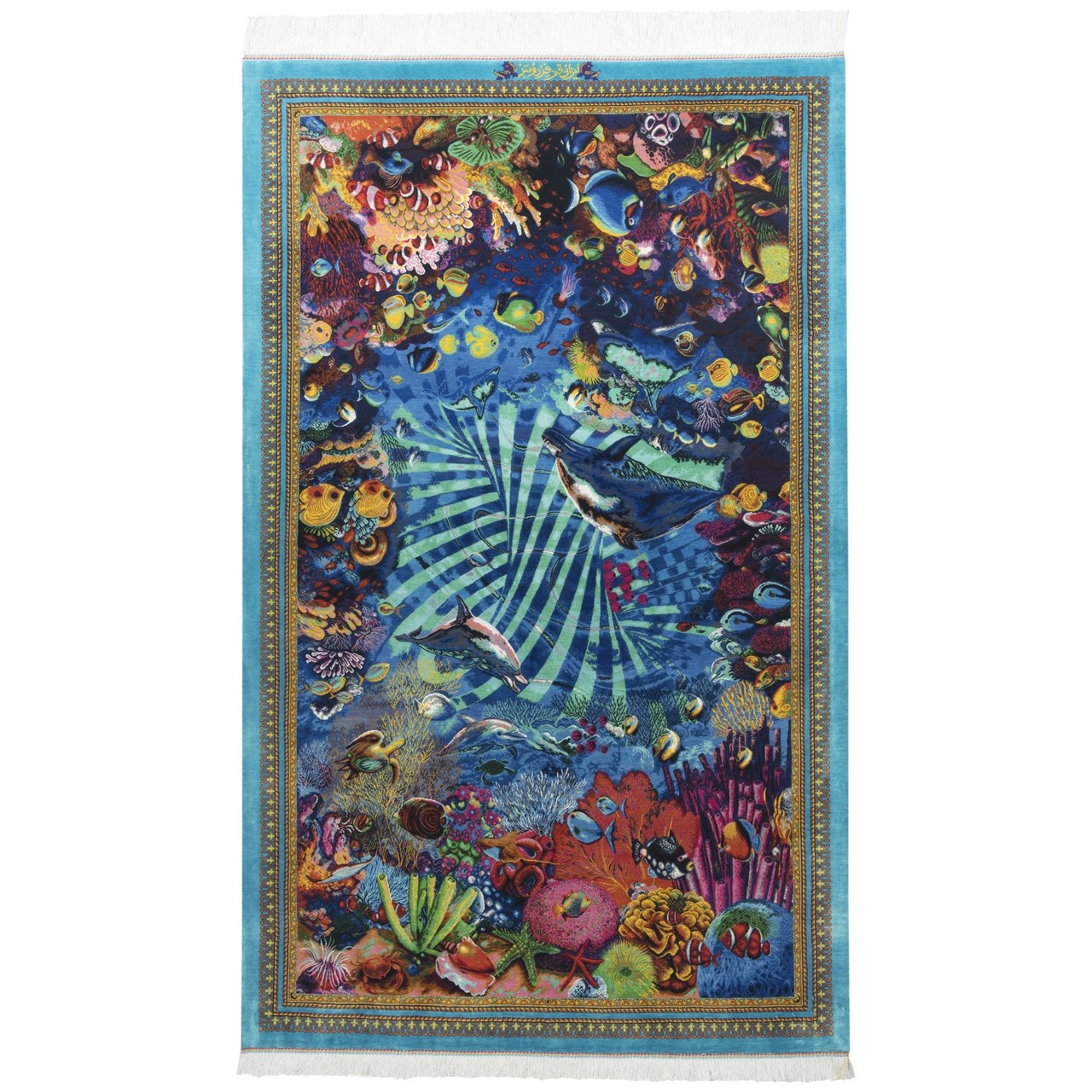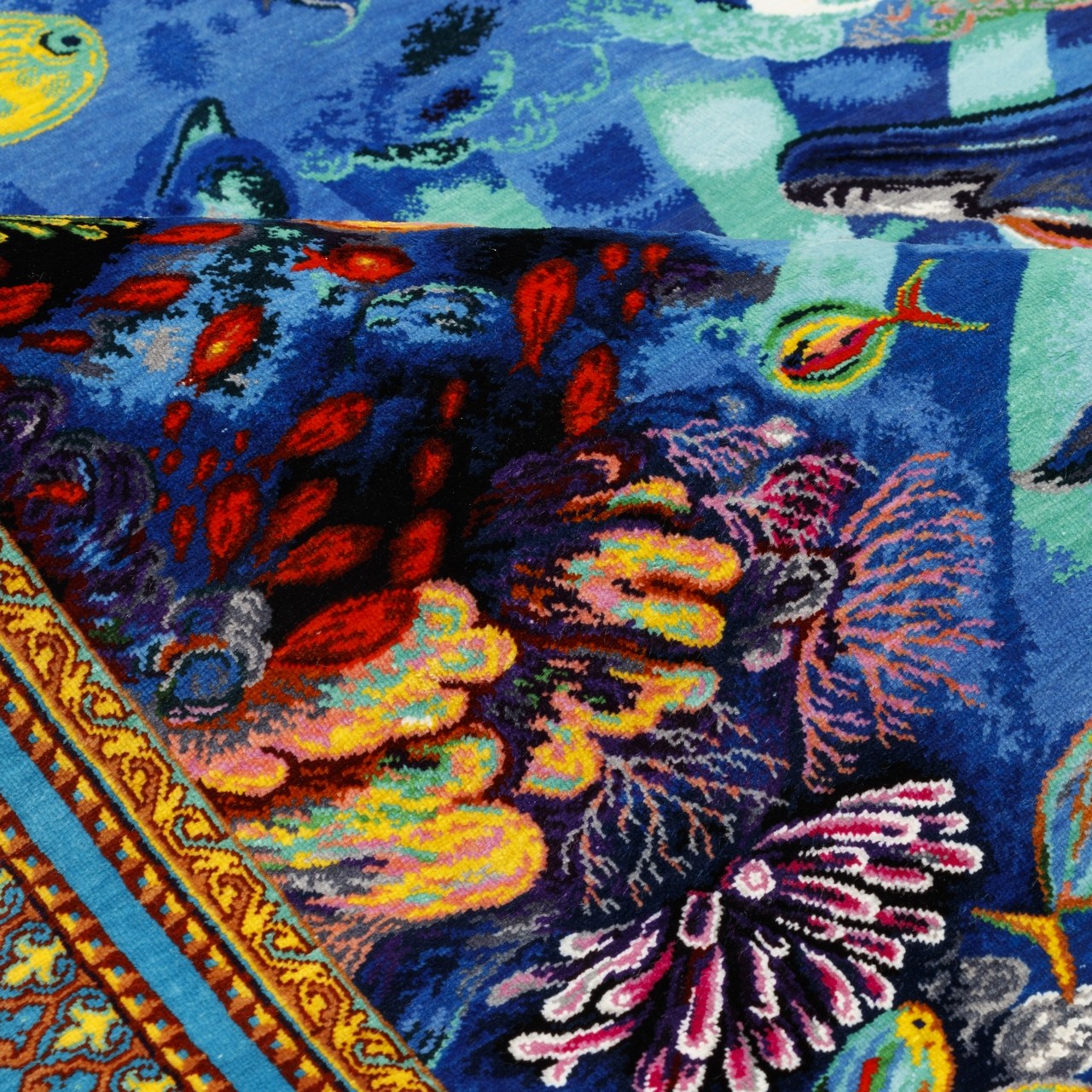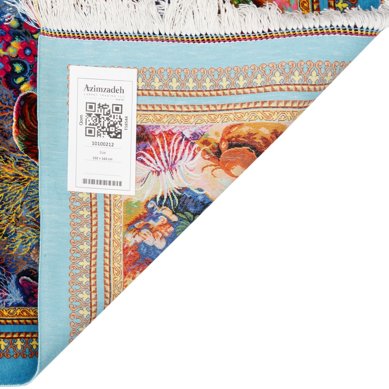 فرش دستبافت قم، با رجشمار ۷۵ که اوج مهارت و دقت بافندگان قمی را نشان می‌دهد. اثری به ابعاد ۱۰۲ × ۱۶۳ سانتی‌متر و مساحت ۱.۶۷ مترمربع که نه‌تنها یک فرش، بلکه تصویری هنری‌ست که به دست هنرمند خوش‌ذوق، قمی بافته شده است. این فرش با برند «فردوس» و نقشه‌ی آکواریوم، جلوه‌ای خیال‌انگیز از ژرفای دریا را در خود دارد؛ جهانی رنگین و پرتحرک، آکنده از ماهیان و گیاهان دریایی، که در بستری از رنگ آبی آرام و حاشیه‌هایی الوان، منظری چشم‌نواز و لطیف را به وجود آورده است. ترکیب رنگ‌ها با درخشش طبیعی ابریشم، در هر زاویه‌ای، نوری متفاوت را منعکس می‌کند و حس زنده بودن تصویر را دوچندان می‌سازد. این فرش تمام‌ابریشم تصویری، آمیخته‌ای از ظرافت، خیال و جاودانگی‌ست.