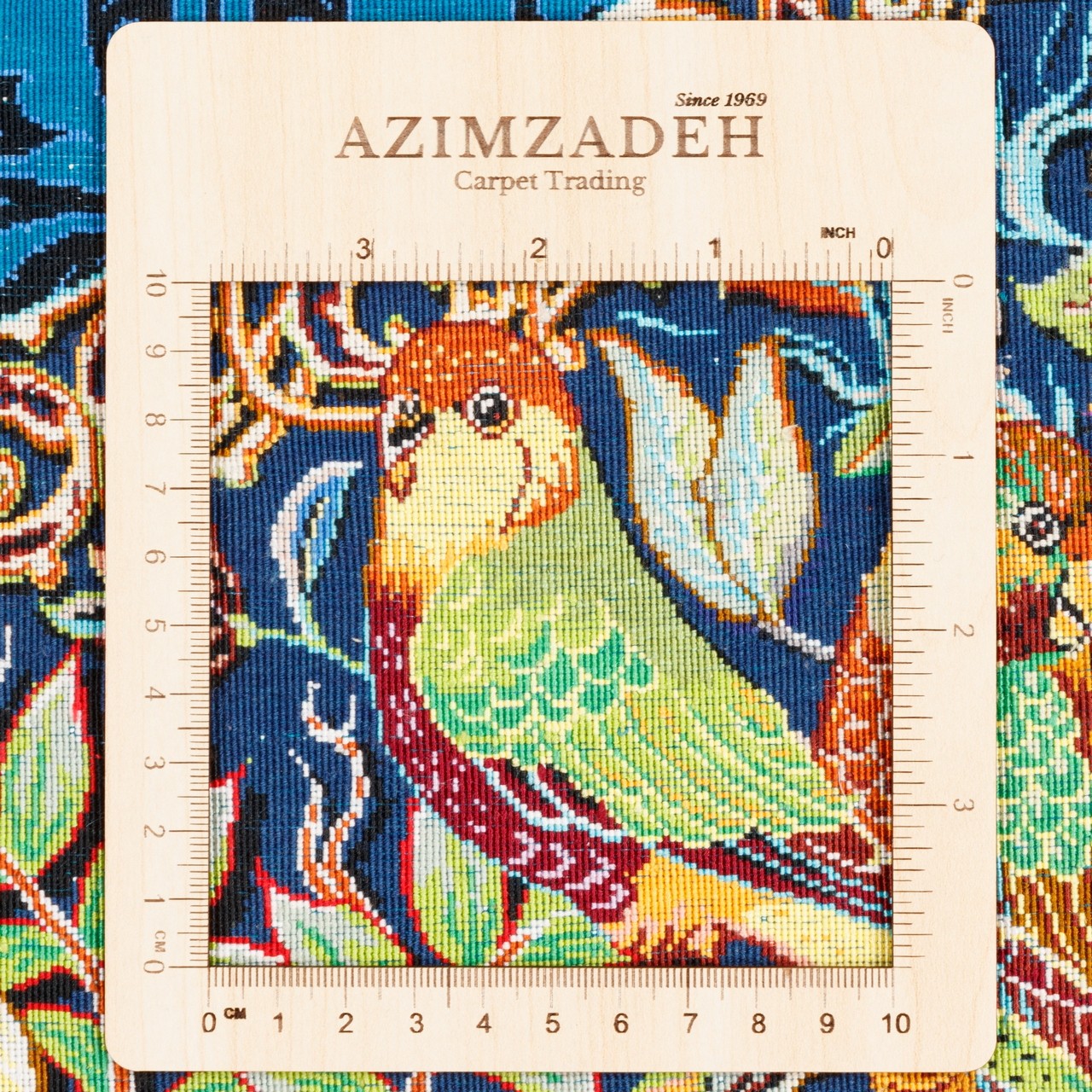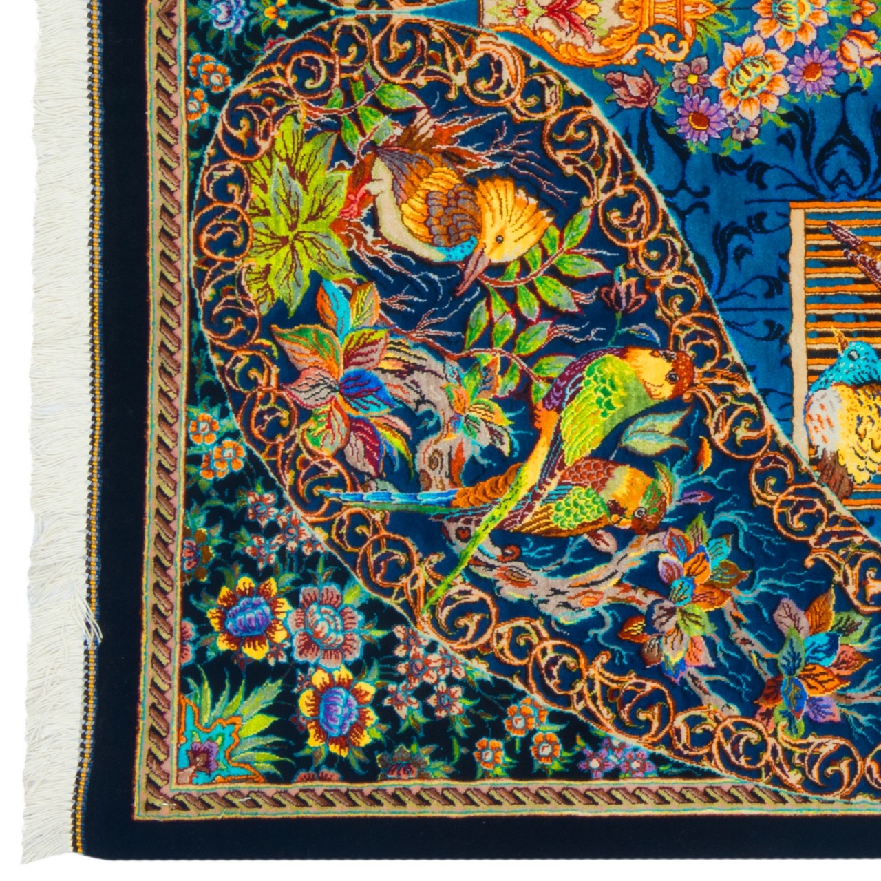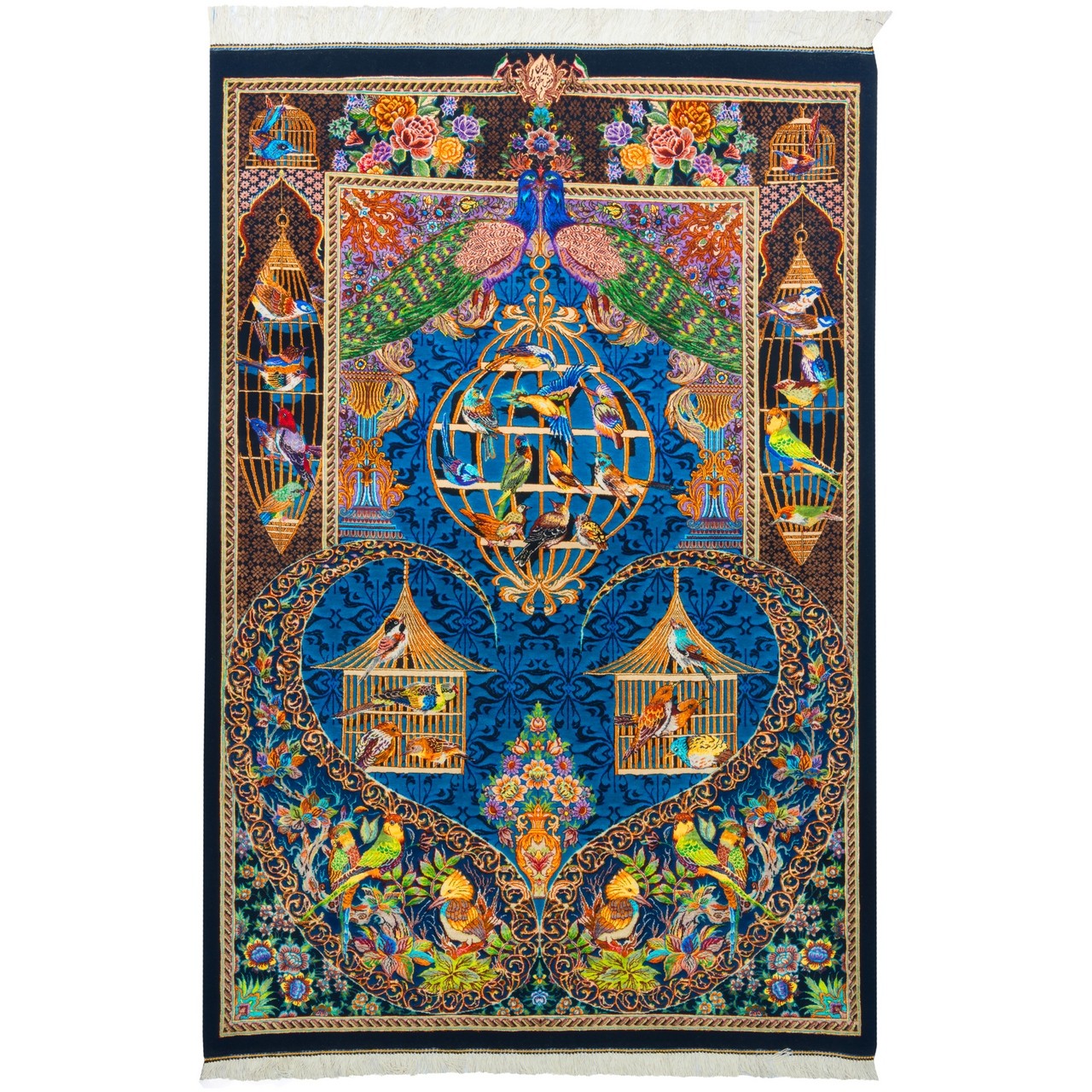 این فرش دستبافت قم با اندازه ۹۸ × ۱۴۵ سانتی‌متر و مساحتی برابر با ۱٫۴۳ مترمربع، نمونه‌ای از فرش‌های هنری و فاخر ابریشمی است که نه برای قدم‌زدن، بلکه برای تحسین و تماشا توسط برند حکمتی راد خلق شده‌ است. طرح سراسر با نقش پرنده، تداعی‌گر پرواز خیال و آزادی روح است؛ در بالای زمینه‌ی فرش، دو طاووس زیبا و متقارن با پرهای باز نشسته‌اند. طاووس در هنر ایرانی اغلب نماد زیبایی و جاودانگی است. مرکز تصویر و نواحی اطراف آن پر از قفس‌هایی با پرندگان متنوع همانند؛ طوطی، بلبل و...است. این فرش با رجشمار ۷۰ بافته شده است و نشانه‌ای روشن از ریزبافتی و مهارت فوق‌العاده‌ی بافنده‌ دارد. حاشیه‌ی سرمه‌ای با عمق رنگی خاص خود، این آرامش را در قاب زمان نگه می‌دارد و کنتراستی موزون با زمینه‌ی آبی پدید می‌آورد. جنس تمام ابریشم، لطافت و درخشش خاصی به اثر بخشیده است. این فرش با طراحی خلاقانه، ریزبافتی خیره‌کننده و مفهوم معنوی نهفته در نقش پرندگان، انتخابی بی‌بدیل برای علاقه‌مندان به فرش دستبافت است.