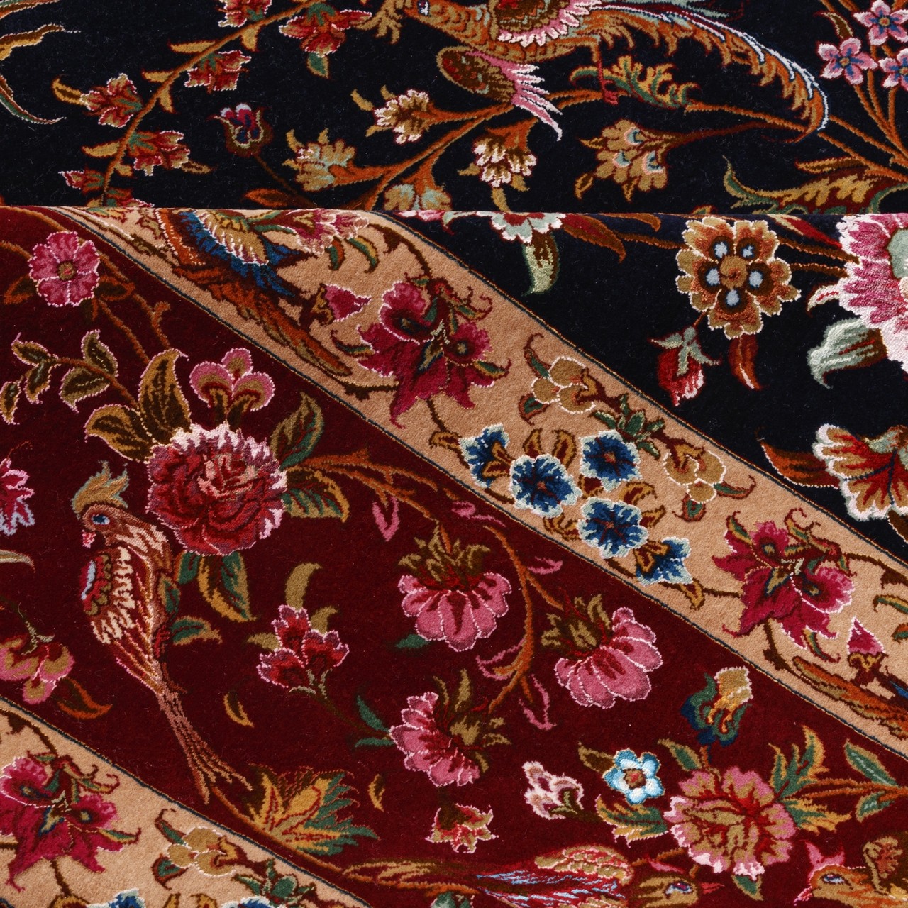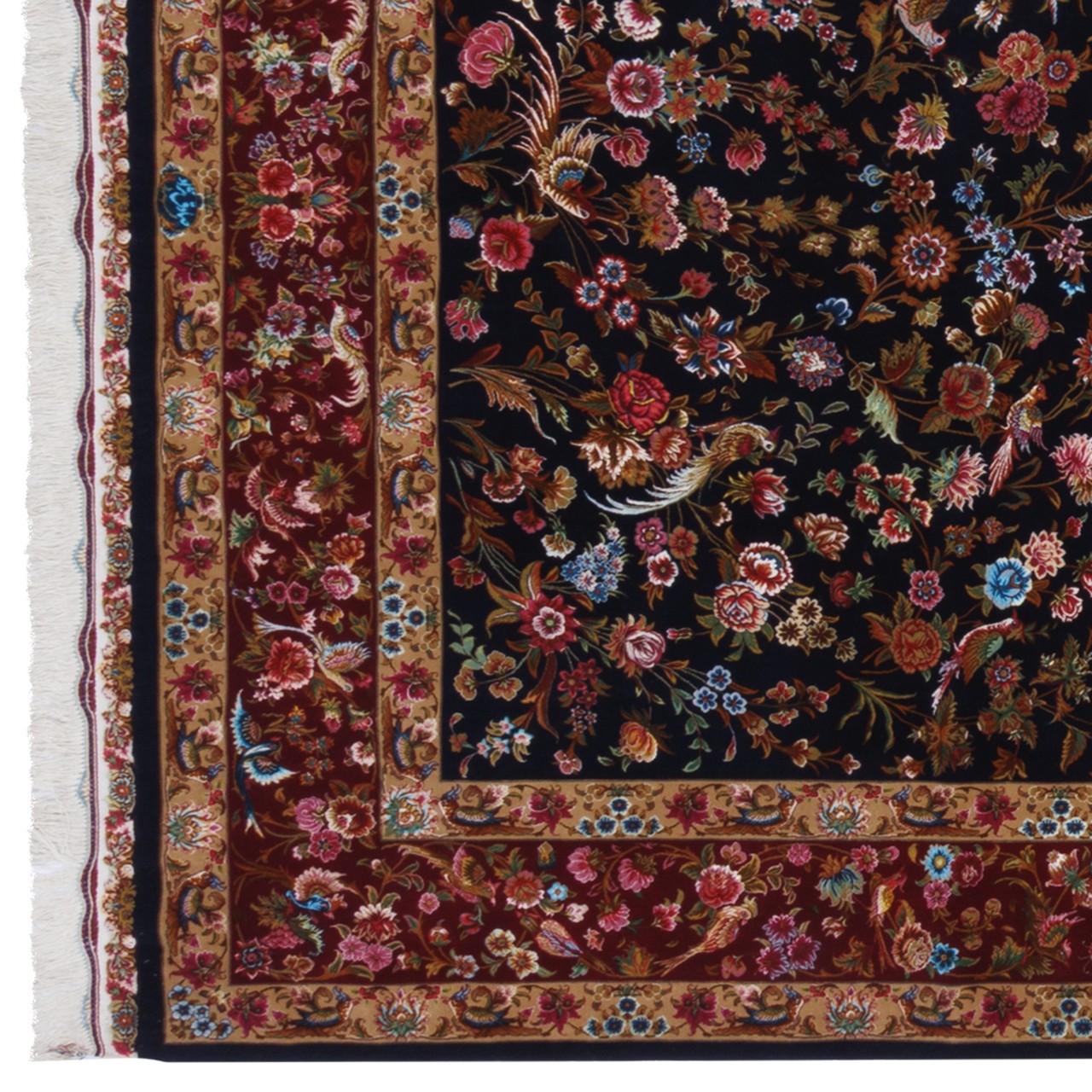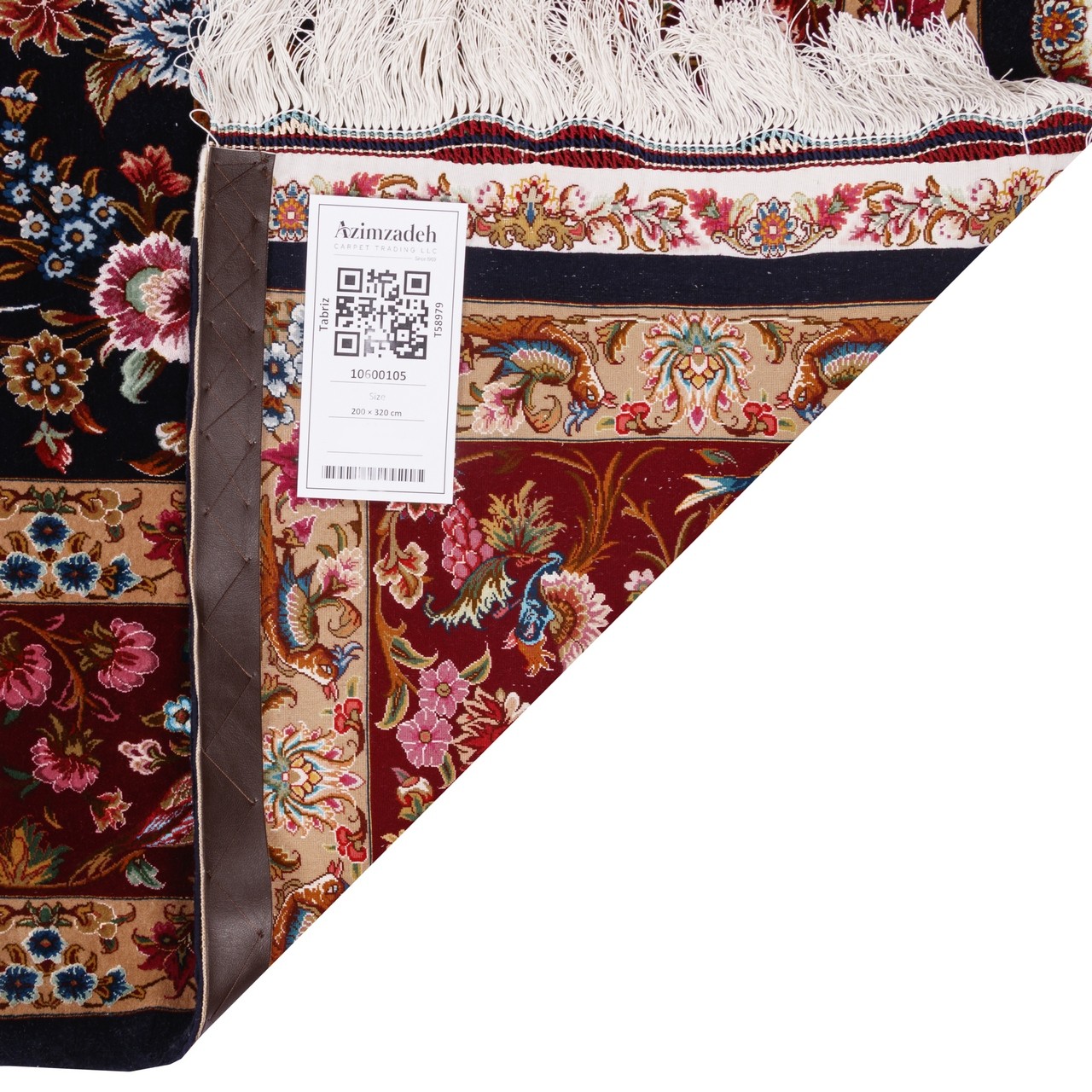 این فرش دستباف سراسر تبریز، با ابعاد ۲۰۰ × ۳۲۰ سانتی‌متر و مساحت ۶.۴ متر مربع و حاصل برند «صادق‌نژاد»، جلوه‌ای متمایز از ظرافت و شکوه شرقی در خود دارد. فرش با رجشمار 75، جنس آن از گل ابریشم و چله‌ی ابریشم است؛ ترکیبی که هم لطافت و درخشش بی‌بدیل ابریشم را در تار و پود آن جاری ساخته، هم انسجام و دوام را در بلندمدت تضمین می‌کند. رنگ زمینه‌ی مشکی عمیق در این اثر، همانند بومی تاریک برای بروز شکوفه‌های رنگارنگ است و تضاد خیره‌کننده‌ای با حاشیه‌ی لاکی به‌وجود می‌آورد که چشم را به بازی می‌گیرد و ذهن را به رویا می‌کشاند. طرح این فرش بیانگر نهایت ظرافت در بافت است؛ گره‌هایی بسیار ریز که با دقتی مثال‌زدنی در کنار هم نشسته‌اند و جزییاتی شگفت‌انگیز از گل‌ها، برگ‌ها و پیچ‌وتاب‌های هنرمندانه را پدید آورده‌اند.