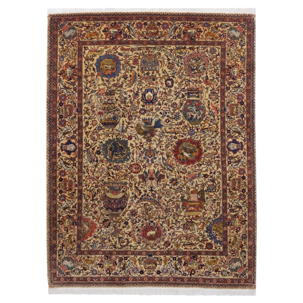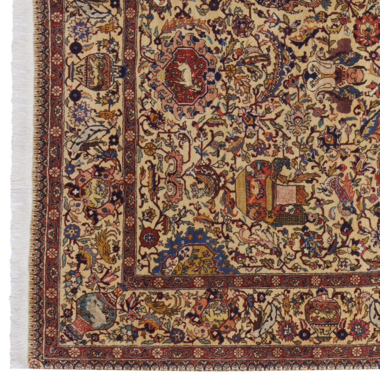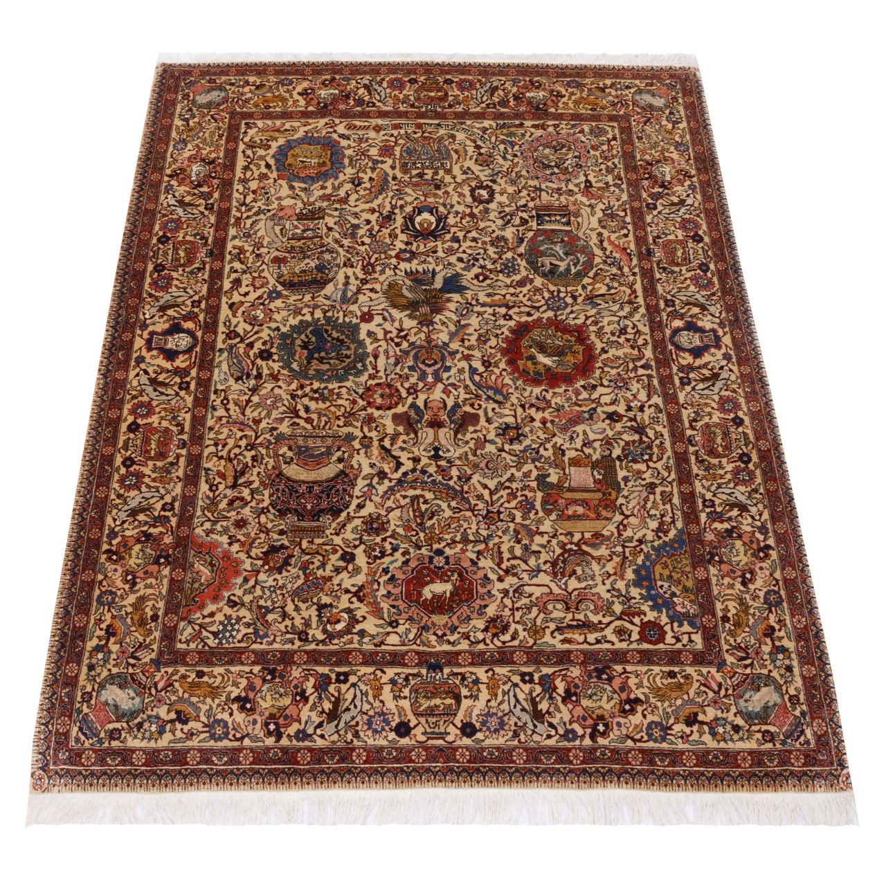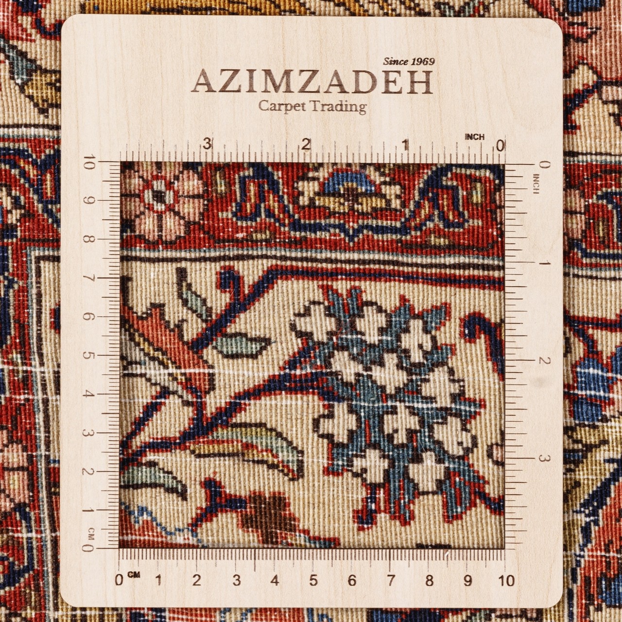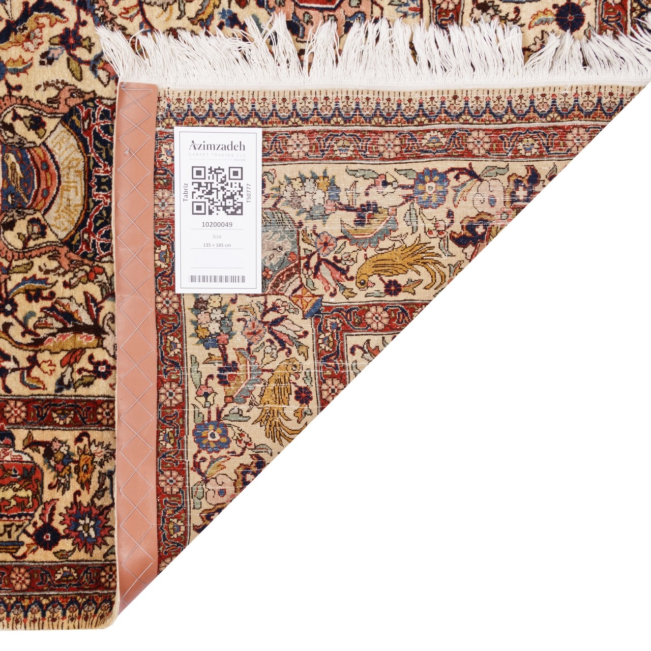این فرش با طرح سراسر تبریز با ۱۳۵× ۱۸۵ سانتی‌متر و مساحت ۲.۵ مترمربع، برای فضاهایی با ابعاد متوسط طراحی شده و می‌تواند به‌تنهایی مرکز توجه هر اتاقی باشد. رنگ زمینه و حاشیه‌ی کرم، ترکیبی لطیف و هماهنگ پدید آورده‌اند که آرامش بصری و هارمونی رنگی را به محیط القا می‌کند. گره‌خوردگی‌های منظم با رجشمار ۵۵، گواهی‌ست بر ظرافت و مهارت بافنده‌. استفاده از پشم مرغوب در بافت و چله‌ی نخ پنبه‌ای، هم دوام و استحکام فرش را تضمین کرده و هم به آن نرمی و لطافتی دل‌نشین بخشیده است. نقش زیرخاکی در فرش ایرانی، به دسته‌ای از نقش‌مایه‌ها اطلاق می‌شود که الهام‌گرفته از نقوش کشف‌شده در آثار باستانی، سفالینه‌ها، سنگ‌نگاره‌ها، و اشیای تاریخی مدفون‌شده در لایه‌های زمین هستند. این نقوش ریشه در تمدن‌های باستانی ایران دارند. نقش زیرخاکی که از کهنگیِ باشکوه و زیبایی نهفته در گذشته الهام گرفته، در این فرش با بیانی نوین و متعادل حضور یافته است؛ گویی روایت‌هایی فراموش‌شده را از زیر خاک زمان بیرون کشیده‌اند و در قالب این اثر هنری، بازآفرینی کرده‌اند.