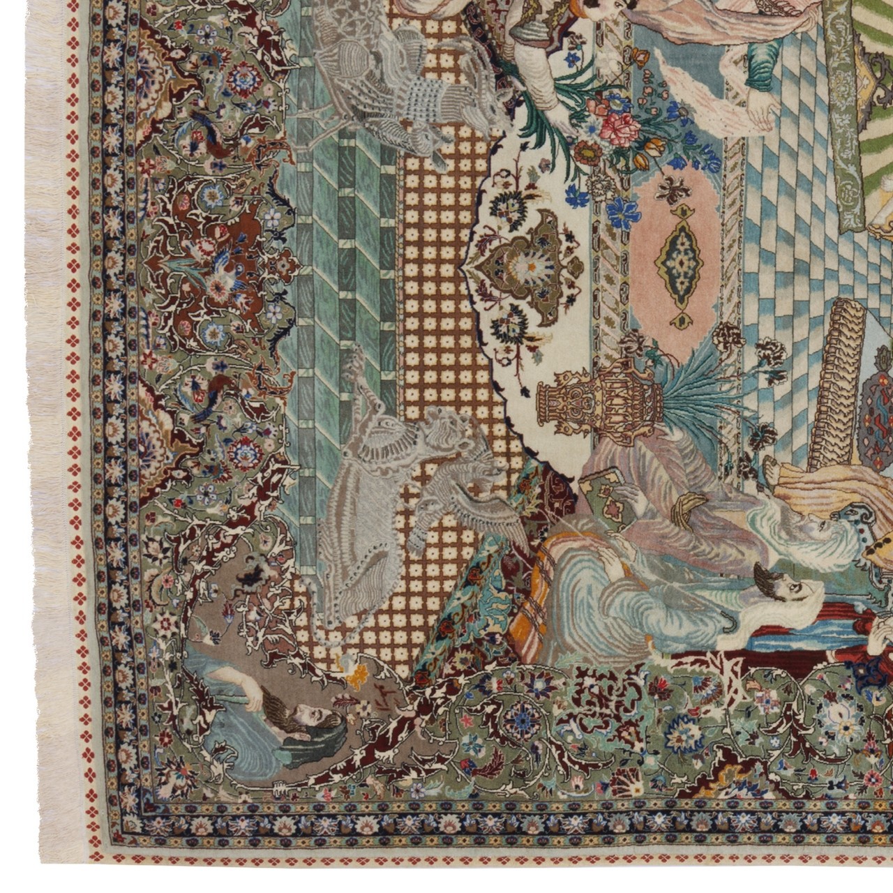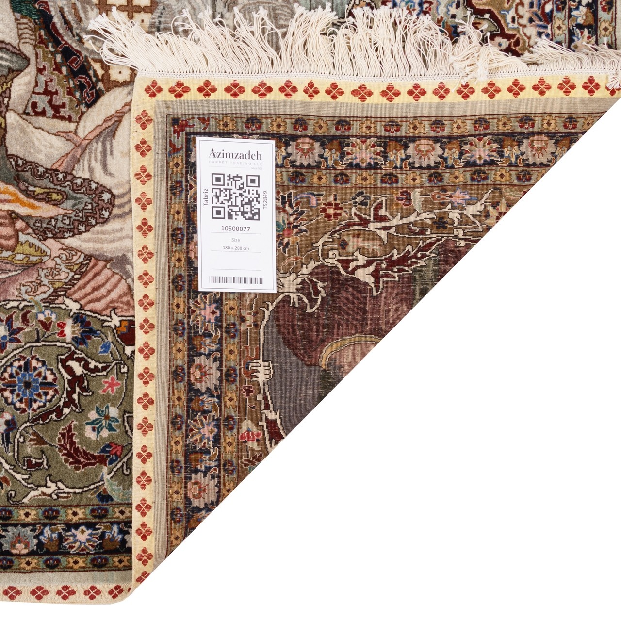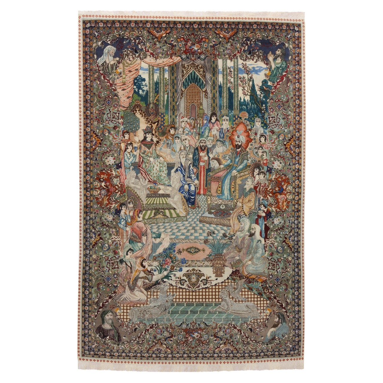 این فرش دستباف با طرح سراسر تصویری و بافت تبریز که نه‌تنها بازتابی از مهارت استادان بافنده بلکه روایتی تصویری از اسطوره‌ها، تاریخ و ذهن خلاق یک ملت است. ابعاد ۱۸۰ × ۲۸۰ سانتی‌متر، آن را مناسب برای فضاهایی فاخر و هنرمندانه می‌سازد؛ این اثر نفیس با ریزبافتی ۵۵ رج، در زمره‌ی فرش‌های ظریف و پرجزئیات قرار می‌گیرد که هر گره آن چون ضرب‌آهنگی دقیق، هماهنگ و آگاهانه بر تار و پود نشسته است. این فرش صحنه‌ای را به تصویر می‌کشد که داستان رویارویی «حضرت سلیمان» و «بلقیس» است که در متون با نام ملکه سبا نیز شناخته می‌شود. با چهره‌های متعدد در لباس‌های فاخر و آراسته و بهره‌گیری رنگ‌های متنوع در متن و حاشیه که ترکیبی بصری منتهی شده که نه‌تنها چشم‌نواز است، بلکه گویی تابلویی از اندیشه و احساس را پیش چشم مخاطب می‌گشاید. در چهارگوشه فرش نیز چهره شخصیت‌های برجسته‌ای همچون «حضرت داود»، «لقمان حکیم»، «ارسطو» و «سقراط» به چشم می‌خورد. بی‌تردید این اثر، نه‌تنها زینت‌بخش خانه‌ای باشکوه، بلکه گنجینه‌ای ارزشمند در مجموعه‌ای هنری خواهد بود.