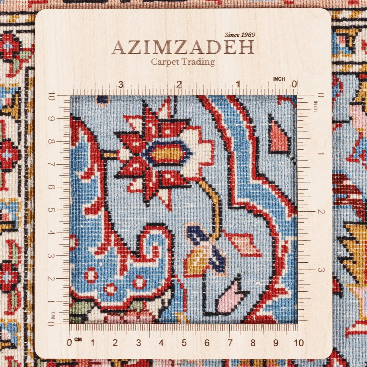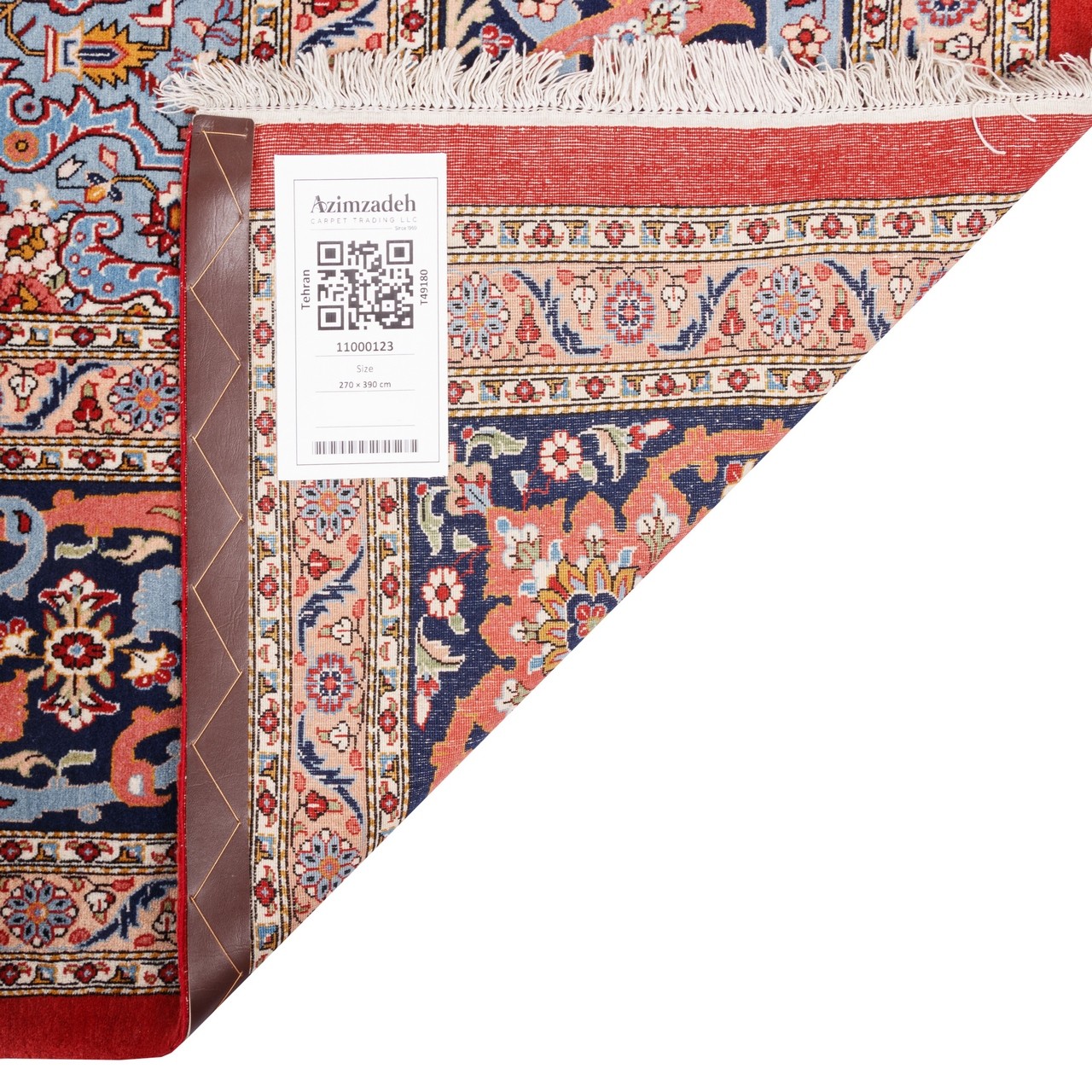 این فرش دستباف با طرح سراسر، نمونه‌ای از مهارت قالیبافان تهرانی‌ست؛ اثری در ابعاد ۲۷۰ × ۳۹۰ سانتی‌متر و مساحتی معادل ۱۰.۵۳ مترمربع، که هویتی اصیل به هر فضایی می‌بخشد. طرح سراسر با نقوش گل‌دار، در این فرش، با گل‌های به‌هم‌پیوسته و زنجیروار، نمایان‌گر مفهومی بی‌وقفه از زندگی، شکوفایی و تعادل است. این هماهنگی بی‌مرز، بیننده را در دنیایی از لطافت و نظم فرو می‌برد؛ گویی هر گل بخشی از شعری تصویری‌ست که بر زمینه‌ای آبی‌ رنگ، آرام گرفته است. رجشمار ۵۰ این فرش نشان از ظرافت و کیفیت آن است. رنگ آبیِ زمینه، با حاشیه‌ی سرمه‌ای عمیق، ترکیبی کلاسیک و در عین حال شیک پدید آورده؛ ترکیبی که احساس آرامش، وقار و عمق را توأمان به فضای اطراف منتقل می‌کند. همچنین استفاده از پشم با کیفیت بالا در متن و نخ پنبه‌ای مقاوم در چله، سبب شده تا فرش از نظر نرمی و ماندگاری در سطحی ممتاز قرار گیرد.