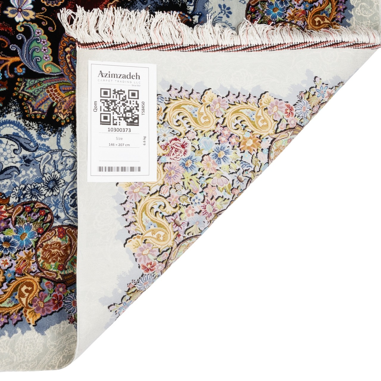 این فرش دستباف قم با ابعاد ۱۴۶ × ۲۰۷ سانتی‌متر و مساحت ۳.۰۳ متر مربع با طرح لچک ترنج بافته شده است. رجشمار فرش 75 است و با برند «کفاش‌زاده» تولید شده است. نمونه‌ای فاخر از هنر قالیبافی در قم است. ترنج مرکزی در میان زمینه‌ی مشکی عمیق و براق با نقش بته‌هایی ظریف و کشیده در لچک‌ها و حاشیه‌ها خلق شده است. رنگ زمینه‌ی مشکی، به زیبایی با رنگ‌های الوان حاشیه ترکیب شده و تضادی چشم‌نواز را به وجود آورده است. جنس تمام ابریشم این فرش، نه‌تنها به آن درخششی خاص و سطحی لطیف بخشیده، بلکه لمس آن را نیز به تجربه‌ای حسی و لطیف تبدیل کرده است. این فرش انتخابی ایده‌آل برای کلکسیونرها، فضاهای رسمی و خانه‌هایی است که به اصالت ارج می‌نهند.