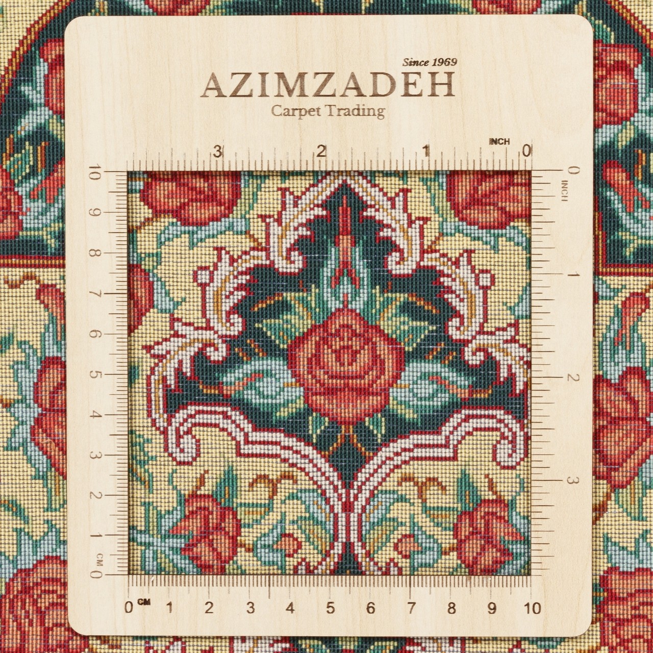فرش دستباف قم در ابعاد دقیق ۸۰ × ۵۳ سانتی‌متر، با مساحتی برابر با ۰.۴۳ مترمربع بافته شده است. این فرش با برند «ذبیحی» و طرح لچک ترنج در شهری که برای بافت فرش‌های ابریشمی پر آوازه است، تولید شده. فرش تمام ابریشم و با رجشمار ۷۰ است. نقش‌مایه لچک‌ ترنج در این فرش، با طرح گلدار همچون گل‌های رُز قرمز که در سرتاسر فرش به چشم می‌خورد همراه شده است. رنگ نخودی زمینه با حاشیه یشمی به‌گونه‌ای انتخاب شده که هارمونی رنگی در عین اصالت، حسی آرامش‌بخش و دل‌نشین به فضا می‌بخشد.