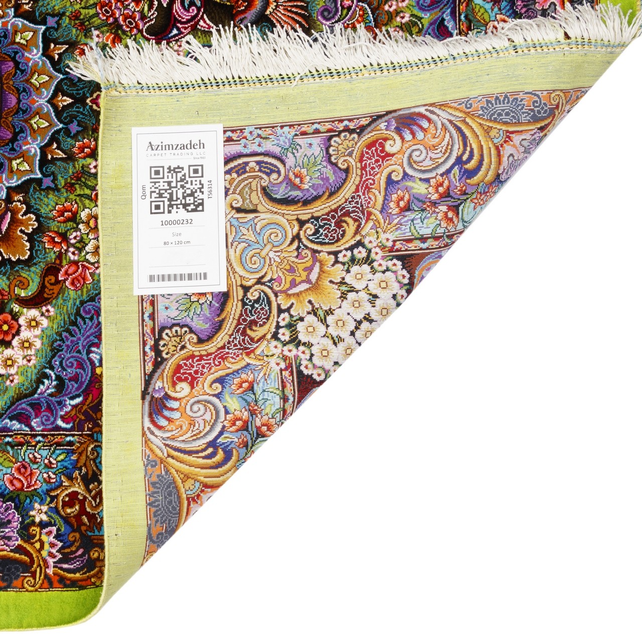 فرش دستباف با طرح لچک ترنج قم با ابعاد ۱۲۰ × ۸۰ سانتی‌متر و مساحتی در حدود ۰.۹۶ متر مربع بافته شده است. این فرش با برند «حسین محمدی» و رجشمار ظریف ۷۰ تماماً از ابریشم ناب بافته شده و نمادی از دقت، ظرافت و هنر قالیبافی ایرانی‌ست. طرح لچک ترنج در این اثر، با نقش‌های گلدار به سبکی لطیف و در عین حال پرشکوه آراسته شده است. ترنج میانی با لچک‌هایی موزون و گل‌هایی رقصان، ترکیبی چشم‌نواز خلق کرده است. رنگ زمینه‌ی الوان، جلوه‌ای پویاتر و غنی‌تر به فرش بخشیده و طیف رنگ‌های گرم و سرد را در هارمونی‌ای متعادل به تصویر می‌کشد. حاشیه‌ی سبز فسفری، با درخشش خاص خود، چنان قاب زرینی‌ست که بر ارزش بصری آن می‌افزاید. .
